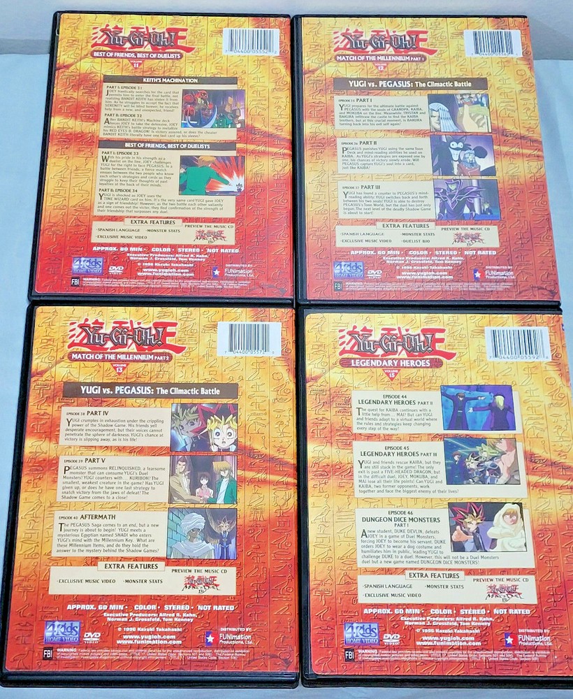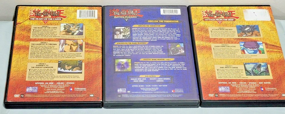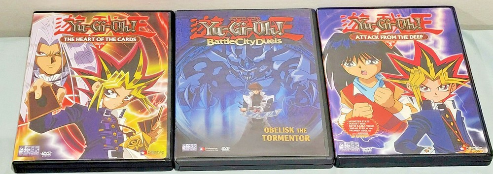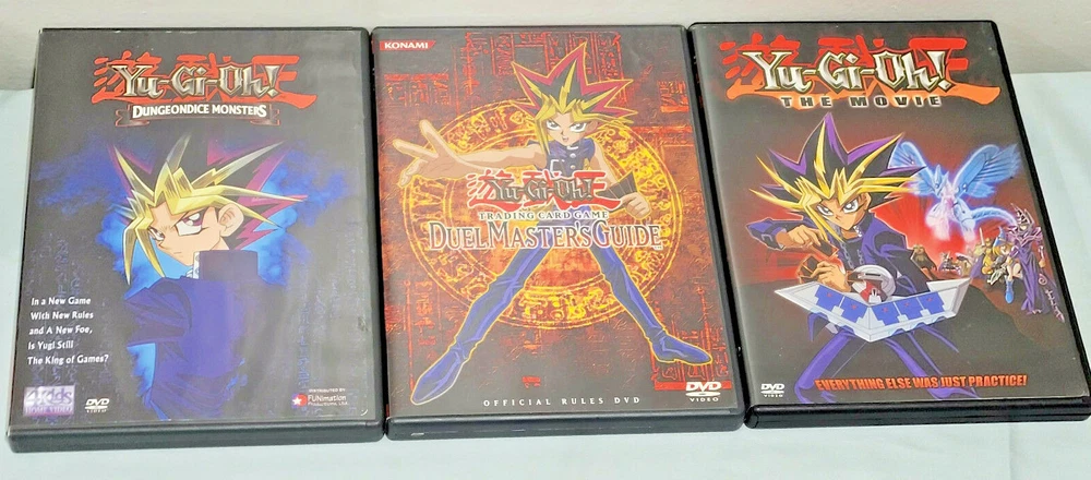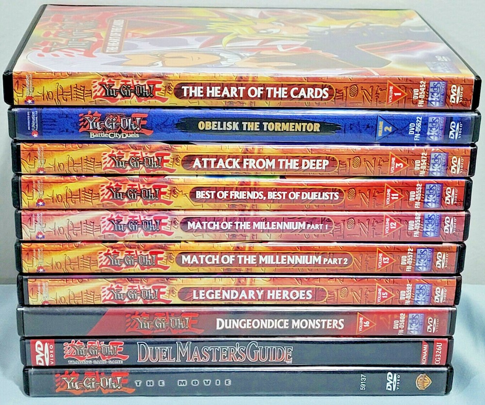 [INTERNAL NOTE: Bin DVD lot shelf] /*-*/ Up for your consideration is the following item / grouping of items: \*-*\ ITEM: 10 Lot Yu-Gi-Oh! YuGiOh DVDs Vol 1, 3, 11-13, 15, 16, Movie, Duel Master's Guide ABOUT THE ITEM: Item comes from a well kept, clean adult household, pet and smoke free. ALL WORK AS THEY SHOULD! :) DVD's condition varies from like new to moderately/heavily played. MOST are nice & clean, but with any item handled by children, some may show expected signs of wear, scratches, non-perfect cover art, etc. The first photo is of all DVDs and the remaining are closeups. Lot includes: Yu-Gi-Oh! The Heart of the Cards (Volume 1) Yu-Gi-Oh! Battle City Duels - Obelisk the Tormentor (Volume 2) Yu-Gi-Oh! Attack From the Deep (Volume 3) Yu-Gi-Oh! Best of Friends, Best of Duelists (Volume 11) Yu-Gi-Oh! Match of the Millennium Part 1 (Volume 12) Yu-Gi-Oh! Match of the Millennium Part 2 (Volume 13) Yu-Gi-Oh! Legendary Heroes (Volume 15) Yu-Gi-Oh! Dungeondice Monsters (Volume 16) Yu-Gi-Oh! Duel Master's Guide Yu-Gi-Oh! THE MOVIE Each item that I list for sale is: 1) Carefully inspected 2) Listed w/ full disclosure 3) Packed with the utmost care ***** LOW LOW SHIPPING COSTS (SOMETIMES FREE, SEE LISTING!), ***** ***** NEVER A HANDLING FEE! ***** ***** NO RESERVE! :) *****