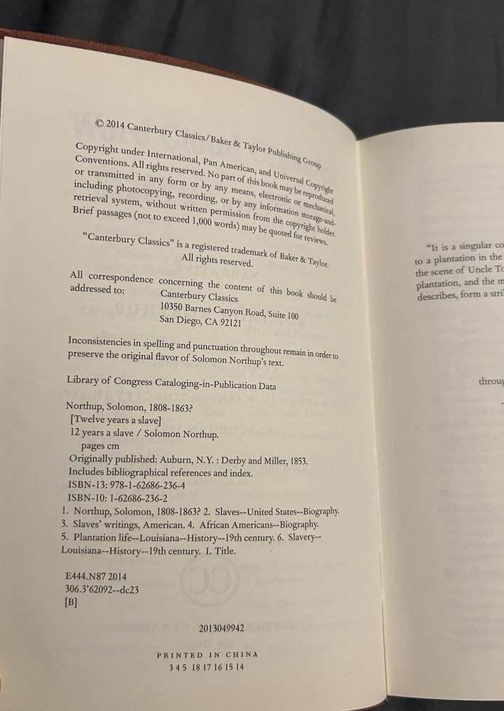 Like new copy of 12 Years a Slave by Solomon Northup. This is a 2014 Canterbury Classics leather-bound edition. Really unique and great quality book. Will be accepting offers. Returns are not accepted...