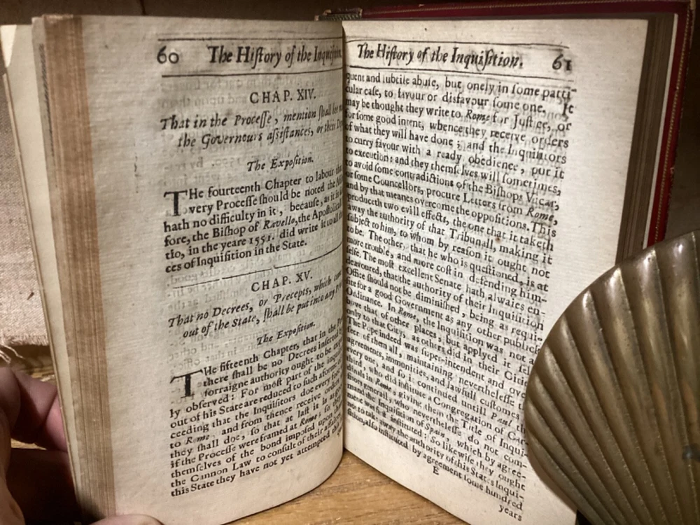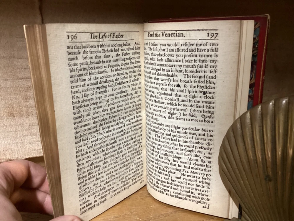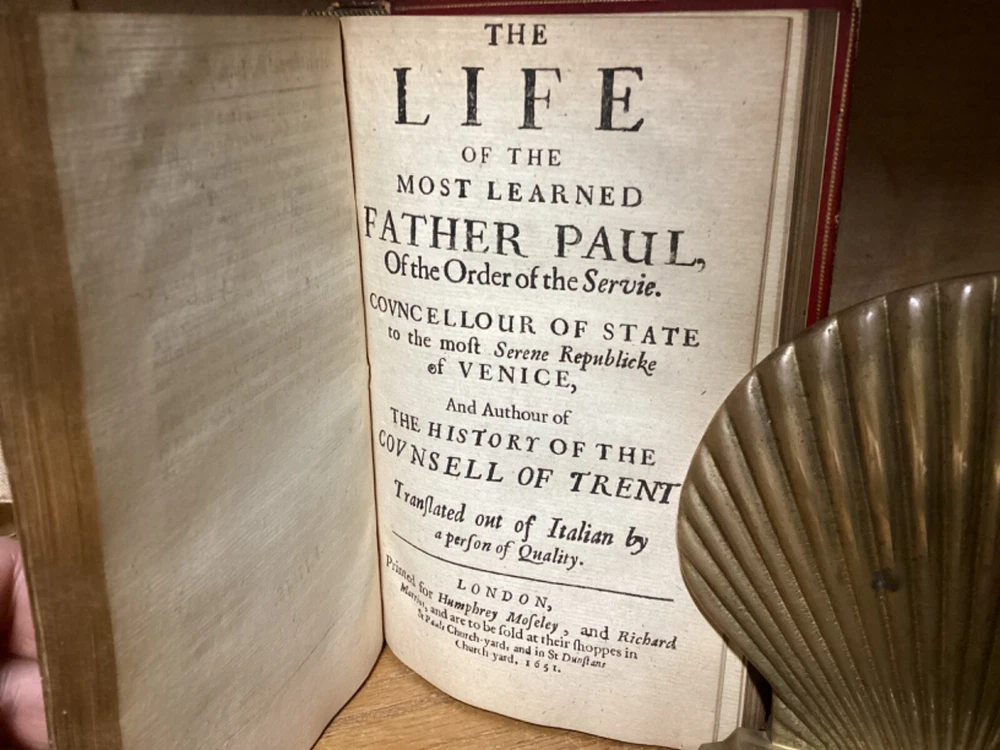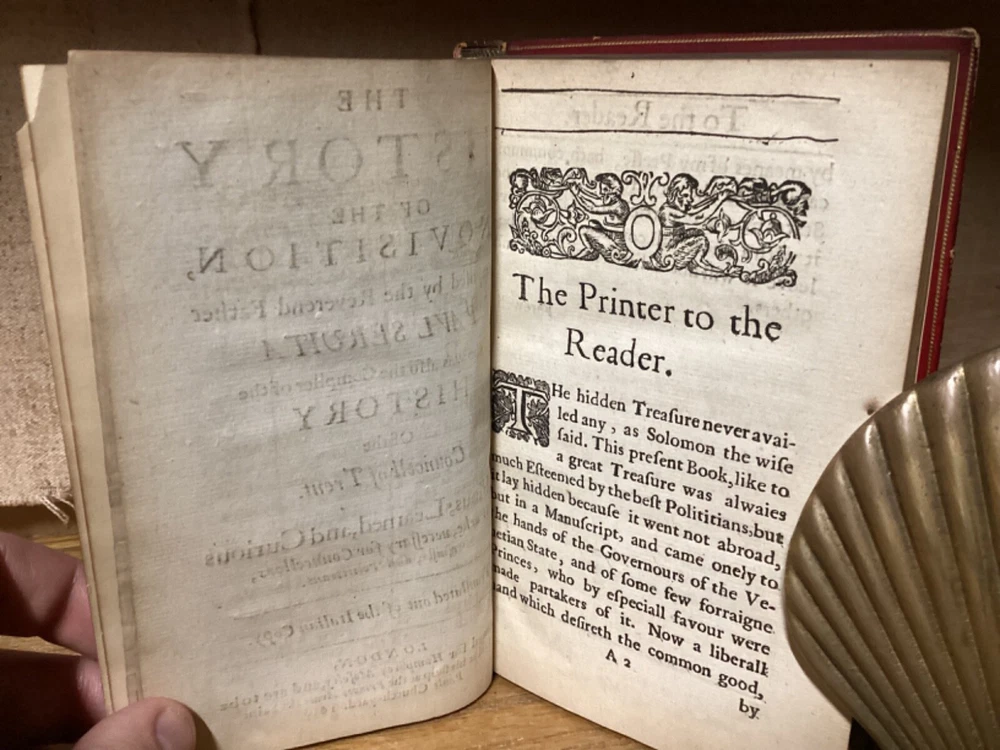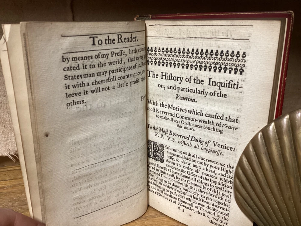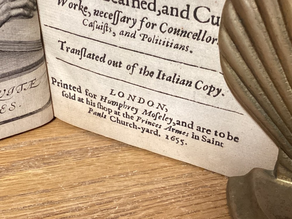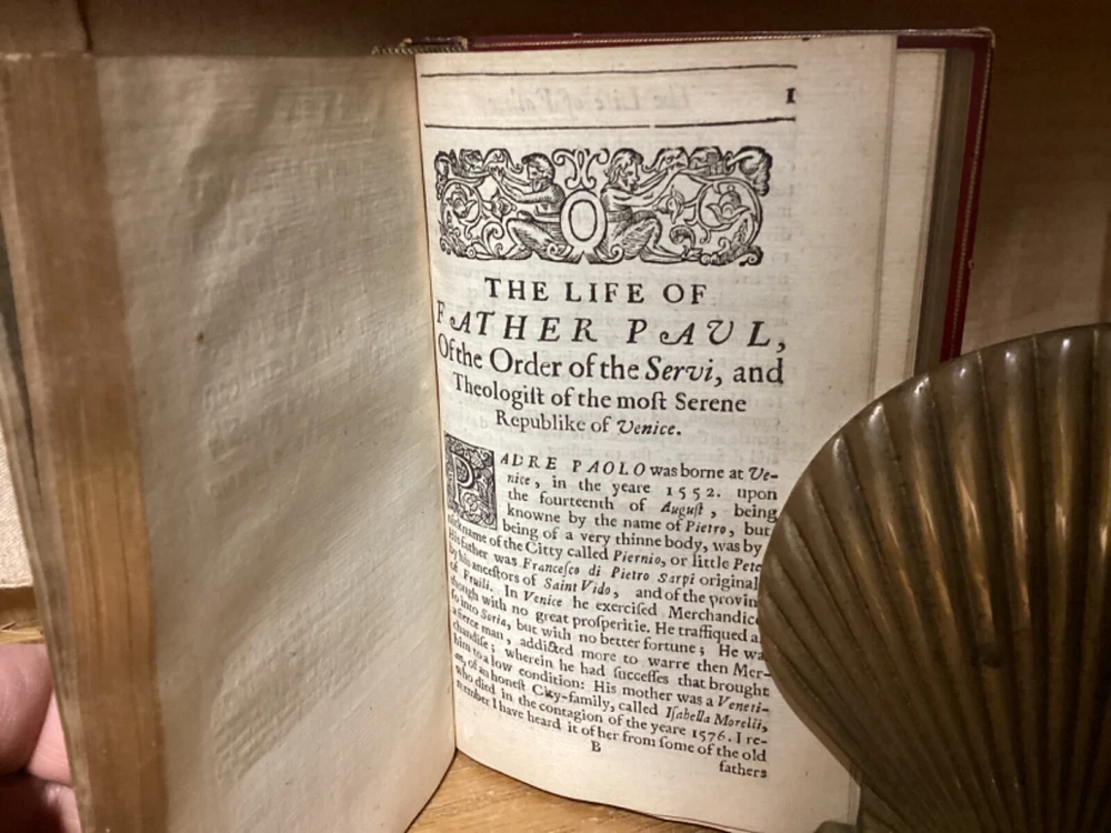 The Life of the Most Learned Father Paul, of the Order of the Service. Councellour of State to the most Serene Republicke of Venice, and Authour of the History of the Counsell of Trent. Printed in London by Humphrey Moseley and Richard Marriot. 1651. 204 pp. The History of the Inquisition, Composed by the Reverend Father Paul Servita, who was also the Compiler of the History of the Councell of Trent. Printed in London by Humphrey Moseley. 1655. 147 pp. Bound together in a 6.75” x 4.25” 19th Century leather binding. As-is, with front cover detached and rear cover cracked along spine. Text block remains bound well. Bookplate to front pastedown. Includes frontispiece at front of 1655 piece. Some loss to leather at head and heel of spine. General age-related toning to pages, along with periodic foxing and wear. Please see photographs and ask any questions prior to purchasing. An extremely scarce pair of pieces by and about Paolo Sarpi (1552-1623), an Italian Servite friar and Catholic priest. Sarpi was notable for his historical, scientific, and legal writings, and served as a statesman for the Venetian Republic on multiple occasions. His writings were often critical of the Catholic Church’s traditions, and inspired later writers such as Thomas Hobbes and Edward Gibbon. A wonderful piece for restoration and rebinding. FORN-SHELF-0436-BB-2504-aj3910