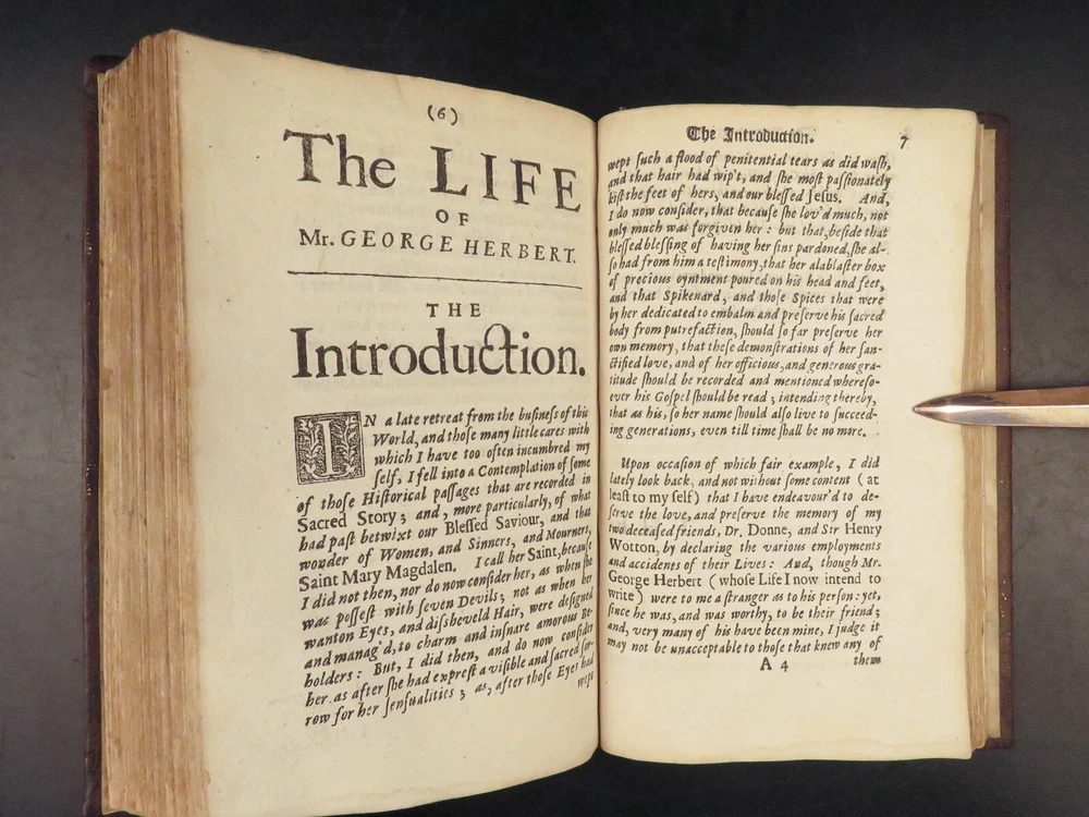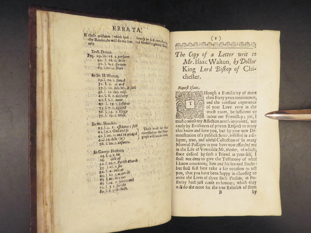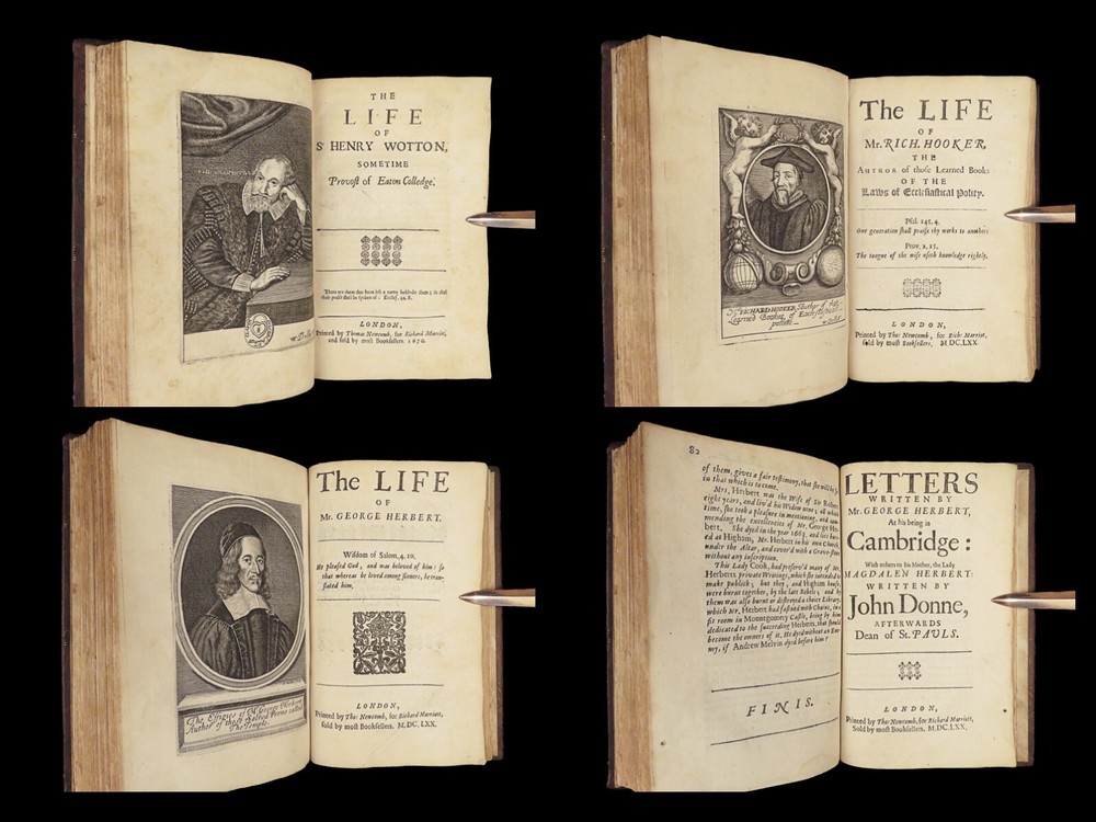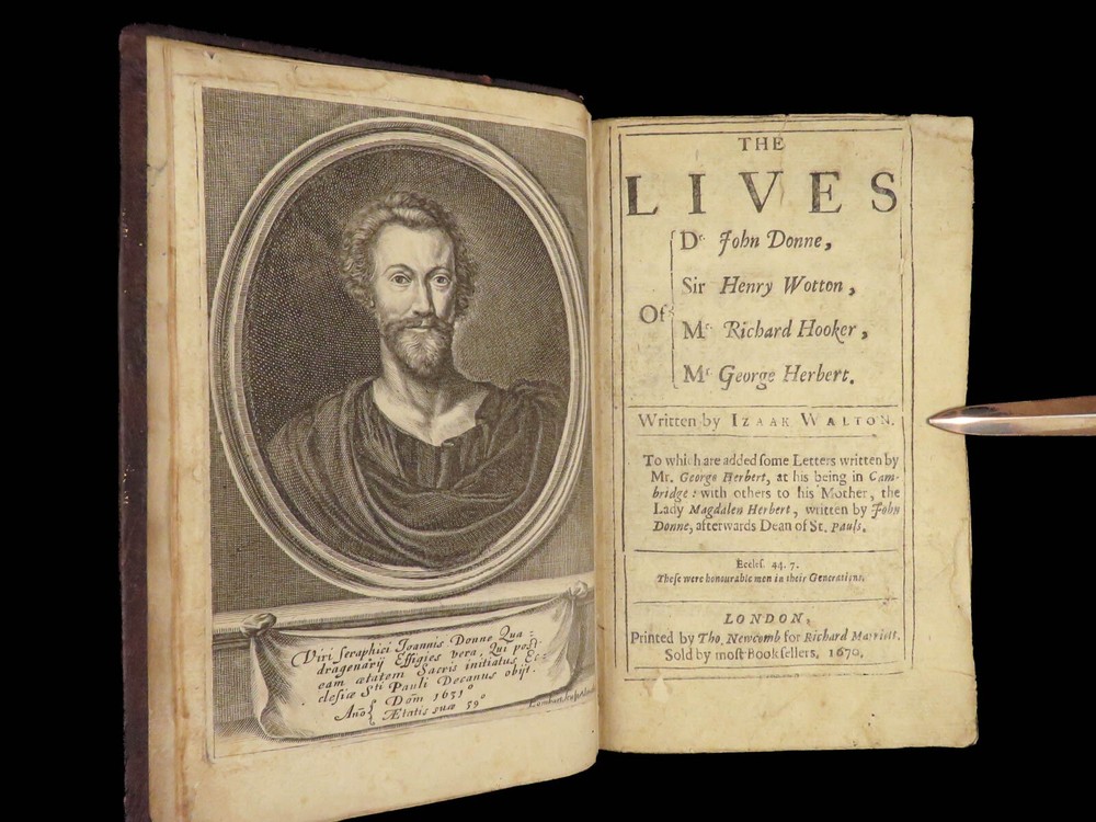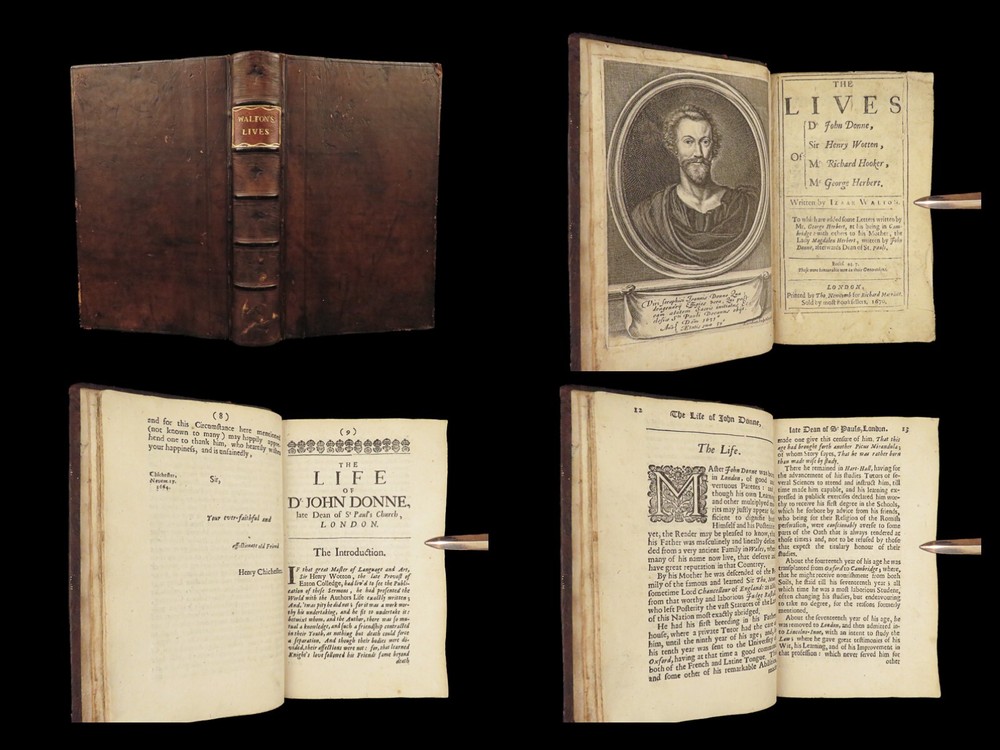 1670 Lives of John Donne 1 ed Wotton Hooker & Herbert English RARE Isaak Walton Izaak Walton was a 17 th -century author best known for his work on fishing, ‘ The Compleat Angler’ . However, Walton also wrote a series of biographical ‘lives’ of notable English figures. These short sketches were on politicians, priests, and poets alike – Henry Wotton, John Donne, Richard Hooker, and George Herbert. This 1670 edition includes all four ‘lives’ in one book. This edition also includes four fine, full-page portrait engravings. Item number: #26598 Price: $1095 WALTON, Izaac The lives of Dr. John Donne, Sir Henry Wotton, Mr. Richard Hooker, Mr. George Herbert London : Printed by Tho. Newcomb for Richard Marriott, 1670. First edition. Details : · Collation: Complete; 5 parts in 1 tome o Life of Donne – [12], 88 o Life of Wotton – 79, [1] o Life of Hooker – 140 (i.e. 120) § Pagination errors as expected o Life of Herbert – 82 o Letters – [2], 85-104 o Each section includes a separate title page o 4 full-page portrait engravings · References: Wing W 671; ESTC R 15317 · Language: English · Binding: Leather; tight and secure · Size : ~7.5in X 5in (19cm x 12.5cm) Our Guarantee: Very Fast. Very Safe. Free Shipping Worldwide. Customer satisfaction is our priority! Notify us with 7 days of receiving, and we will offer a full refund without reservation! 26598
