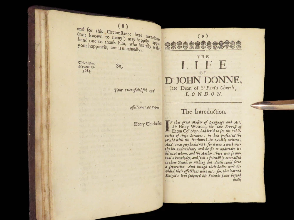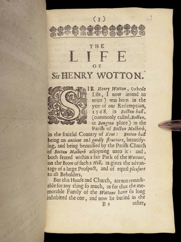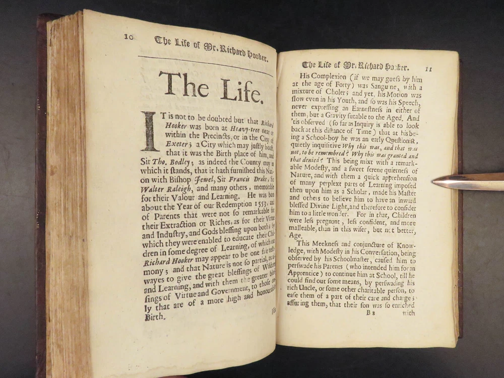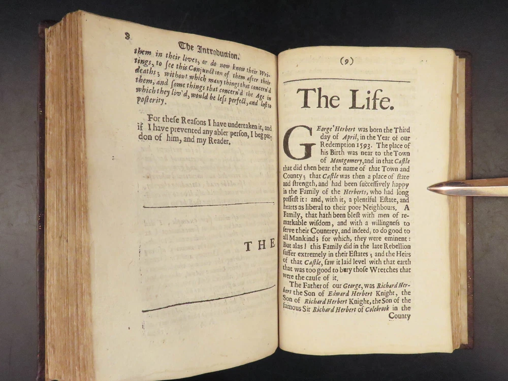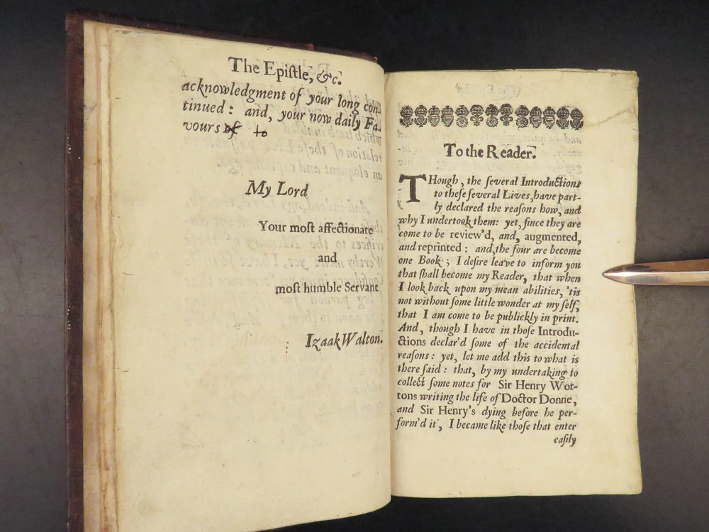 1670 Lives of John Donne 1 ed Wotton Hooker & Herbert English RARE Isaak Walton Izaak Walton was a 17 th -century author best known for his work on fishing, ‘ The Compleat Angler’ . However, Walton also wrote a series of biographical ‘lives’ of notable English figures. These short sketches were on politicians, priests, and poets alike – Henry Wotton, John Donne, Richard Hooker, and George Herbert. This 1670 edition includes all four ‘lives’ in one book. This edition also includes four fine, full-page portrait engravings. Item number: #26598 Price: $1095 WALTON, Izaac The lives of Dr. John Donne, Sir Henry Wotton, Mr. Richard Hooker, Mr. George Herbert London : Printed by Tho. Newcomb for Richard Marriott, 1670. First edition. Details : · Collation: Complete; 5 parts in 1 tome o Life of Donne – [12], 88 o Life of Wotton – 79, [1] o Life of Hooker – 140 (i.e. 120) § Pagination errors as expected o Life of Herbert – 82 o Letters – [2], 85-104 o Each section includes a separate title page o 4 full-page portrait engravings · References: Wing W 671; ESTC R 15317 · Language: English · Binding: Leather; tight and secure · Size : ~7.5in X 5in (19cm x 12.5cm) Our Guarantee: Very Fast. Very Safe. Free Shipping Worldwide. Customer satisfaction is our priority! Notify us with 7 days of receiving, and we will offer a full refund without reservation! 26598