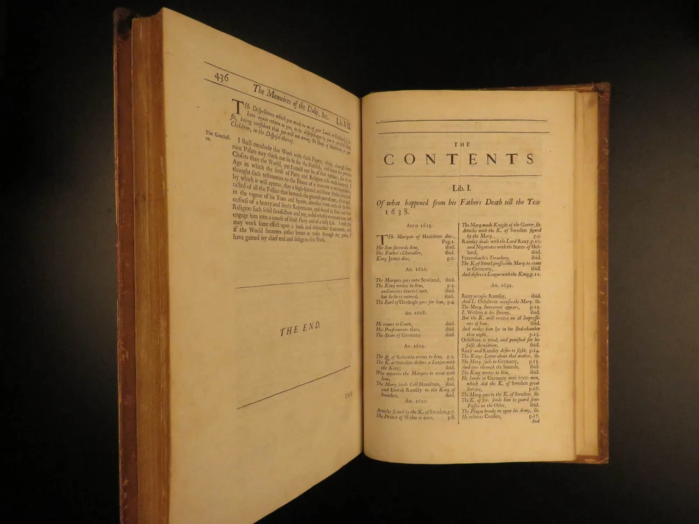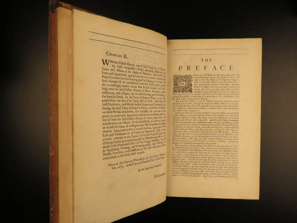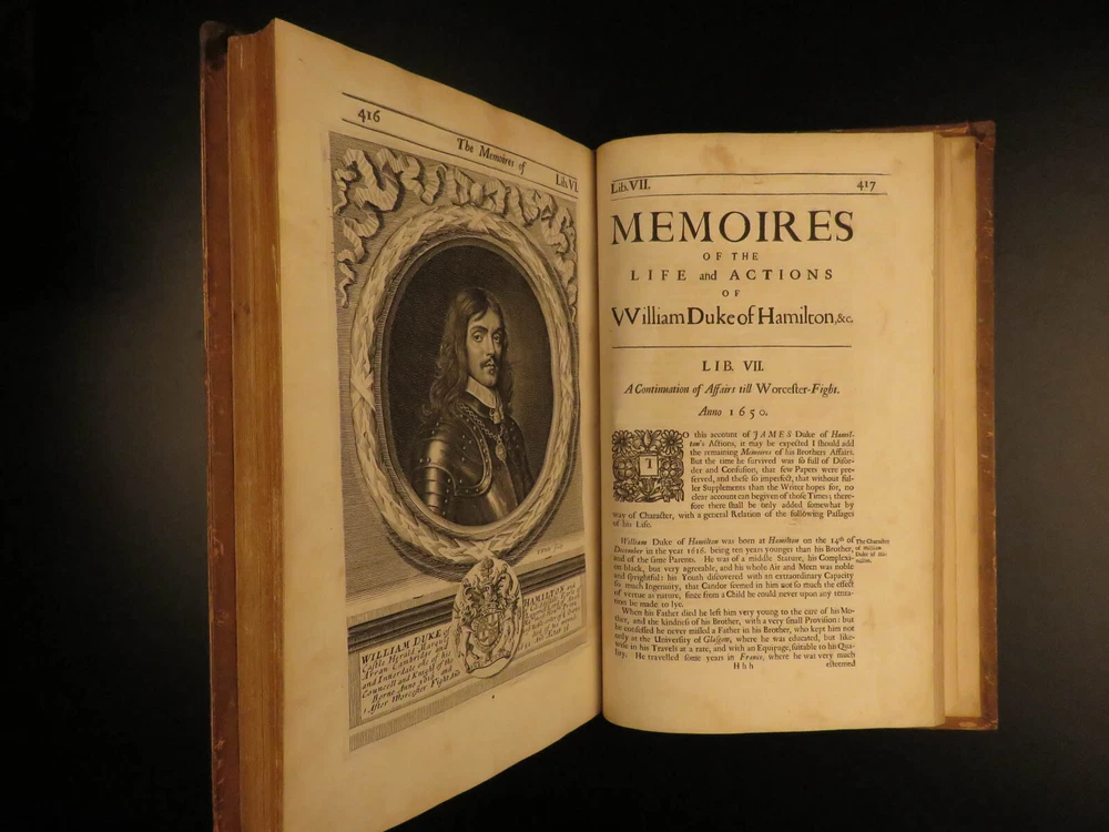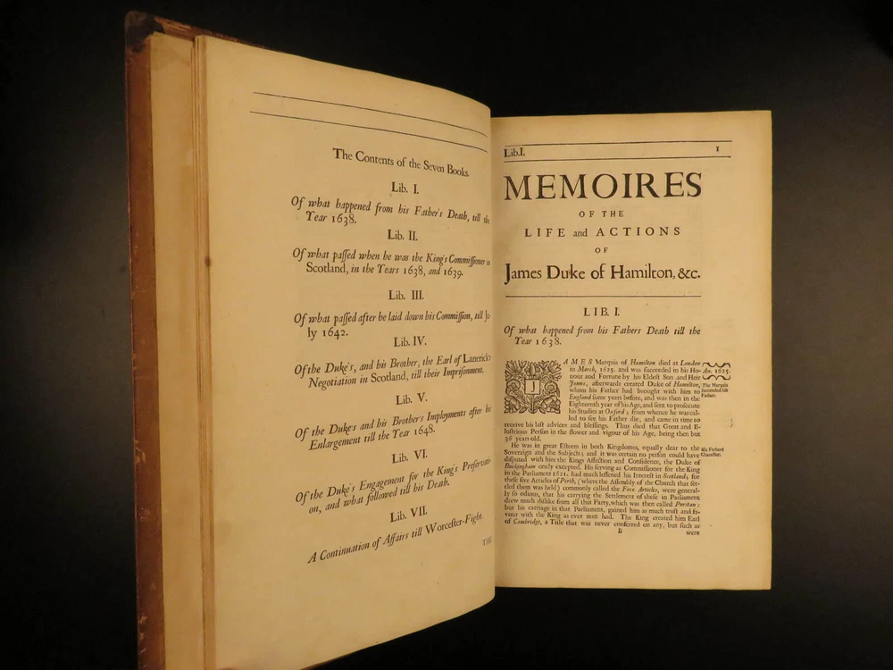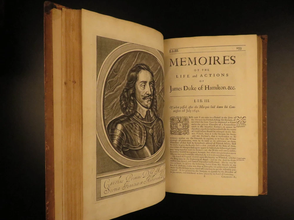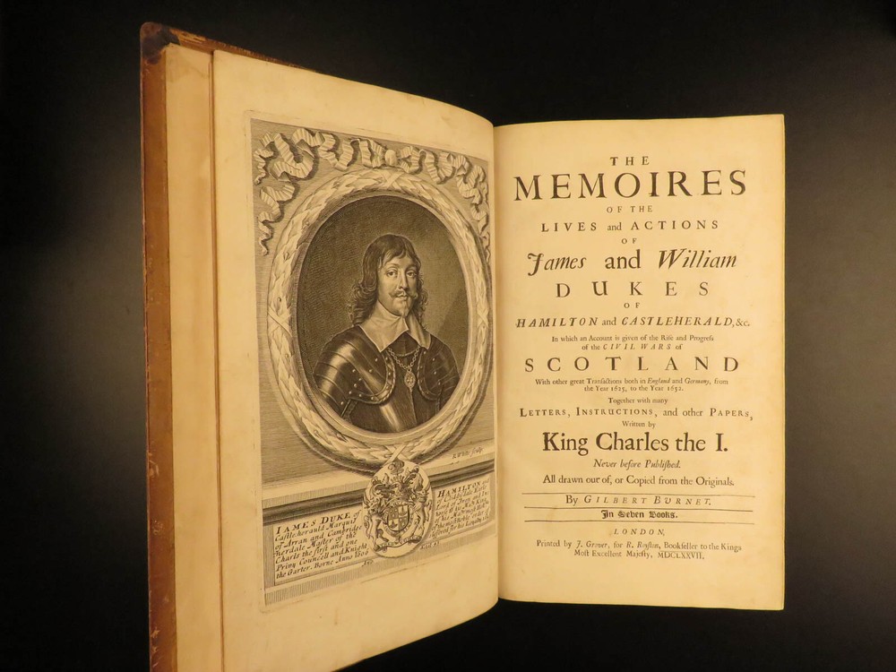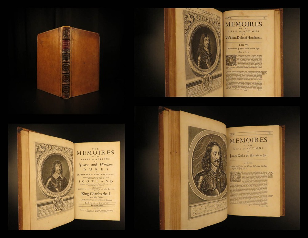 1677 1 ed Memoirs Duke of Hamilton Scottish Thirty Years War Reformation Scotland Gilbert Burnet was an important 17 th -century Scottish historian whose works were highly influential and have remained important references into the 20 th -century. His works focused primarily on the history events of the Reformation and the English Civil War; however, he also wrote a lesser-known work on the lives and memoires of the Dukes of Hamilton. James and William Hamilton were Scottish nobles who led successful campaigns during the Thirty Years’ War. This 1677 first edition includes an appendix containing notes on the succession of bishops and churchmen of the Church of Scotland, orders of monks and friars, and the state of Scotland prior to the Reformation. Item number: #13367 Price: $950 BURNET, Gilbert The memoires of the lives and actions of James and William, Dukes of Hamilton and Castleherald, &c. : in which an account is given of the rise and progress of the civil wars of Scotland, with other great transactions both in England and Germany, from the year 1625, to the year 1652 : together with many letters, instructions, and other papers, written by King Charles the I : never before published London : Printed by J. Grover for R. Royston ..., 1677. First edition. Details : · Collation: Complete with all pages o [20], 436, [12] o 3 engraved plates · References: Wing B 5832; · Provenance: Bookplate – Rev. John Besly, D.C.L. o Rev. John Besly (1800 – 1868) attended Balliol College in Oxford, earning a B.A. He was ordained into the Church of England in 1823, and appointed Vicar of St. Bartholomew in Long Benton, Northumberland in 1830, where he remained until his death. · Language: English · Binding: Leather; tight & secure · Size : ~12.75in X 8.25in (32.5cm x 21cm) Our Guarantee: Very Fast. Very Safe. Free Shipping Worldwide. Customer satisfaction is our priority! Notify us with 7 days of receiving, and we will offer a full refund without reservation! 13367