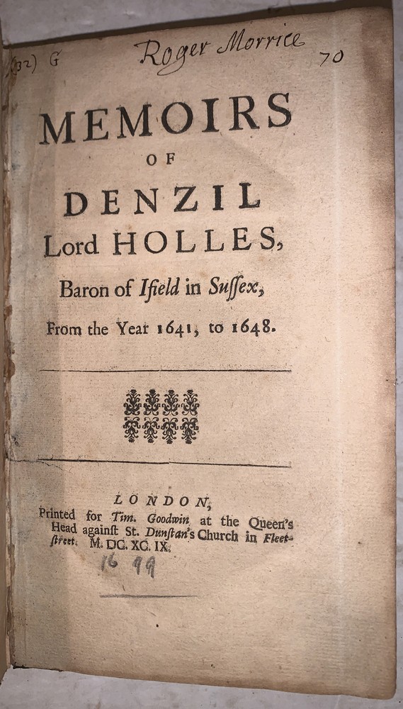 Memoirs of Denzil Lord Holles, Baron of Ifield in Sussex, From the Year 1641, to 1648. London: Printed for Tim. Goodwin at teh Queen's Head against St. Dunstan's Churhc in Fleetstreet 1699 First Edition 12mo, xv, [1], 213, [19] pages, bound in period full leather with blind stamped decoration. Rebacked with red cloth. This copy without the half title or the engraving found in some copies. Some rubbing and wear, previous owner's neat bookplate and inscription, front hinge reinforced, some minor discolorations, else in good + condition. If you have any questions feel free to ask and don't forget to check out my other listings.