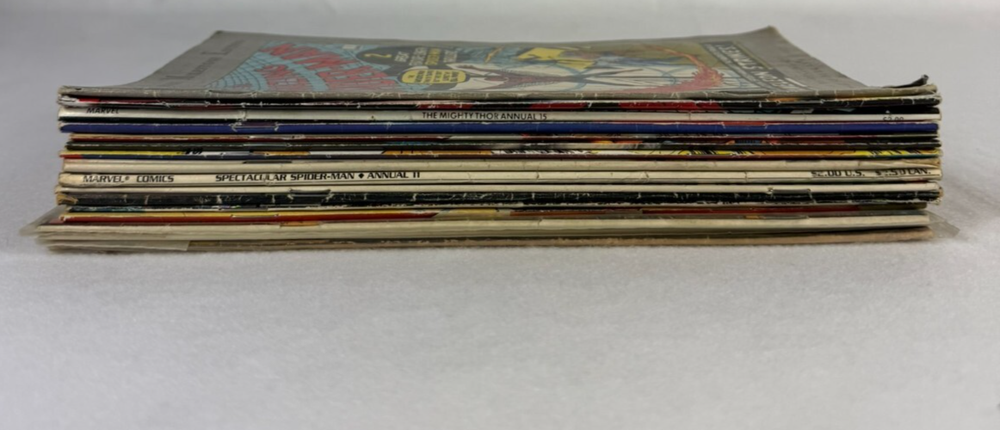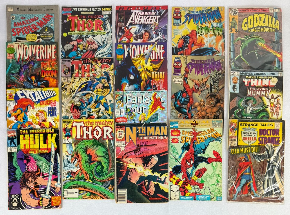 Title: 17 Vintage Marvel Comics Lot Spider-Man Thor Wolverine Hulk Godzilla + More Description: Lot of 17 vintage Marvel comics featuring iconic characters such as Spider-Man, Thor, Hulk, Wolverine, Excalibur, Godzilla, Silver Surfer, The Thing, and Doctor Strange. Includes both regular and annual issues from various series and eras. A solid mix for collectors or comic resellers. Condition: Comics range from fair to very good condition. Most issues show expected age-related wear such as spine creases, edge wear, and cover fading. A few have visible bends, light tearing, or color breaks. All comics appear complete and are bagged (some boarded). Please review images for details on individual issue condition. Shipping: Ships via USPS Ground Advantage within two business days. Why Buy From Us: Trusted seller. Each comic is handled with care and shipped securely. We ensure fast, professional service with attention to detail.