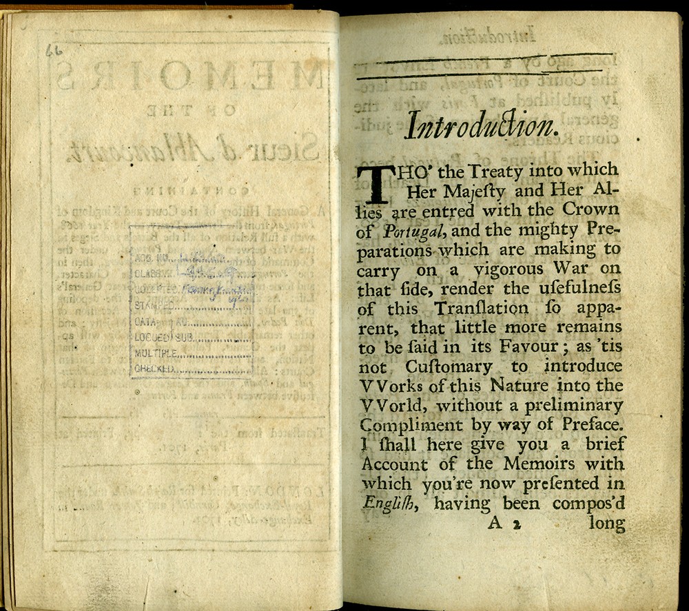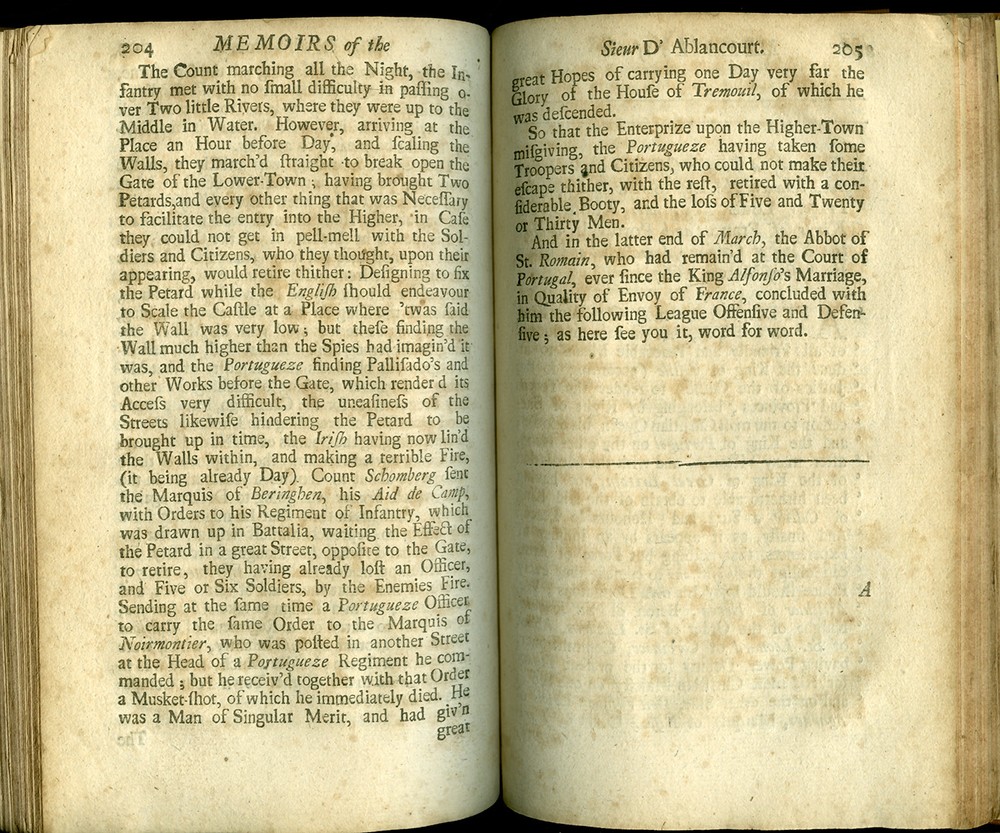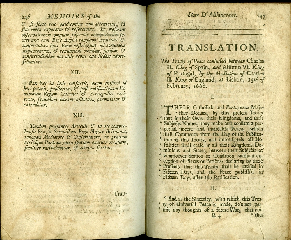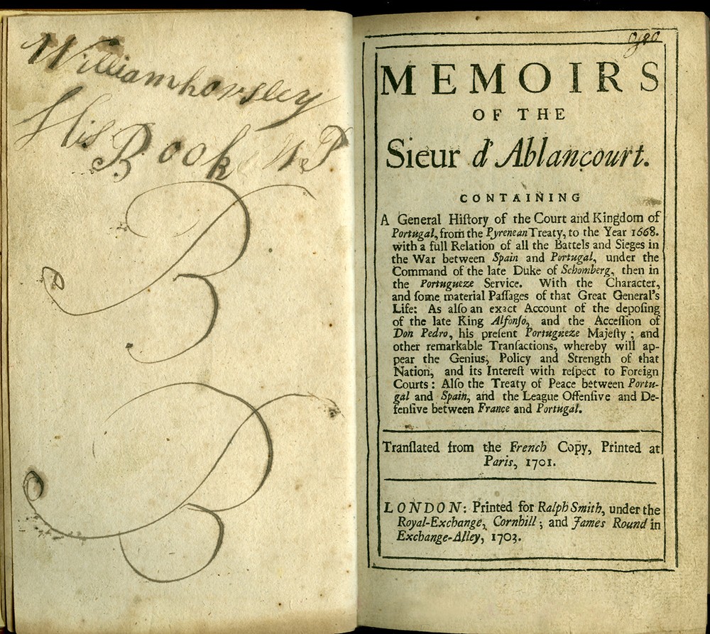 16th - 19th Century Fine and Rare Books, Maps, Manuscripts, and Atlases SIEUR d' ABLANCOURT MEMOIRS of the Sieur d'Ablancourt (Memoires De Monsieur d'Ablancourt) CONTAINING General History of the Court and Kingdom of Portugal from the Pyrenean Treaty to the Year 1668... Translated from the French Copy printed at Paris, 1701 Envoy - French King - Portugal - Pyrenean Treaty London 1703 FIRST ENGLISH EDITION ABLANCOURT, SIEUR d'. (1621-1696) Memoirs of the Sieur d'Ablancourt (Memoires De Monsieur D'Ablancourt) Containing a General History of the Court and Kingdom of Portugal, from the Pyrenean Treaty to the Year 1668... Translated from the French Copy printed at Paris, 1701 CONTAINING: A General History of the Court and Kingdom of Portugal, from the Pyrenean Treaty, to the Year 1668. With a full Relation of all the Battels and Sieges in the War between Spain and Portugal, under the Command of the late Duke of Schomberg, then in the Portugueze Service. With the Character and some material Passages of that Great General's Life: As also an exact Account of the deposing of the late King Alfonso, and the Accession of Don Pedro, his present Portugueze Majesty; and other remarkable Transactions, whereby will appear the Genius, Policy and Strength of that Nation, and its Interest with respect to Foreign Courts: Also the Treaty of Peace between Portugal and Spain, and the League Offensive and Defensive between France and Portugal. Printed for Ralph Smith, under the Royal-Exchange, Cornhill; and James Round in Exchange-Alley, 1703. Bound in full Calf Leather, its leaves crisp with minimal foxing. - [8], 262, [2] pages. (8vo) - Quite Rare FIRST ENGLISH EDITION PAYMENT - CREDIT CARDS DISCOVER - MASTERCARD - VISA - AMERICAN EXPRESS SHIPPING - USPS / FEDEX