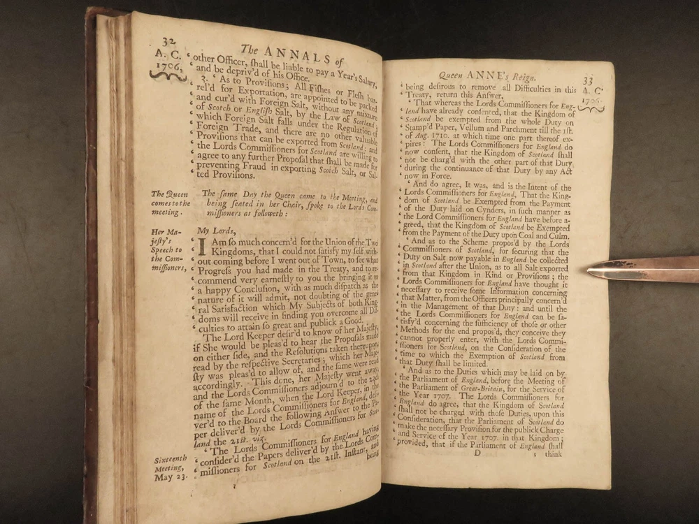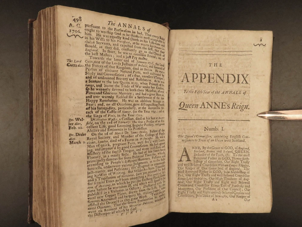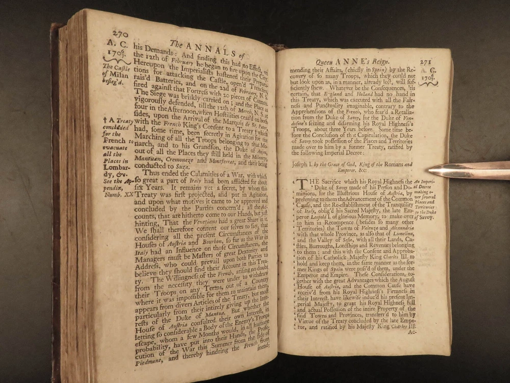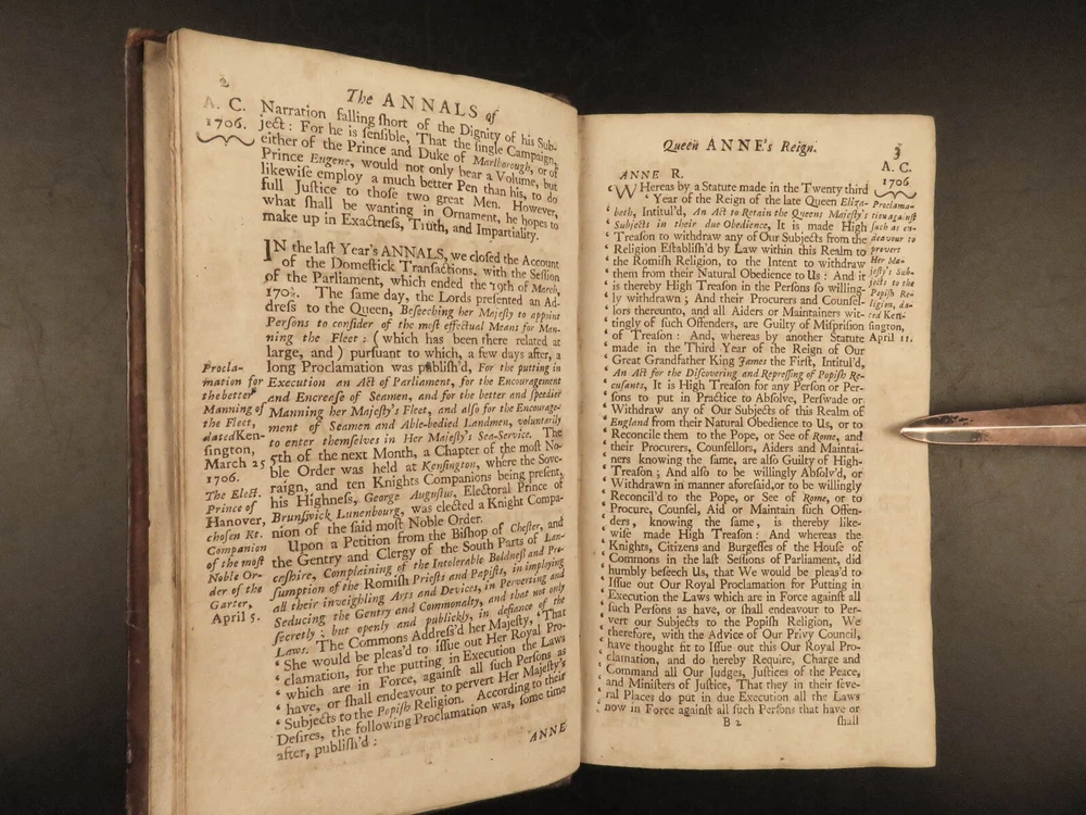 1707 Queen Anne 1 ed Memoirs of England MAPS Abel Boyer Parliament Politics Wars Abel Boyer was a 17 th -century English historian who is regularly remembered for his account of the life and reign of Queen Anne of England. It was in his ‘ History of Queen Anne’ that he describes proceedings in British Parliament, royal speeches, as well as political debates. This 1707 ‘anonymous’ edition is still credited to Boyer; however, according to the ESTC it was edited and collected by an author simply named Gibson. This work is without question one of the best 18 th -century examples of biographies of Queen Anne , especially considering the inclusion of commentary on the political and diplomatic state of England from the Reformation through the fifth year of Anne’s reign, 1707. Item number: #24628 Price: $599 BOYER, Abel The history of the reign of Queen Anne digested into annals. Year the fifth London: Printed for A. Roper, 1707. 1 st edition Details : · Collation: Complete with all pages o [8], 498 (i.e., 488), 201, [15] o 2 folding engravings · Provenance: Handwritten – Fletcher Fleming · Language: English · Binding: Leather; secure · Size : ~7.75in X 4.5in (19.5cm x 11.5cm) Our Guarantee: Very Fast. Very Safe. Free Shipping Worldwide. Customer satisfaction is our priority! Notify us with 7 days of receiving, and we will offer a full refund without reservation! 24628
