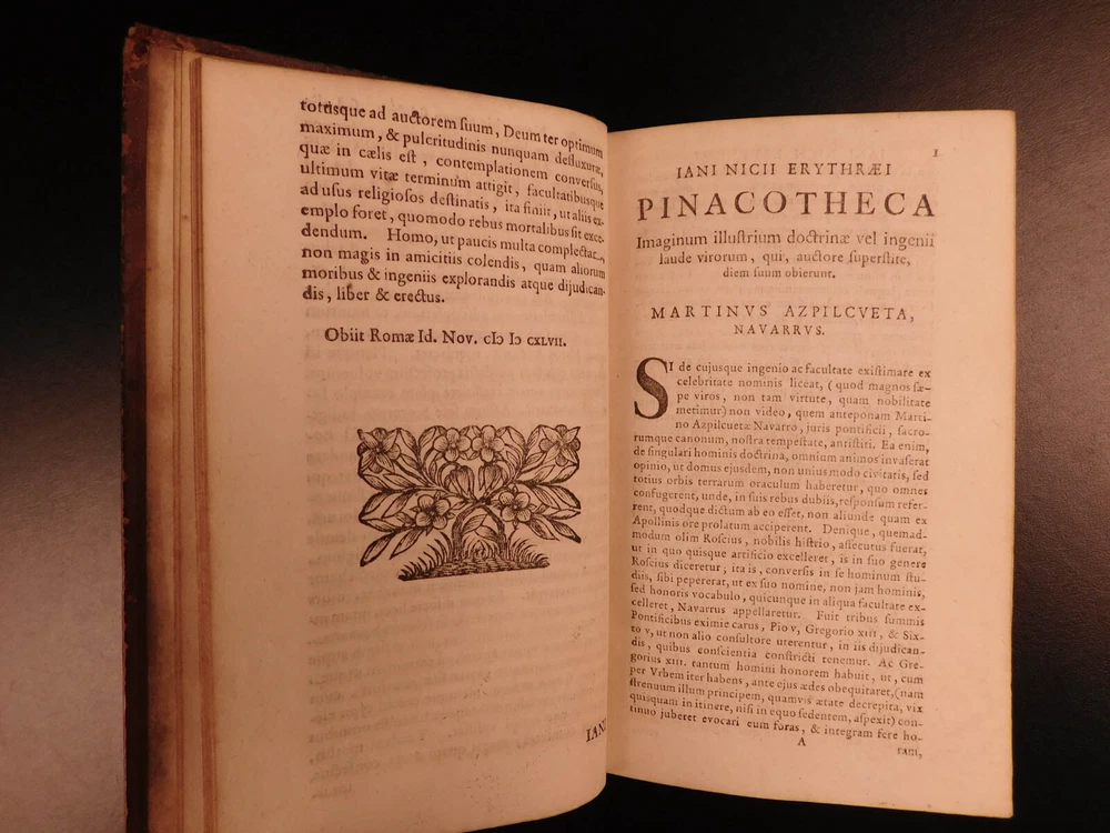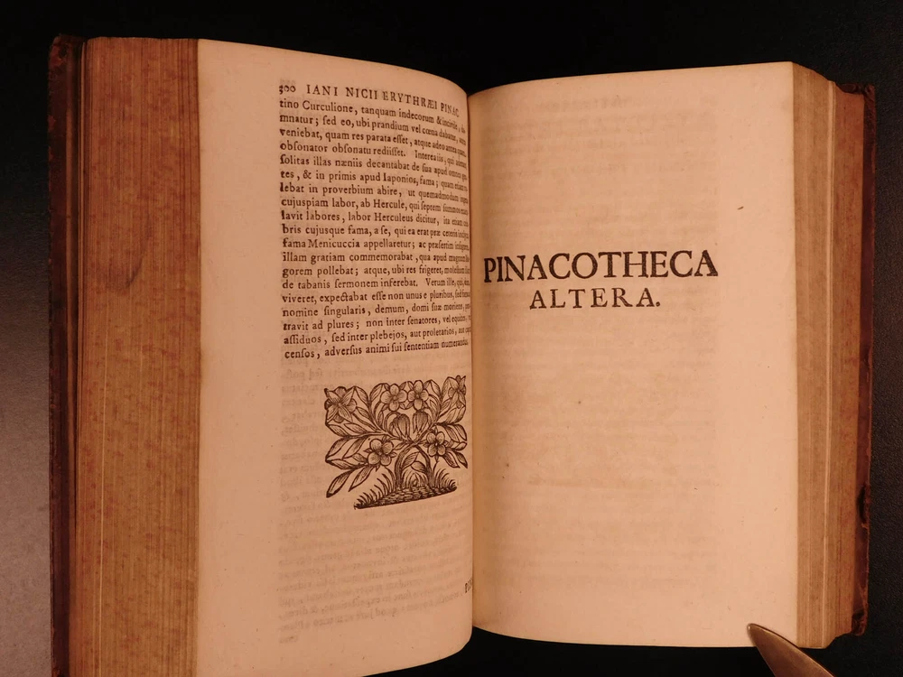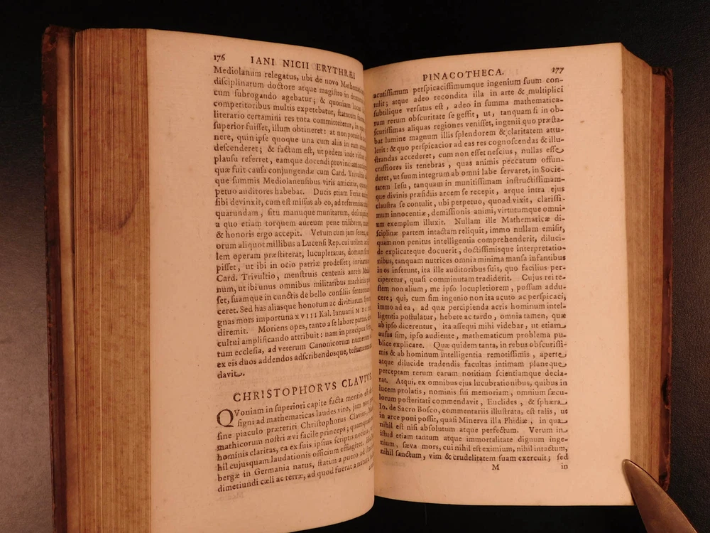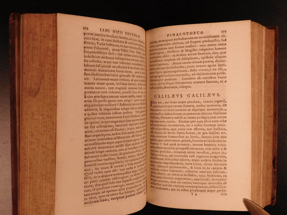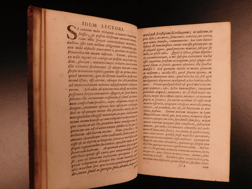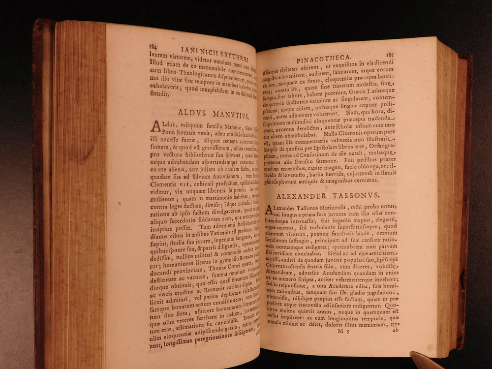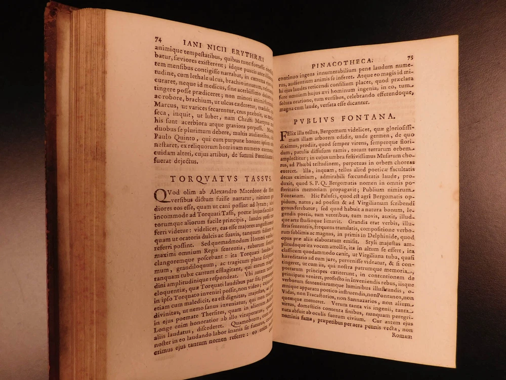 1712 Rossi Pinacotheca Imaginum Famous Biographies Galileo Aldus Torquato Tasso Gian Vittorio Rossi was a 17 th -century Italian poet and author who is best remembered for his landmark work ‘Pinacotheca’. ‘Pinacotheca Imaginum Illustrium’ is a collection of three hundred short biographical sketches of other authors and notable figures with whom Rossi was familiar. First published in 1643, this work was one of the first examples of an Italian literary history. Rossi, also known by his pseudonym Erythraeus, included biographies on some of the most famous historical figures including: · Torquato Tasso · Christopher Clavius · Aldus Manutius · Galileo Galilei · Scipio Gonzaga · Peter the Great Item number: #6553 Price: $550 ROSSI, Gian Vittorio [pseud. Janus Nicius Erythraeus] Iani Erythraei Pinacotheca imaginum illustrium doctrinae vel ingenii laude virorum : qui auctore superstite diem suum obierunt. Lipsiae: apud Thomam Fritsch, 1712. Details : · Collation: Complete with all pages o [12], 845, [5] – divided into 3 sections · Provenance: Armorial Bookplate o Sir John Williams, 1 st Baronet of Bodlewyddan · Language: Latin · Binding: Leather; tight & secure · Size : ~6.75in X 4.5in (17cm x 11cm) Our Guarantee: Very Fast. Very Safe. Free Shipping Worldwide. Customer satisfaction is our priority! Notify us with 7 days of receiving, and we will offer a full refund without reservation! 6553