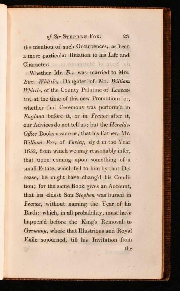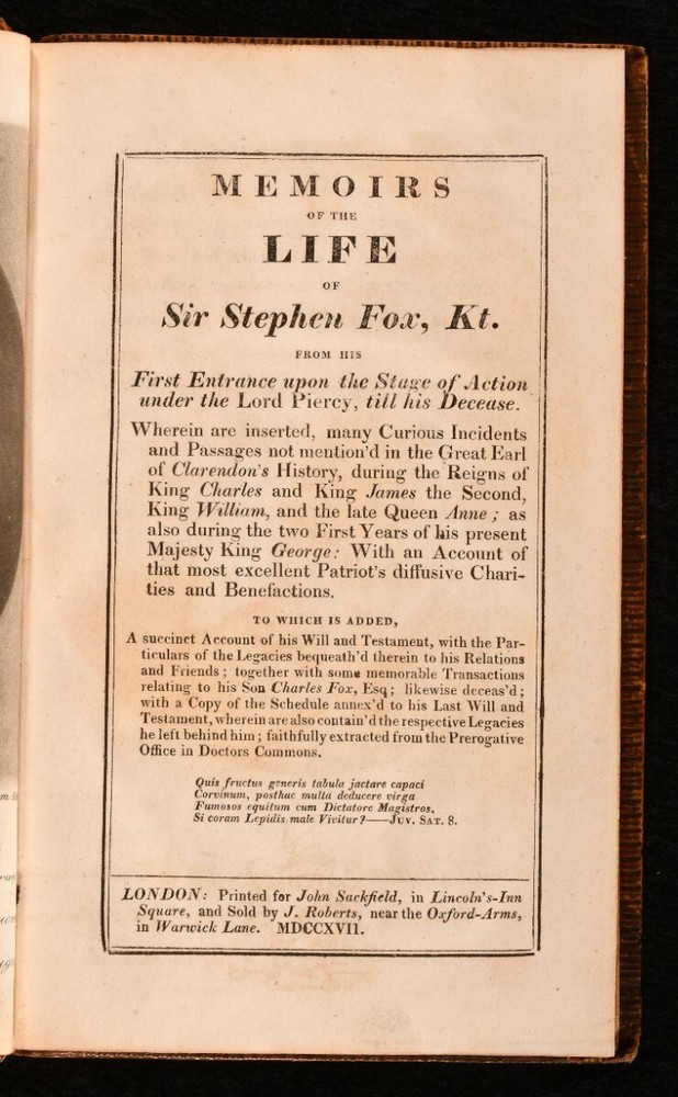 Click here to see our other books! Memoirs of the Life of Stephen Fox [William Pittis] 1717 John Sackfield : London 8.5" by 5.5" [2], iii-vii, [2], 2-149pp, [2], ii-iv SUMMARY A scarce first edition biography on the life of Sir Stephen Fox, an important courtier of King Charles II. First Edition,Illustrated,Leather Binding,Scarce Overall Condition: Good This book weighs 0.5 KG when packed UK Postage: £ 3.99 US Postage: £ 15.99 EU Postage : £ 13.99 European Postage: £ 14.99 Asia Postage: £ 18.99 Worldwide Postage: £ 19.99 DESCRIPTION The first edition of this scarce work. ESTC citation number T76847. Illustrated with a frontispiece. A memoir on the life and times of Sir Stephen Fox. Fox was a prominent royal administrator and courtier in the court of King Charles II. He came from humble origins but ended up as one of the 'richest commoners' in England, and was one of the driving founders of the Royal Hospital Chelsea. Written anonymously, by William Pittis. Bookplate of Gerald E. Aylmer to the recto to the front endpaper and rear paste down. Aylmer was a historian of seventeenth century England, and sometimes master of St. Peter's College in Oxford. Label of the Colinton House Library to the front paste down. CONDITION In a full diced calf binding. Externally, generally smart. Front joint is starting. A few light marks to the boards and spine, and some very light rubbing. Light bumping to the extremities. Bookplate to the front paste downs, bookplate to the recto to the front endpaper. Internally, firmly bound. Pages are lightly age-toned with a few spots. Overall Condition: Good GLOSSARY OF TERMS Overall Condition (Dustwrapper condition rating is shown after that for the book itself, where a dustwrapper is present) Fine - Very well preserved copy showing very little wear Very Good Indeed - Only one or two minor faults, really a very attractive copy Very Good - Quite a wide term meaning no major faults but probably several smaller ones often expected given the age of the book, but still a respectable copy Good - Meaning not very good. Some more serious faults as will be described in the condition report under 'condition' Good Only - Meaning one or more faults that could really do with repair Fair - As with good only above but with other faults leaving a compromised copy even after repair Poor - Really bad and possibly seriously incomplete. We only sell books in this condition where their rarity or value makes them attractive none the less. Major defects will be described. GUARANTEE We offer a full money back guarantee on our descriptions. Please ask for details and conditions. We prefer PAYPAL. If you pay via PAYPAL we will post the item off the same or the next working day with the postage you have selected. Please note we cannot accept USD cheques