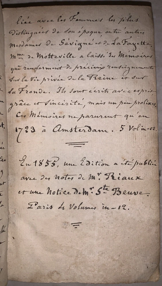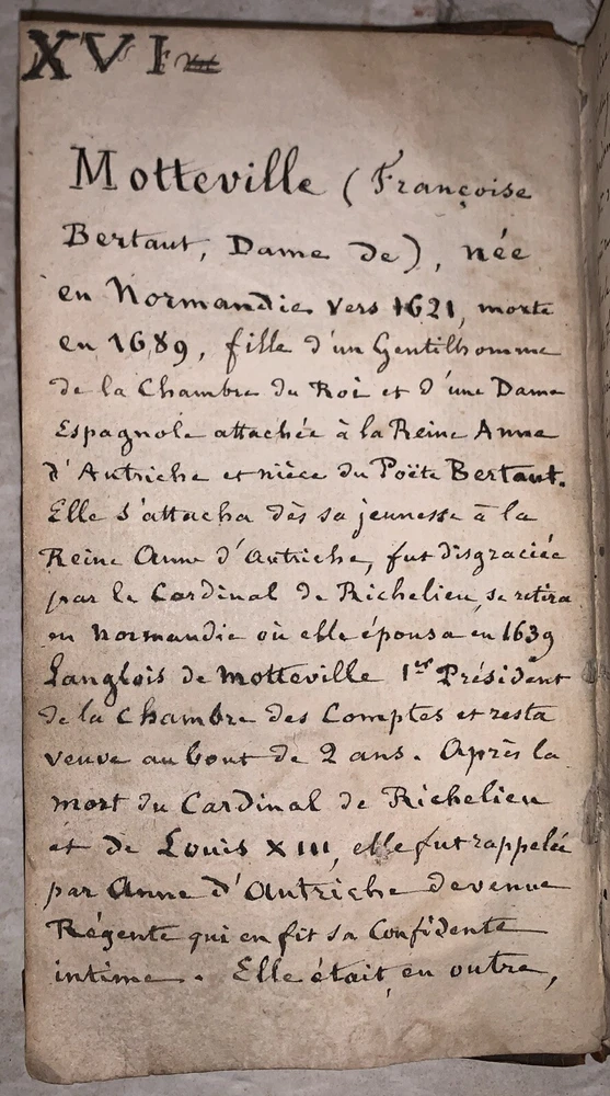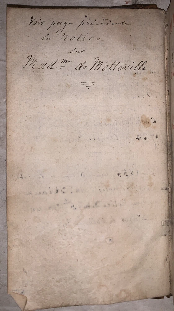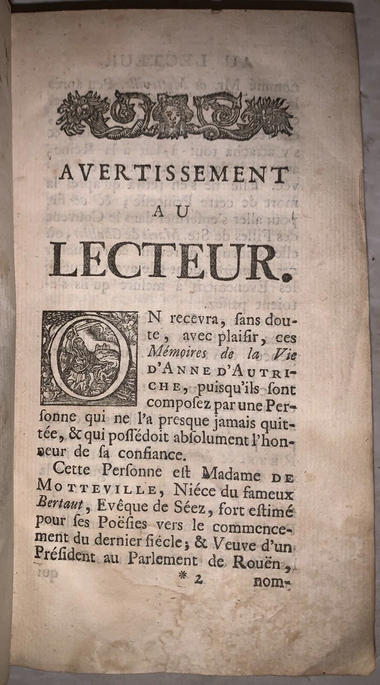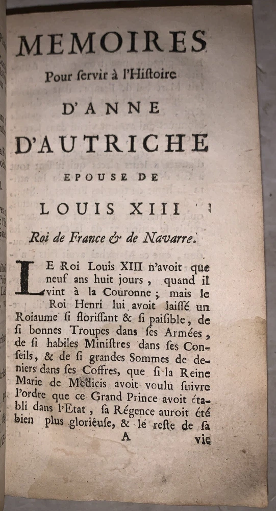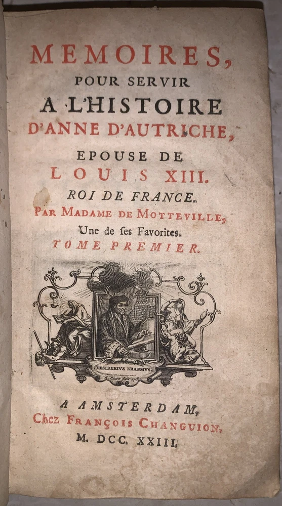 Memoires, pour servir a L'Histoire d'Anne d'Autriche, Epouse de Louis XIII, Roi de France par Madame De Motteville Tome Premier Only Amsterdam: Chez Francois Changuion 1723 18mo, [24], 557 pages, bound in period full leather, with raised bands and gilt decoration to spine. Marbled endpapers. There are a few pages of handwritten text at the front. Previous owner's neat bookplate. Text in French. Rubbing and wear, loss to rear free endpapers, hinges cracked but holding, chip to top of spine, some foxing and discoloration, corners bumped, else in good condition. If you have any questions, feel free to ask, and don't forget to check out my other listings.