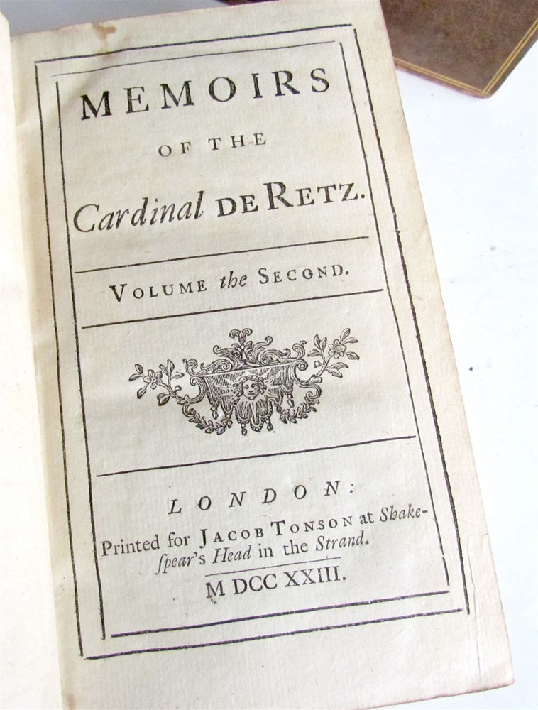 MEMOIRS of the CARDINAL de RETZ London: Printed for Jacob Tonson; 1723 4 VOLUMES COMPLETE SET Original calf, decorated in gilt. Very good condition Size 4 by 6.5" Text in English ============================== Powered by SixBit's eCommerce Solution