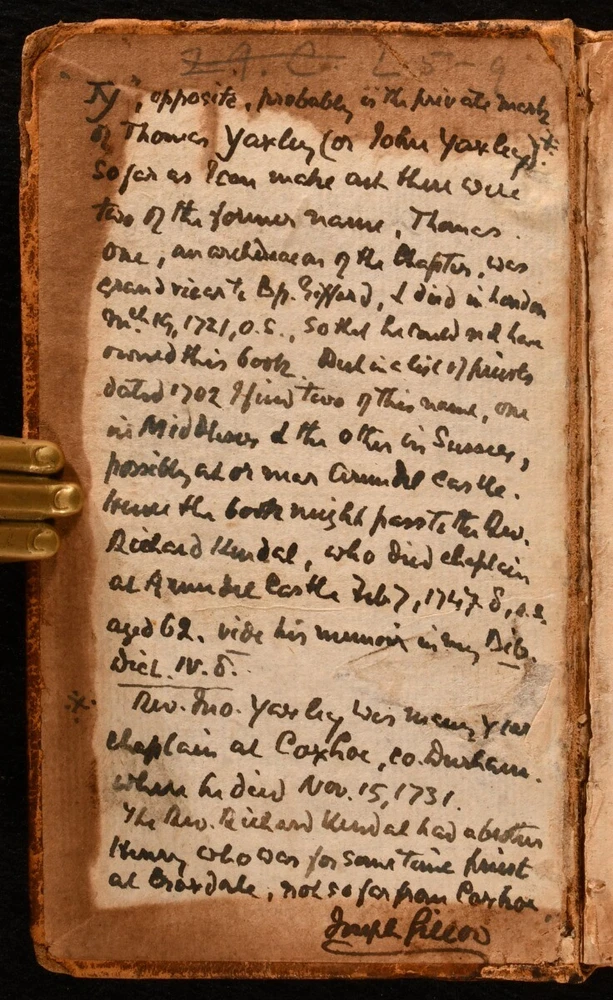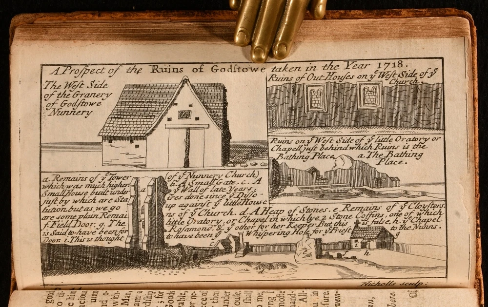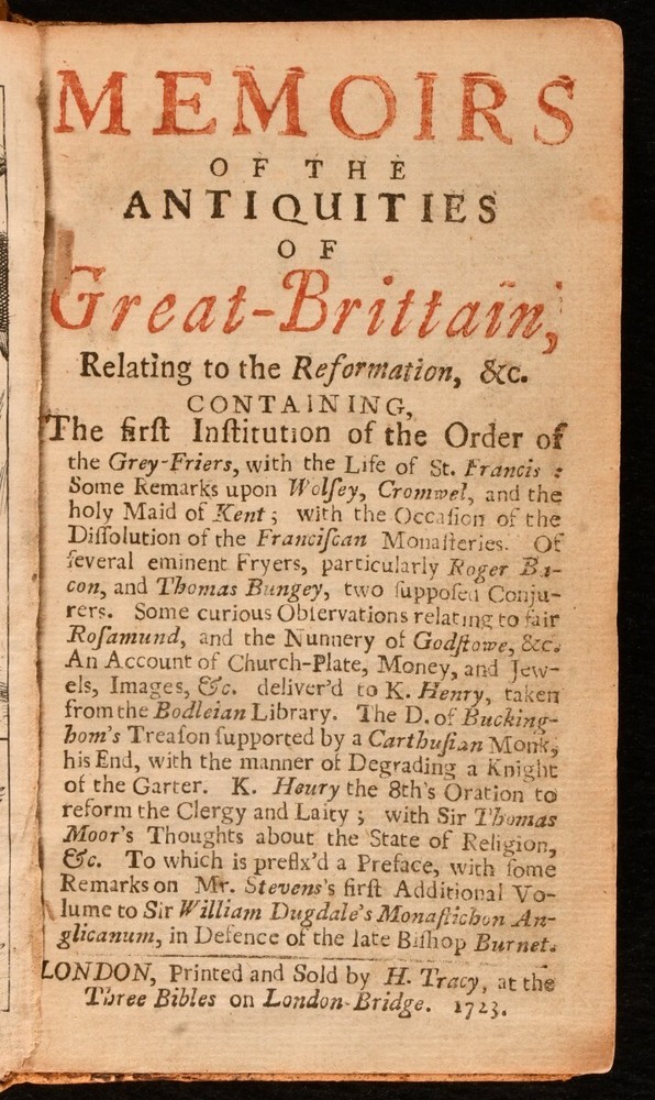 Click here to see our other books! Memoirs of the Antiquities of Great-Brittain, Relating to the Reformation, &c Anonymous 1723 H. Tracy : London 6" by 4" xii, 1-139 [5]pp SUMMARY A very scarce first edition of this illustrated account of the Reformation and the dissolution of the monasteries. First Edition,Illustrated,Leather Binding,Very Scarce Overall Condition: Good This book weighs 0.5 KG when packed UK Postage: £ 3.99 US Postage: £ 15.99 EU Postage : £ 13.99 European Postage: £ 14.99 Asia Postage: £ 18.99 Worldwide Postage: £ 19.99 DESCRIPTION The very scarce first edition of this work. A fascinating anonymously authored discussion of British history, with a particular focus on the Reformation and dissolution of the monasteries. Including discussion of Wolsey, Cromwell, and an account of the 'church-plate, money and jewels, images &c. deliver'd to K. Henry, taken from the Bodleian library'. Illustrated with a frontispiece, and four further plates. Collated, complete. Rebacked, retaining the original endpapers. ESTC T78048 With the armorial bookplate of Joseph Gillow of Preston to the front free endpaper, and with extensive former owner's inscriptions to the front pastedown, and recto and verso of the front free endpaper. A very scarce work. CONDITION Rebacked, retaining the original calf boards. Retaining the original endpapers. Externally, excellent. Hinges strained, but firmly held. Front free endpaper, front blank, and frontispiece detached and loosely inserted. Extensive former owner's inscriptions to front pastedown and front free endpaper. Bookplate to front free endpaper. Internally, firmly bound. Pages lightly age toned due to paper type, with light handling marks throughout. Overall Condition: Good GLOSSARY OF TERMS Overall Condition (Dustwrapper condition rating is shown after that for the book itself, where a dustwrapper is present) Fine - Very well preserved copy showing very little wear Very Good Indeed - Only one or two minor faults, really a very attractive copy Very Good - Quite a wide term meaning no major faults but probably several smaller ones often expected given the age of the book, but still a respectable copy Good - Meaning not very good. Some more serious faults as will be described in the condition report under 'condition' Good Only - Meaning one or more faults that could really do with repair Fair - As with good only above but with other faults leaving a compromised copy even after repair Poor - Really bad and possibly seriously incomplete. We only sell books in this condition where their rarity or value makes them attractive none the less. Major defects will be described. GUARANTEE We offer a full money back guarantee on our descriptions. Please ask for details and conditions. We prefer PAYPAL. If you pay via PAYPAL we will post the item off the same or the next working day with the postage you have selected. Please note we cannot accept USD cheques