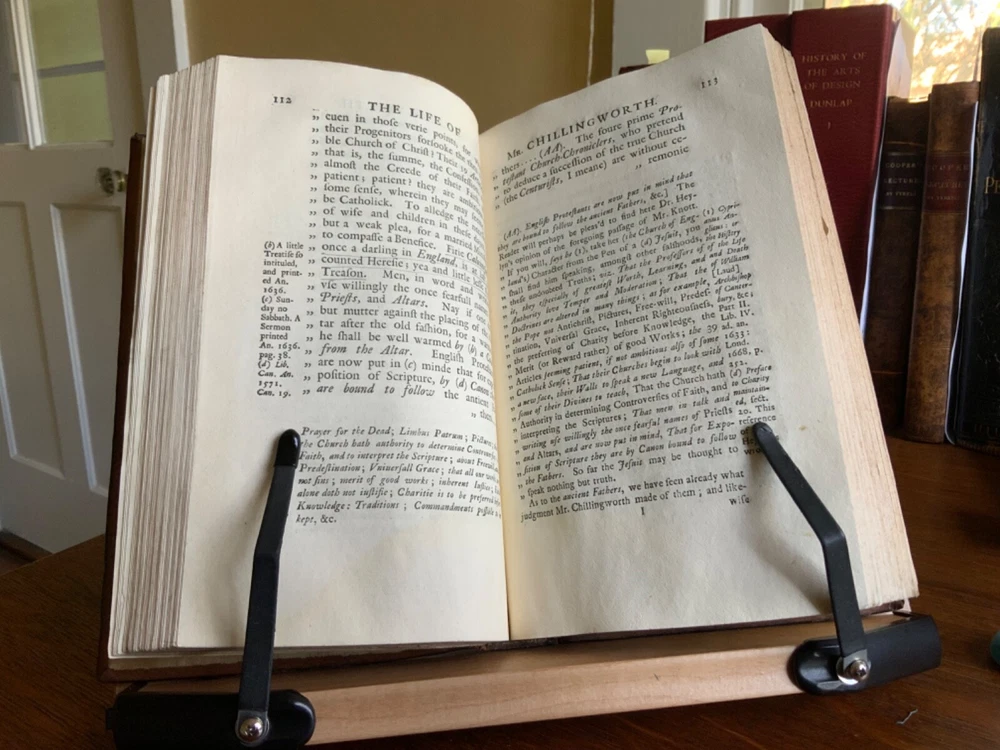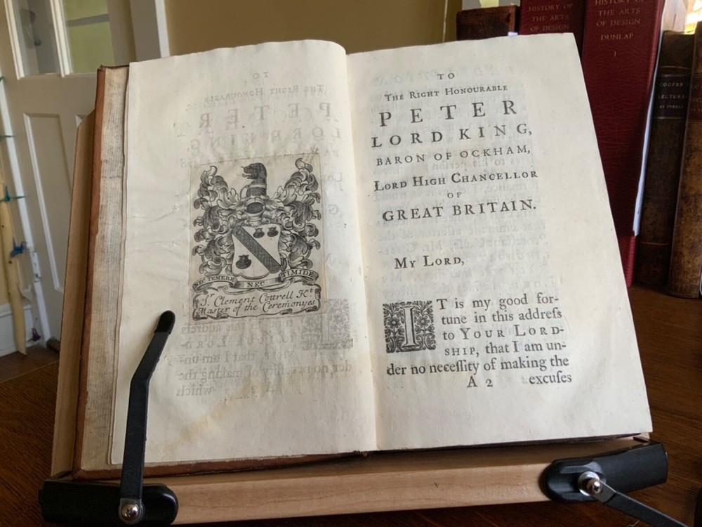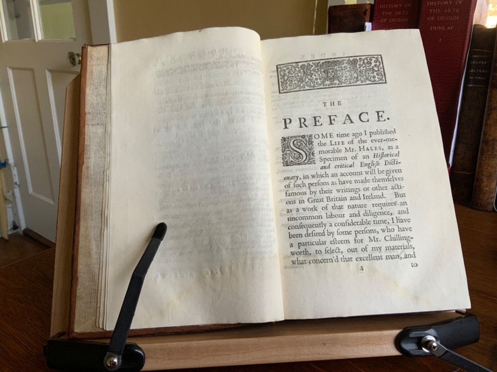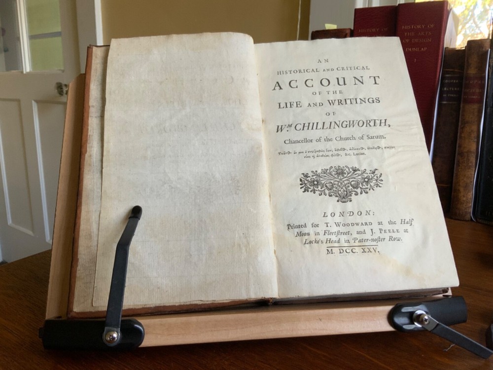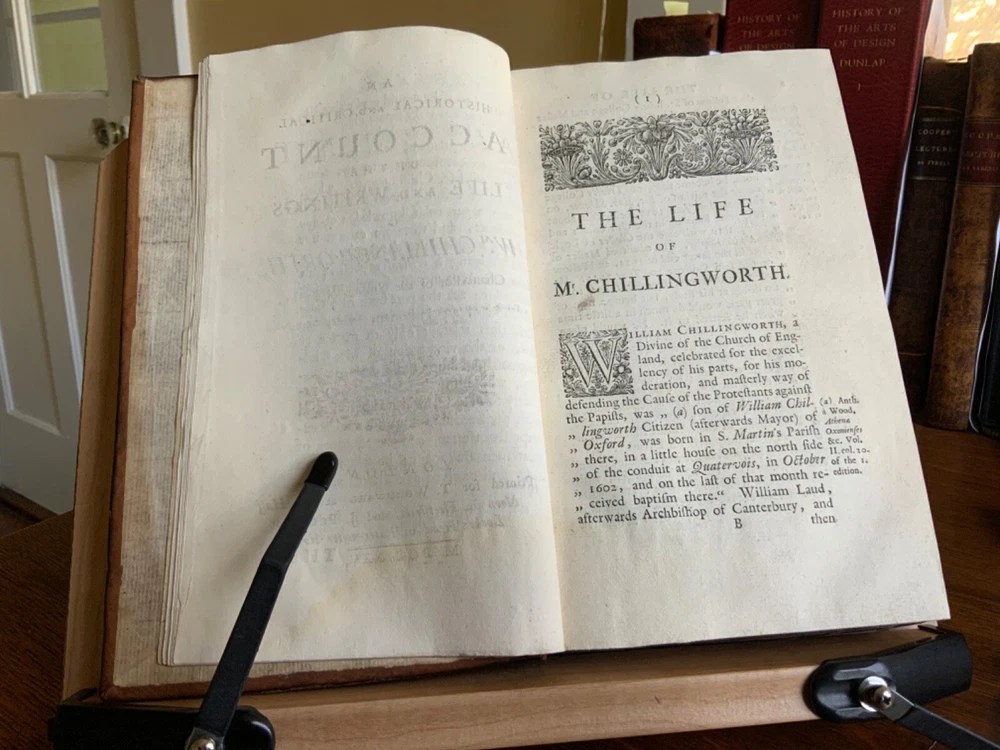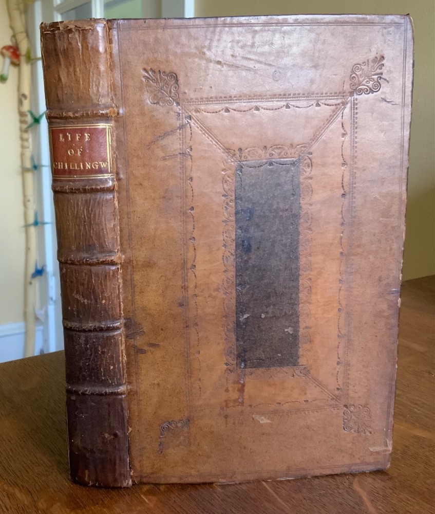 An Historical and Critical Account of the Life and Writings of Wm. Chillingworth, Chancellor of the Church of Sarum, Printed for T. Woodward at the Half Moon in Fleetstreet, London, 1725, 372 pp, plus index, errata, and publisher’s list, contemporary paneled cambridge calf, 8.5 x 5.5”, 8vo. In good condition. Beautifully bound in paneled calf with delicate tooling. Light wear to extremities with minor scuffing along edges and corners. Minor scuffing to surface of leather. Leather remains soft and rich in color. Light rubbing to joints with minor abrasions to raised bands. Presents nicely. Light toning throughout text block with minor instances of foxing. Faint dampness staining present in first and last signatures. Armorial bookplate of Sr. Clement Cottrell Master of the Ceremonyes on verso title. Text block lightly toned with minor rippling from previous humidity exposure. Rear pastedown and fly affected by small patch of worming at right edges. Binding tight and intact. Free of known marginalia. All edges speckled. Please see photos. An important biography of the 17th-century free-thinking English clergyman, William Chillingworth (1602-1644), who made significant contributions toward the advancement of religious tolerance in England. The biographer, Pierre Des Maizeaux (1673-1745), a journalist who came to England from his native France, became well known among the English intelligentsia of the early 18th-century, including Locke, Hume, Bayle, Anthony Collins and Addison. Provenance of Clement Cotterell (1686-1758) an English courtier and antiquary. On his father’s death Cottrell became Master of the Ceremonies. The office of master of the Ceremonies at the British court had been established by James I of England in 1603. The Master’s duties were to receive foreign dignitaries and present them to the monarch at court. Sir Clement held that office from 1710 until 1758, during the reigns of Queen Anne, King George I and King George II. COLR1725FKLP-1123