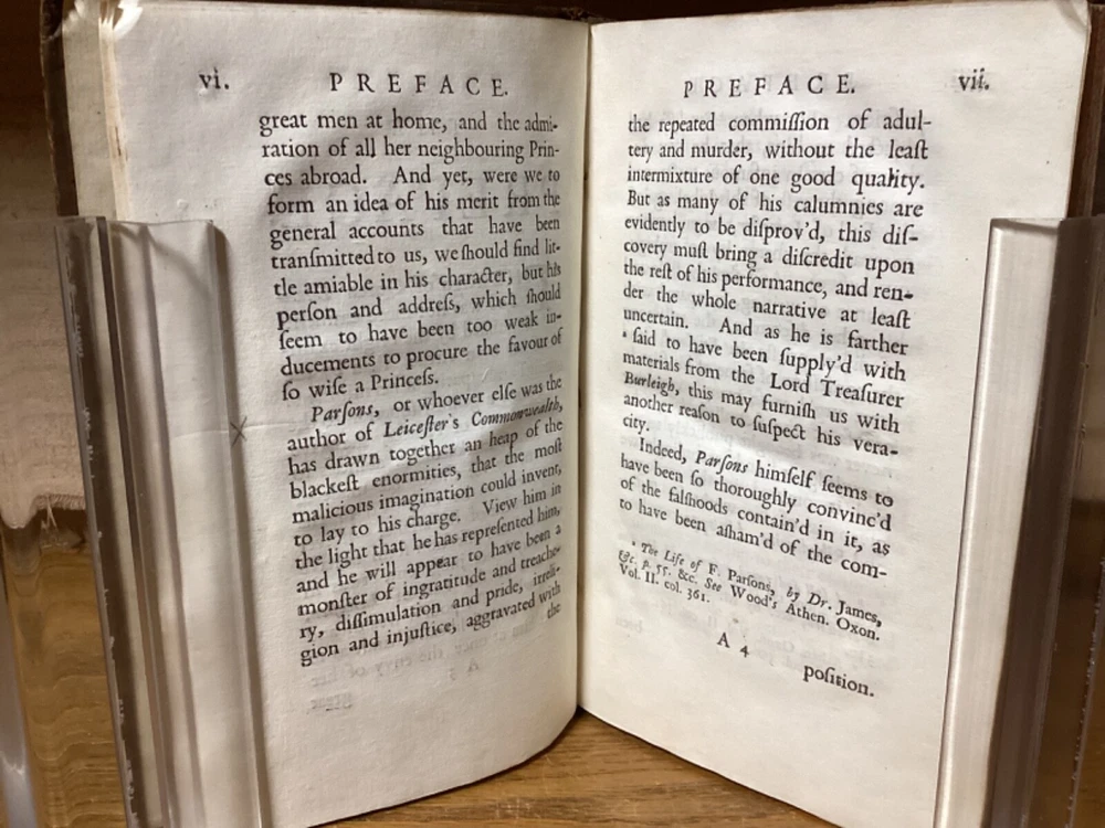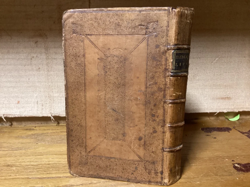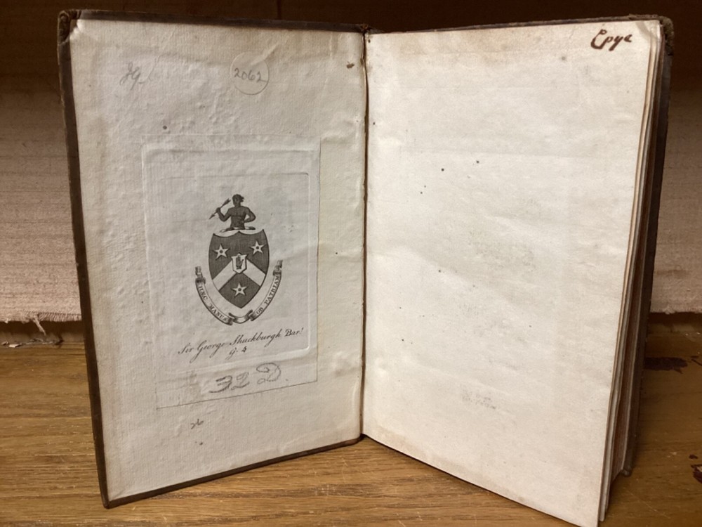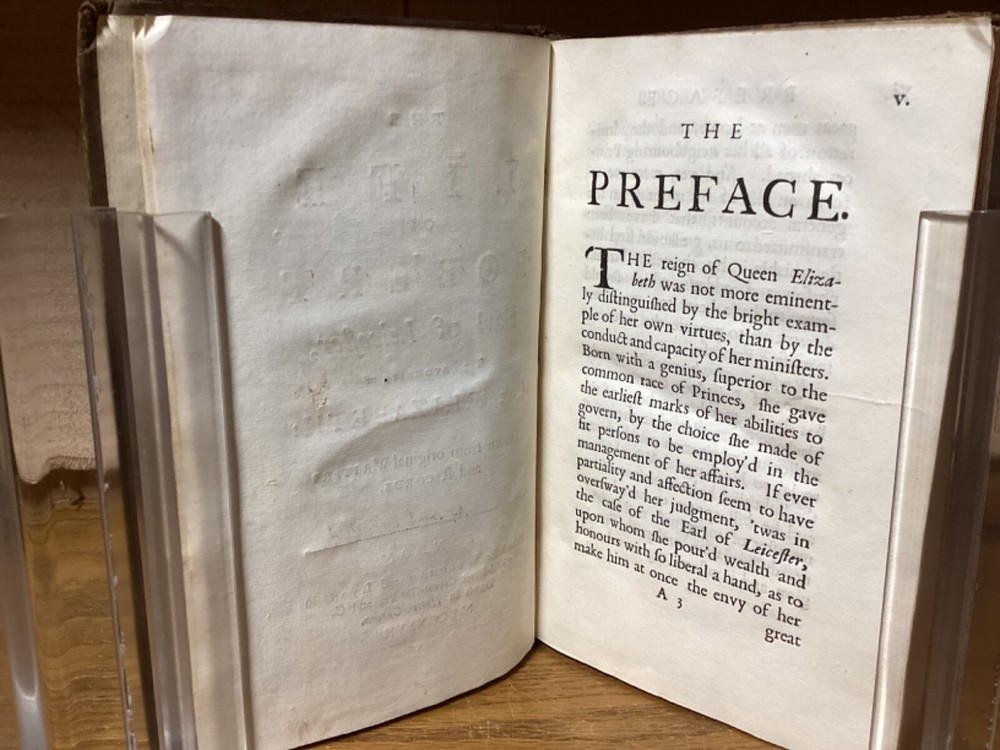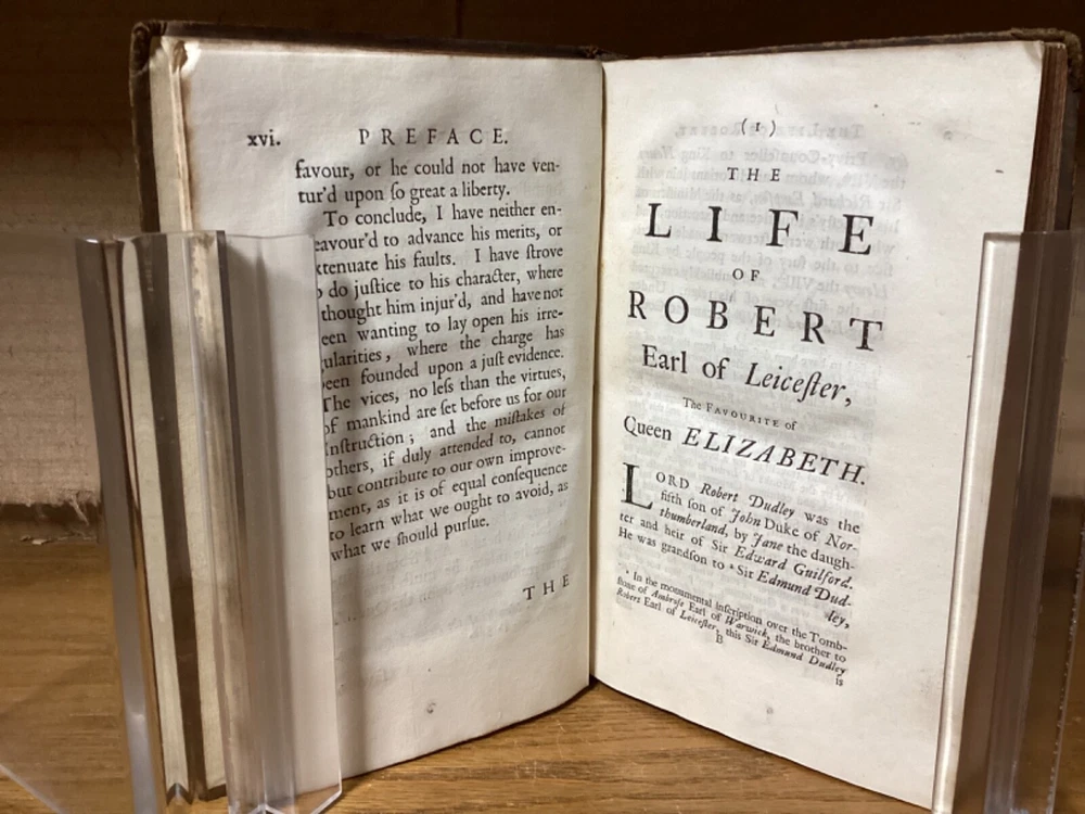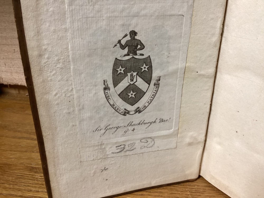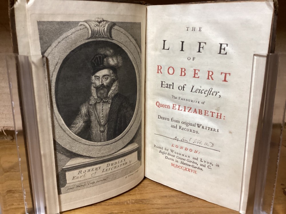 The Life of Robert, Earl of Leicester, the Favourite of Queen Elizabeth: Drawn from Original Writers and Records. Printed in London for Woodman, Lyon, and C. Davis. Attributed to Robert Dudley and Samuel Jen. 1727. 289 pp. + index. 7.25” x 5”. Hardcover tooled full leather. In good condition, with light scuffing and wear to exterior. Light loss to edges and corners. Light rubbing and cracking to hinges at front and rear. Text block remains bound well. Frontispiece adjacent to title page. Bookplate on front pastedown. General age-related toning to pages, along with periodic foxing and wear. Please see photographs and ask any questions prior to purchasing. An attractive and scarce piece on the life of Robert, Earl of Leicester. From the library of English politician, astronomer, and mathematician George Shuckburgh-Evelyn (1751-1804), of whom a crater on the moon’s near side is named for. COLH1727DJLX