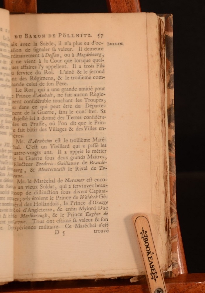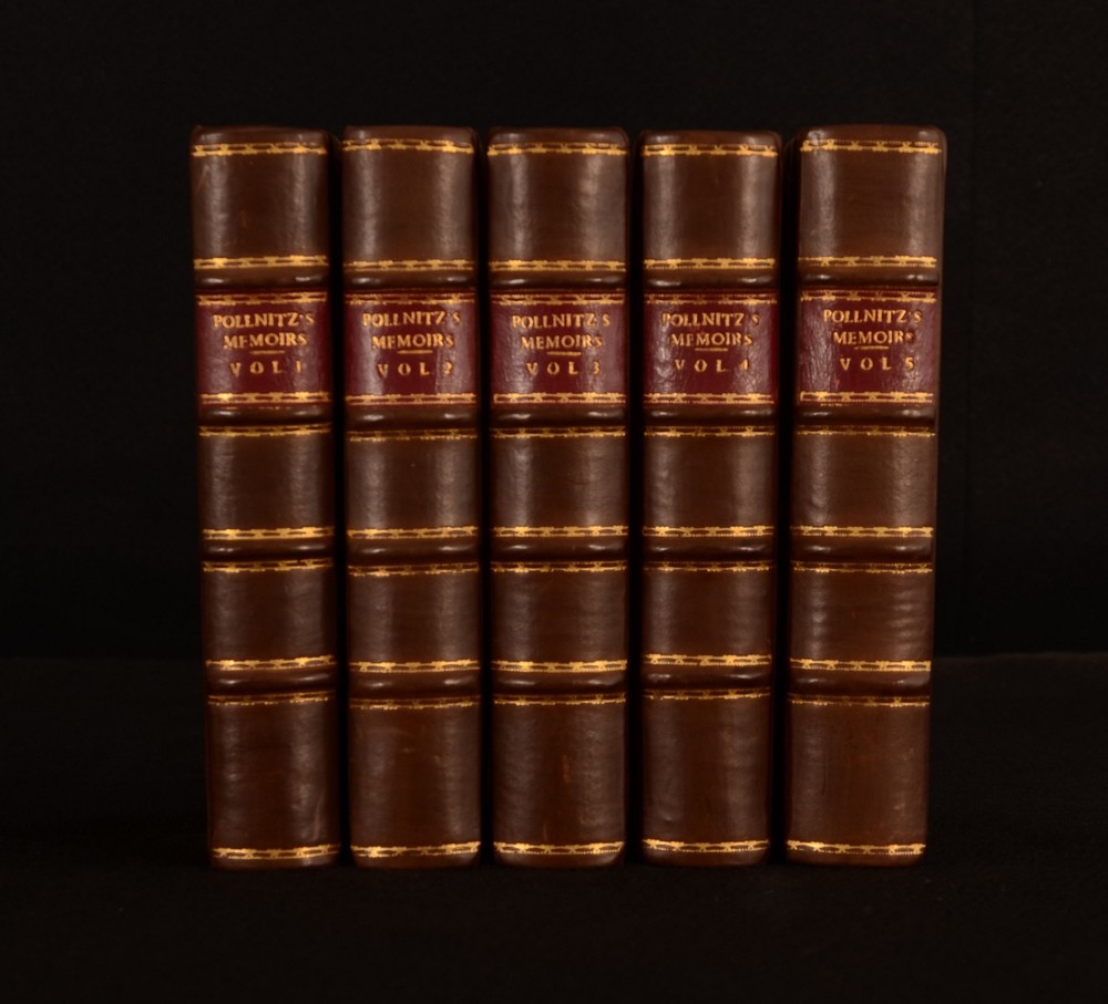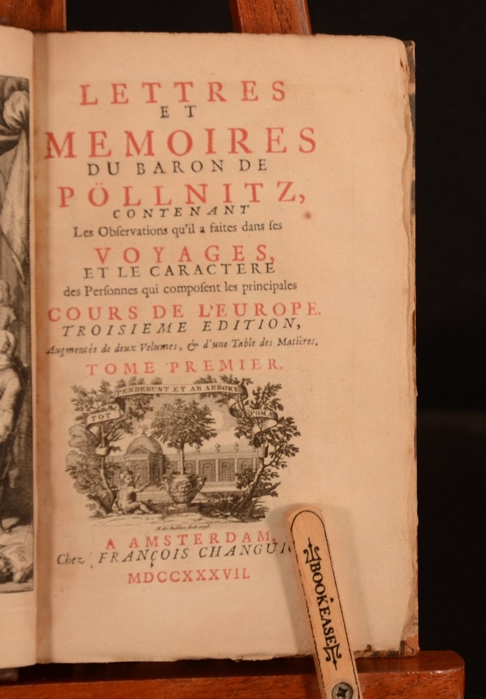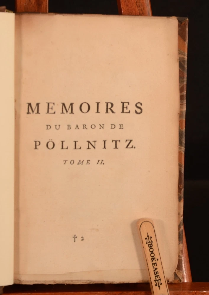 Click here to see our other books! Lettres et Memoires du Baron de Pollnitz Contenant Les Observations Qu'il a Faites dans Ses Voyages et Le Caractere des Personnes qui Composent Les Principales Cours de L'Europe Baron de Pollnitz 1737 Francois Changuion : Amsterdam 7" by 4.5" [5], vi-xii, 403pp, [1]; 418pp; 436pp; 488pp; 434pp, [44] SUMMARY The memoirs of German adventurer, Charles-Lewis, Baron de Pollnitz. The third French edition of this work, in five volumes. Rebound in a lovely quarter calf binding with marbled paper boards. Early Edition,Fine Binding,Leather Binding,Rebound Overall Condition: Near Fine This book weighs 3 KG when packed UK Postage: £ 3.99 US Postage: £ 36.99 EU Postage : £ 25.99 European Postage: £ 27.99 Asia Postage: £ 47.99 Worldwide Postage: £ 69.99 DESCRIPTION With an engraved frontispiece to the first volume and engraved title page vignettes to all volumes. The third edition of this work, in the original French. With half-title to vols II, III and V. Half title to volume V states 'Tome II'. End of vol V states 'Fin de Tome II'. The final leaf of vol IV states 'fin de Tome I'. These five volumes are the observations the Baron of Pollnitz made during his late travels from Prussia through Germany, Italy, France, Holland, England and more. They are told through his letters to his friends and notable members in various courts. Charles-Lewis, Baron de Pollnitz, otherwise known as Karl Ludwig Freiherr von Pollnitz, was a German adventurer and writer from Issum. His memoirs give a great insight into interesting people in his life and his travels. A well preserved eighteenth century copy of this fascinating travel work. CONDITION In a quarter calf binding with marbled paper boards. Rebound. Externally, excellent with minor shelfwear. Internally, all volumes are firmly bound. Pages are generally bright with just the odd spots. Page 130 to vol III is misprinted as 330 as called for. Overall Condition: Near Fine GLOSSARY OF TERMS Overall Condition (Dustwrapper condition rating is shown after that for the book itself, where a dustwrapper is present) Fine - Very well preserved copy showing very little wear Very Good Indeed - Only one or two minor faults, really a very attractive copy Very Good - Quite a wide term meaning no major faults but probably several smaller ones often expected given the age of the book, but still a respectable copy Good - Meaning not very good. Some more serious faults as will be described in the condition report under 'condition' Good Only - Meaning one or more faults that could really do with repair Fair - As with good only above but with other faults leaving a compromised copy even after repair Poor - Really bad and possibly seriously incomplete. We only sell books in this condition where their rarity or value makes them attractive none the less. Major defects will be described. GUARANTEE We offer a full money back guarantee on our descriptions. Please ask for details and conditions. We prefer PAYPAL. If you pay via PAYPAL we will post the item off the same or the next working day with the postage you have selected. Please note we cannot accept USD cheques