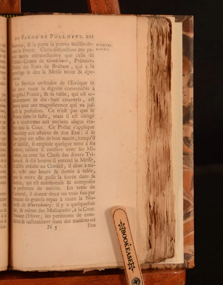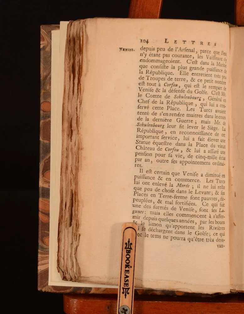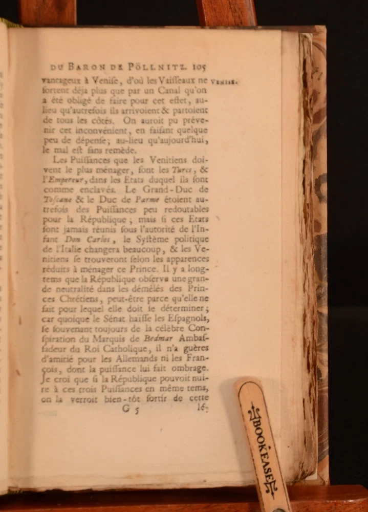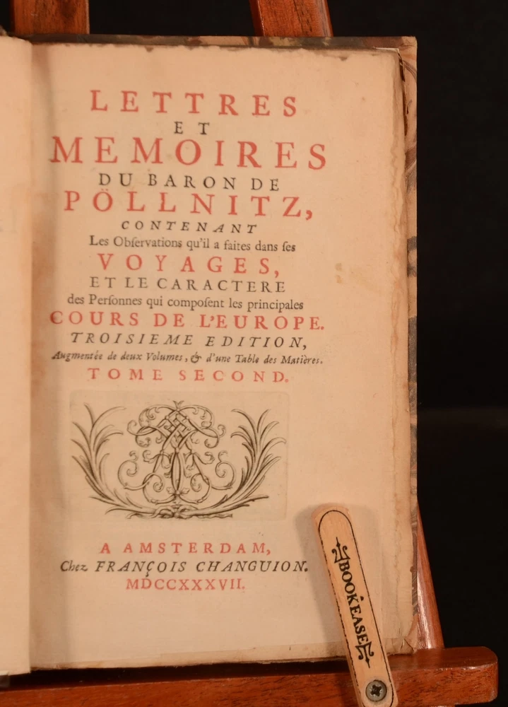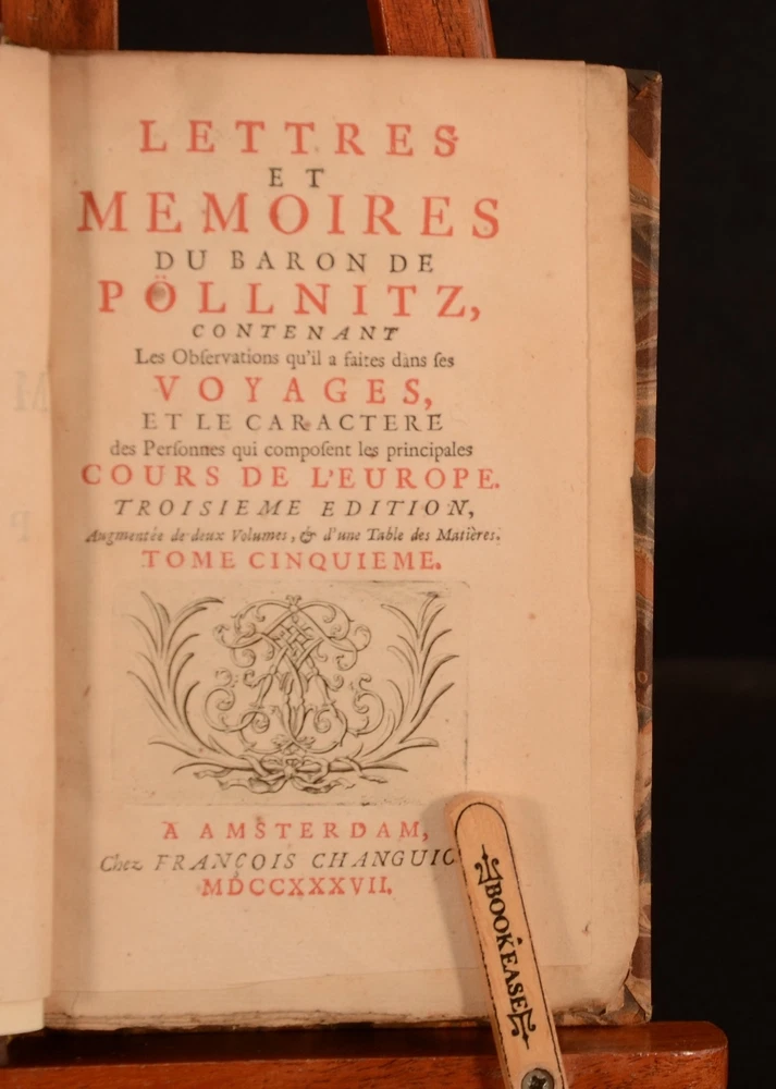 Click here to see our other books! Lettres et Memoires du Baron de Pollnitz Contenant Les Observations Qu'il a Faites dans Ses Voyages et Le Caractere des Personnes qui Composent Les Principales Cours de L'Europe Baron de Pollnitz 1737 Francois Changuion : Amsterdam 7" by 4.5" [5], vi-xii, 403pp, [1]; 418pp; 436pp; 488pp; 434pp, [44] SUMMARY The memoirs of German adventurer, Charles-Lewis, Baron de Pollnitz. The third French edition of this work, in five volumes. Rebound in a lovely quarter calf binding with marbled paper boards. Early Edition,Fine Binding,Leather Binding,Rebound Overall Condition: Near Fine This book weighs 3 KG when packed UK Postage: £ 3.99 US Postage: £ 36.99 EU Postage : £ 25.99 European Postage: £ 27.99 Asia Postage: £ 47.99 Worldwide Postage: £ 69.99 DESCRIPTION With an engraved frontispiece to the first volume and engraved title page vignettes to all volumes. The third edition of this work, in the original French. With half-title to vols II, III and V. Half title to volume V states 'Tome II'. End of vol V states 'Fin de Tome II'. The final leaf of vol IV states 'fin de Tome I'. These five volumes are the observations the Baron of Pollnitz made during his late travels from Prussia through Germany, Italy, France, Holland, England and more. They are told through his letters to his friends and notable members in various courts. Charles-Lewis, Baron de Pollnitz, otherwise known as Karl Ludwig Freiherr von Pollnitz, was a German adventurer and writer from Issum. His memoirs give a great insight into interesting people in his life and his travels. A well preserved eighteenth century copy of this fascinating travel work. CONDITION In a quarter calf binding with marbled paper boards. Rebound. Externally, excellent with minor shelfwear. Internally, all volumes are firmly bound. Pages are generally bright with just the odd spots. Page 130 to vol III is misprinted as 330 as called for. Overall Condition: Near Fine GLOSSARY OF TERMS Overall Condition (Dustwrapper condition rating is shown after that for the book itself, where a dustwrapper is present) Fine - Very well preserved copy showing very little wear Very Good Indeed - Only one or two minor faults, really a very attractive copy Very Good - Quite a wide term meaning no major faults but probably several smaller ones often expected given the age of the book, but still a respectable copy Good - Meaning not very good. Some more serious faults as will be described in the condition report under 'condition' Good Only - Meaning one or more faults that could really do with repair Fair - As with good only above but with other faults leaving a compromised copy even after repair Poor - Really bad and possibly seriously incomplete. We only sell books in this condition where their rarity or value makes them attractive none the less. Major defects will be described. GUARANTEE We offer a full money back guarantee on our descriptions. Please ask for details and conditions. We prefer PAYPAL. If you pay via PAYPAL we will post the item off the same or the next working day with the postage you have selected. Please note we cannot accept USD cheques