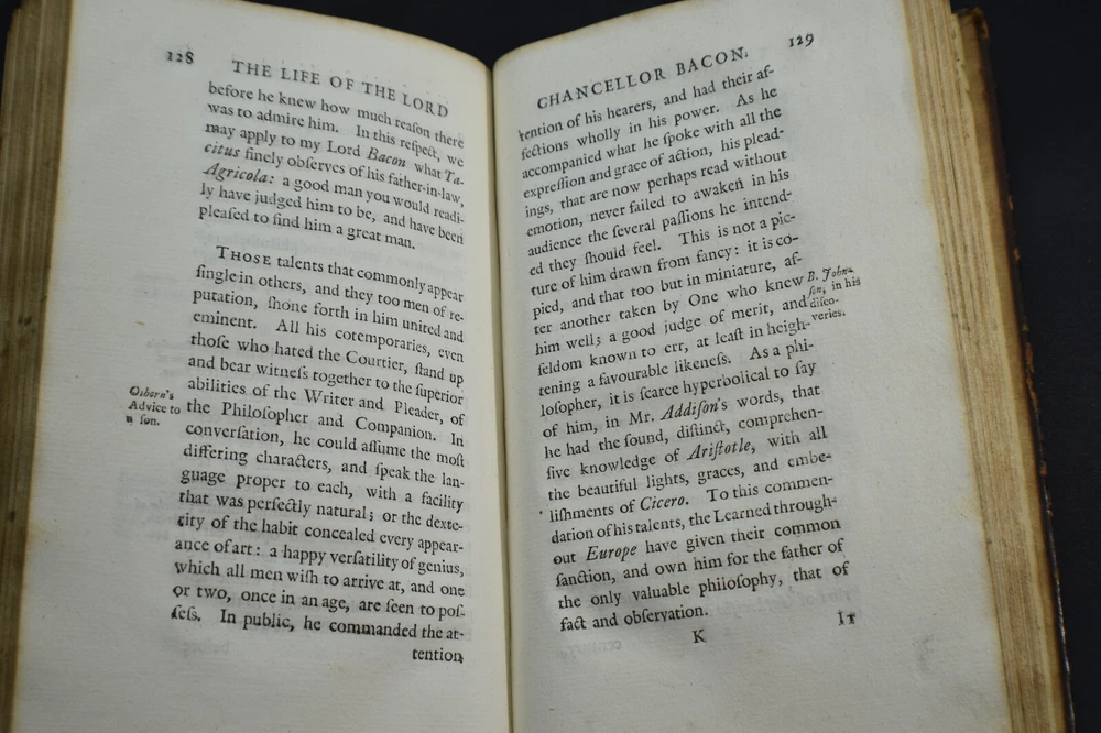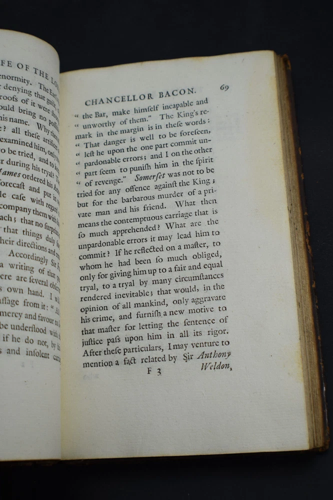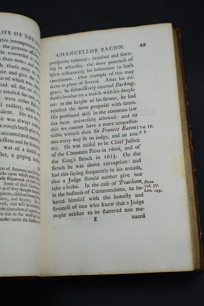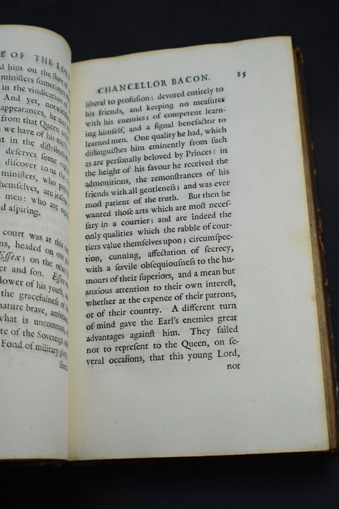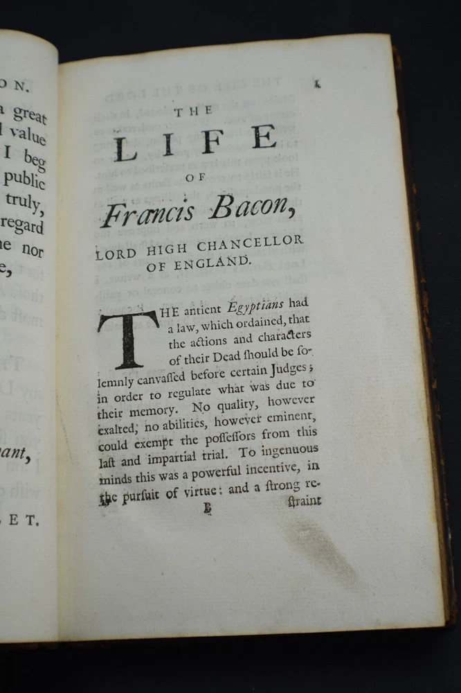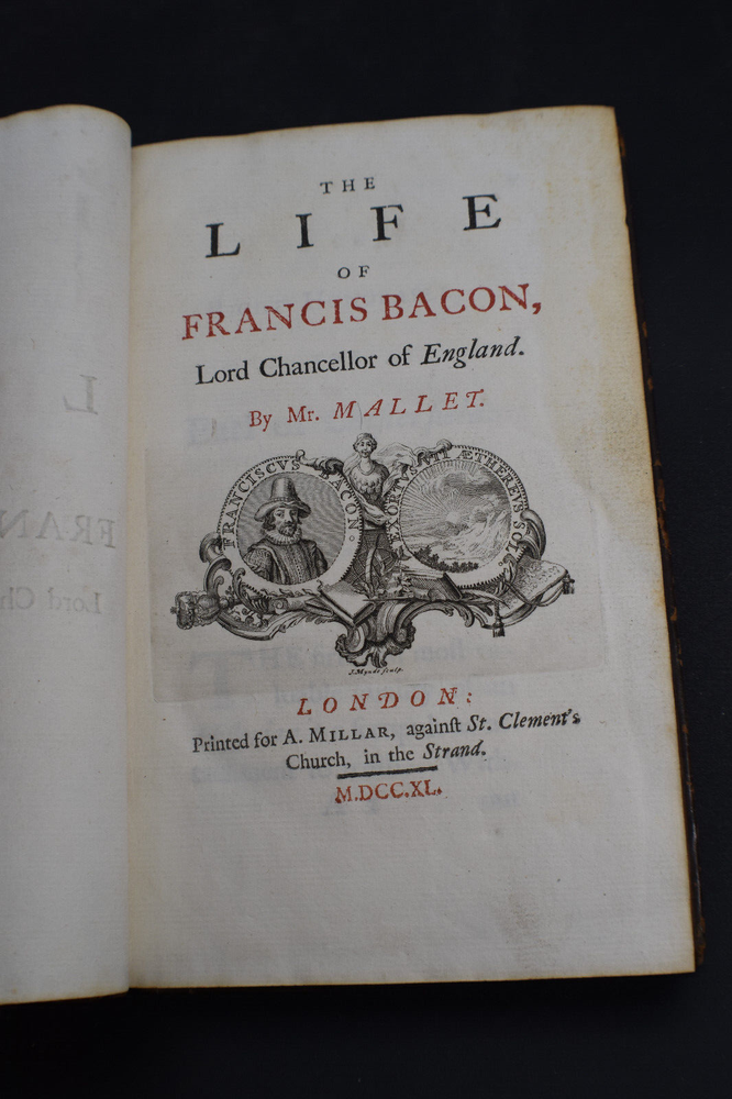 The Life of Francis Bacon, Lord Chancellor of England Mallet, David Published by A. Millar, 1740 FIRST edition illustrated title, 197 plus publisher s list, full original leather, 8 x 5.5 , 8vo Francis Bacon, 1st Viscount St Alban (22 January 1561 – 9 April 1626) , known as Lord Verulam between 1618 and 1621, was an English philosopher and statesman who served as Attorney General and Lord Chancellor of England under King James I. Bacon led the advancement of both natural philosophy and the scientific method, and his works remained influential even in the late stages of the Scientific Revolution. Bacon has been called the father of empiricism. He argued for the possibility of scientific knowledge based only upon inductive reasoning and careful observation of events in nature. He believed that science could be achieved by the use of a sceptical and methodical approach whereby scientists aim to avoid misleading themselves. Although his most specific proposals about such a method, the Baconian method, did not have long-lasting influence, the general idea of the importance and possibility of a sceptical methodology makes Bacon one of the later founders of the scientific method. His portion of the method based in scepticism was a new rhetorical and theoretical framework for science, whose practical details are still central to debates on science and methodology. He is famous for his role in the scientific revolution, promoting scientific experimentation as a way of glorifying God and fulfilling scripture. Bacon was a patron of libraries and developed a system for cataloguing books under three categories – history, poetry, and philosophy – which could further be divided into specific subjects and subheadings. About books he wrote: "Some books are to be tasted; others swallowed; and some few to be chewed and digested." The Shakespearean authorship thesis, a fringe theory which was first proposed in the mid-19th century, contends that Bacon wrote at least some and possibly all of the plays conventionally attributed to William Shakespeare. Bacon was educated at Trinity College at the University of Cambridge, where he rigorously followed the medieval curriculum, which was presented largely in Latin. He was the first recipient of the Queen's counsel designation, conferred in 1597 when Elizabeth I reserved him as her legal advisor. After the accession of James I in 1603, Bacon was knighted, then created Baron Verulam in 1618 and Viscount St Alban in 1621. He had no heirs, and so both titles became extinct on his death of pneumonia in 1626 at the age of 65. He is buried at St Michael's Church, St Albans, Hertfordshire. See photos for condition details. Front outer hinge showing & weak, shelf wear, Due to high loss in shipping to certain countries, insurance is required for shipping to a location that does not provide tracking PLEASE READ THE RETURN POLICY BELOW: RETURNS are seldom made, I have been on for many years and Buyers satisfaction is important to me. This is why I provide good description, detailed photos and request questions from you to help you make the right choice to eliminate returns. Please read the description and view detailed photos. Please ask questions if you have particular needs or need clarification. Communication is important, this helps eliminate returns and any confusion or buyers with particular needs, so please do not assume I know what you are looking for unless you tell me. NOTE: If purchasing multiple items, please do so by using the Ebay Shopping Cart, then select "Request Total for Seller" for the corrected shipping on a new invoice. Do not pay for the items before receiving this corrected invoice.