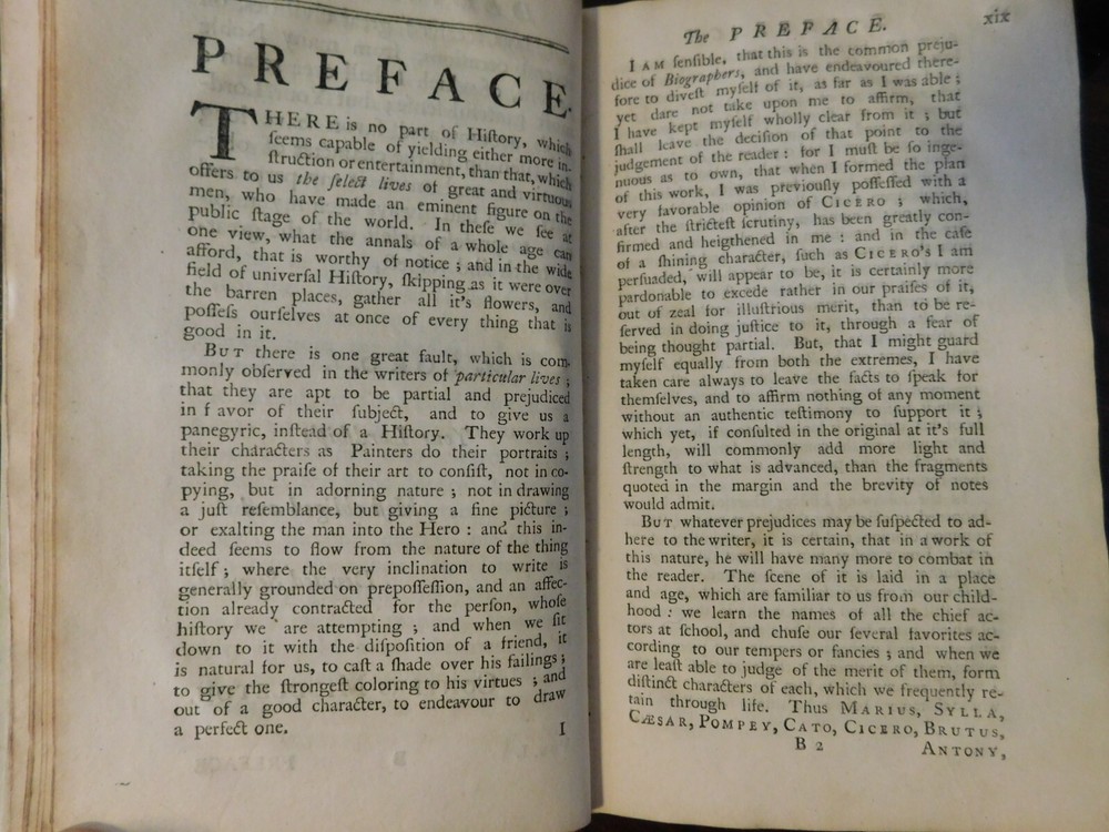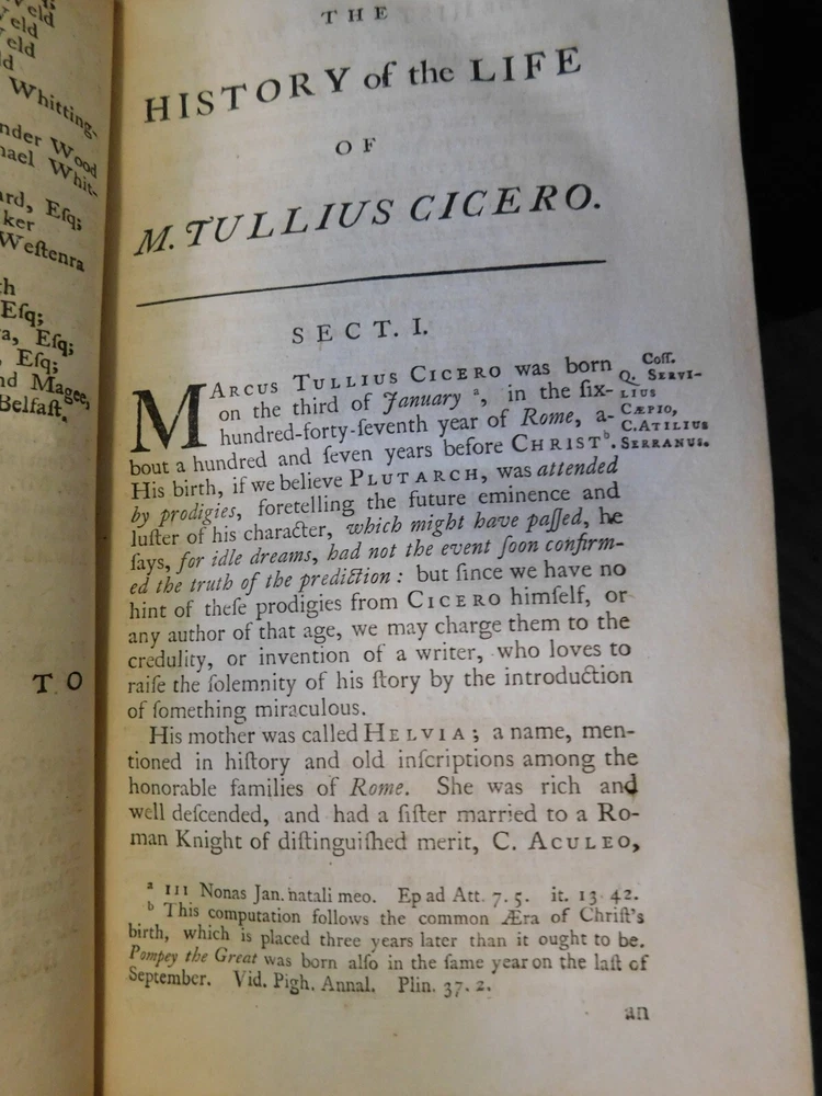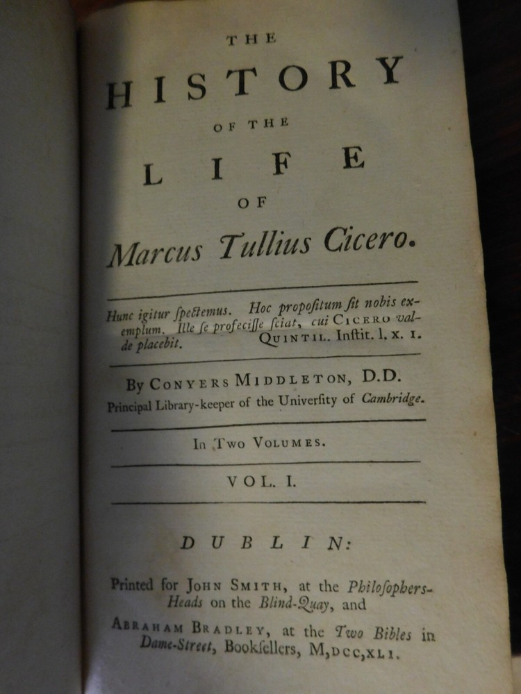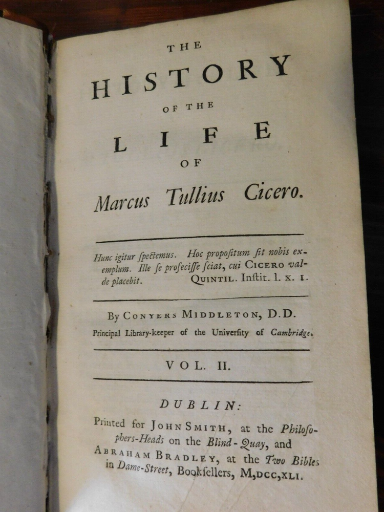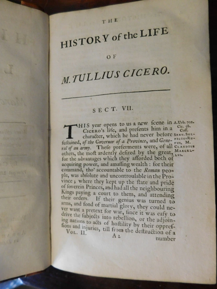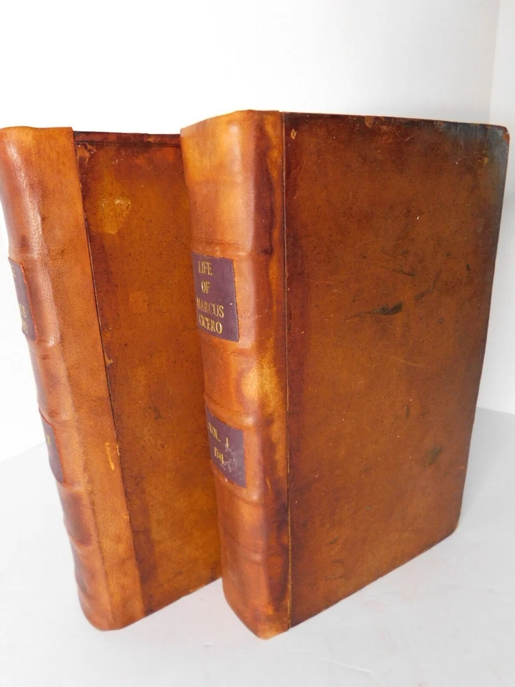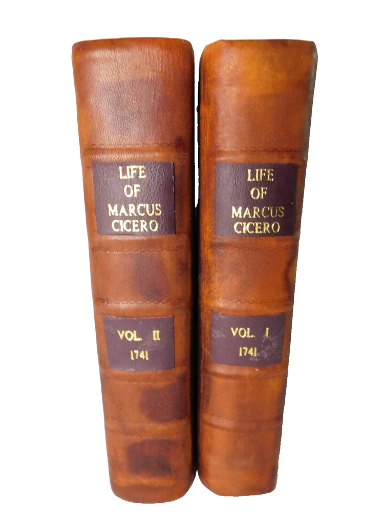 Description: An outstanding and quite scarce two volume set of the 1741 first Dublin edition of the book most consider the finest biography every written about Marcus Cicero the greatest orator of the late Roman Republic, and one of the most influential men and leading political figures in the time of Julius Ceasar. Printed in Dublin for John Smith and Abraham Bradley in the same year as the first London edition. Condition: 8vo. Volume 1 (548 pages plus the Index) Volume 2 (664 pages including the Index) - Attractive full leather binding recently restored with new leather spine and black leather spine labels stamped in gilt with endpapers refreshed. Wear to edges, corners bumped with a few scrapes and scratches to the original leather boards. The binding is tight, the book is square, and the interior is in a remarkably well-preserved state with the pages clean, bright and white and free of the usual foxing and toning. Overall, a very good or better copy of this important work and one of the finest examples in the market today.