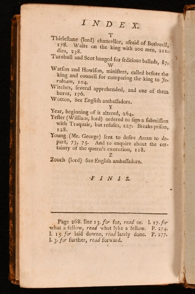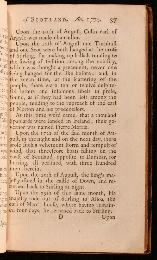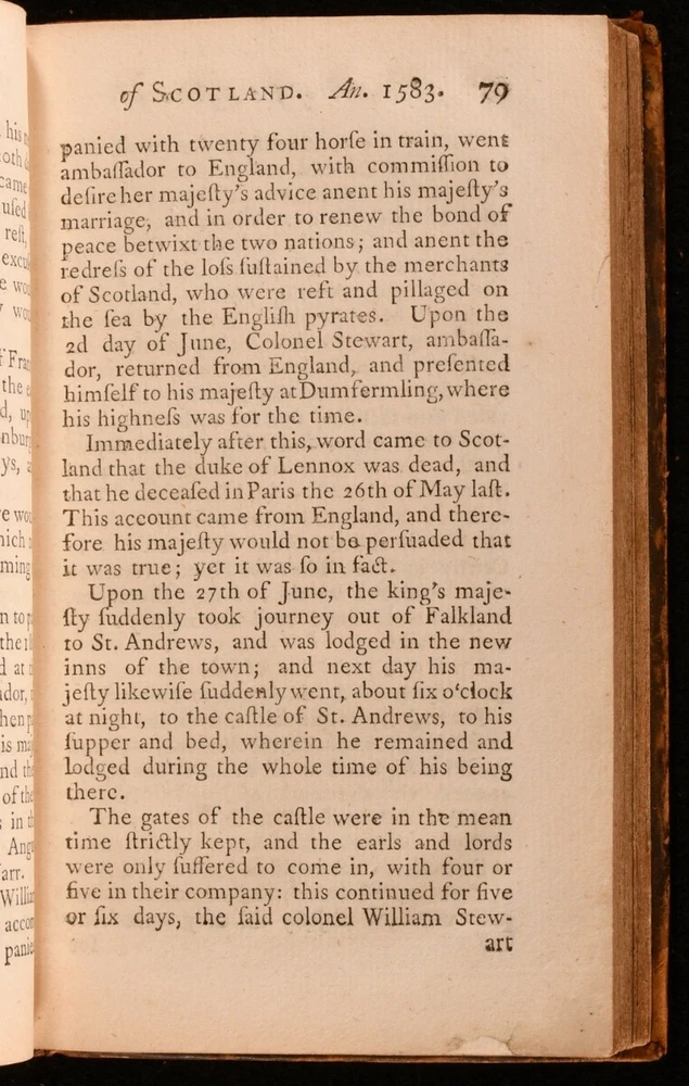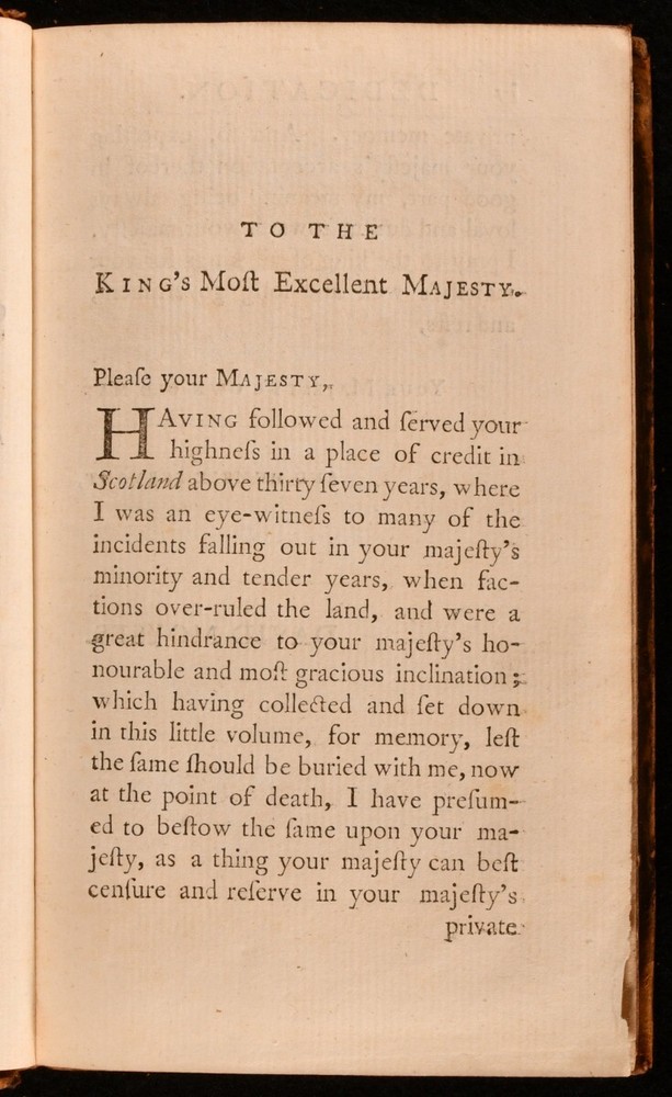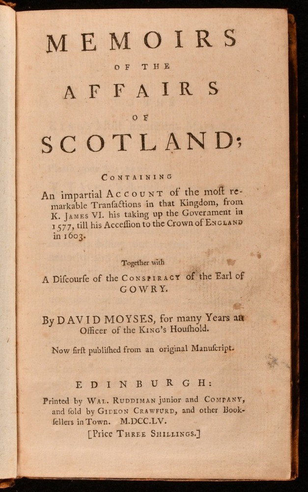 Click here to see our other books! Memoirs of the Affairs of Scotland David Moyses [David Moysie] 1755 Wal. Ruddiman Junior and Company : Edinburgh 7.5" by 4.5" 2-320 [14]pp SUMMARY The scarce first edition of David Moysie's memoirs of Scotland under the reign of James VI at the close of the sixteenth century. First Edition,Leather Binding,Scarce Overall Condition: Very Good This book weighs 0.5 KG when packed UK Postage: £ 3.99 US Postage: £ 15.99 EU Postage : £ 13.99 European Postage: £ 14.99 Asia Postage: £ 18.99 Worldwide Postage: £ 19.99 DESCRIPTION The first edition of Scottish notary public David Moysie's study of the political history of Scotland from the year 1577 to 1603, under the reign of King James VI. Moysie's work is a contemporary first hand account of the years covered, with his memoirs - the records of an eyewitness - surviving in manuscript form only until this mid eighteenth century publication. With a fourteen page index to the rear, as called for. ESTC reference no. N26028 With an inscription, dated 1875, to the front free endpaper. A smart full calf copy of this scarce volume, the work of a man described as 'for many years an officer of the King's Household'. CONDITION In a full calf binding, with gilt detailing to back strip. Light rubbing to board perimeters and back strip head and tail. Front and rear hinges starting, with boards holding firm. Contemporary inscription and amateur artwork to front free endpaper. Light spotting to title page. Pages otherwise clean and bright. Overall Condition: Very Good GLOSSARY OF TERMS Overall Condition (Dustwrapper condition rating is shown after that for the book itself, where a dustwrapper is present) Fine - Very well preserved copy showing very little wear Very Good Indeed - Only one or two minor faults, really a very attractive copy Very Good - Quite a wide term meaning no major faults but probably several smaller ones often expected given the age of the book, but still a respectable copy Good - Meaning not very good. Some more serious faults as will be described in the condition report under 'condition' Good Only - Meaning one or more faults that could really do with repair Fair - As with good only above but with other faults leaving a compromised copy even after repair Poor - Really bad and possibly seriously incomplete. We only sell books in this condition where their rarity or value makes them attractive none the less. Major defects will be described. GUARANTEE We offer a full money back guarantee on our descriptions. Please ask for details and conditions. We prefer PAYPAL. If you pay via PAYPAL we will post the item off the same or the next working day with the postage you have selected. Please note we cannot accept USD cheques