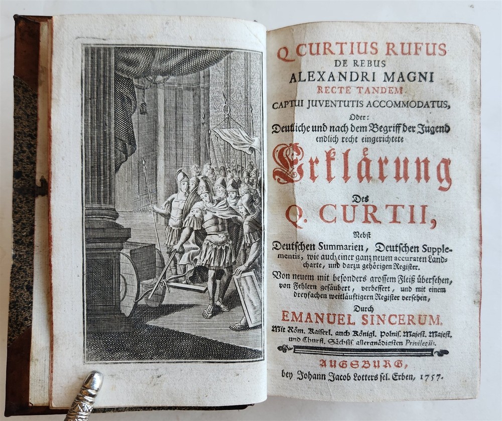 Curtius Rufus, Q. De rebus Alexandri Magni recte tandem captui juventutis accommodatus, oder: Deutliche und nach dem Begriff der Jugend endlich recht eingerichtete Erklärung des Q. Curtii,... verb. ...durch E. Sincerum. Augsburg, Lotter Erben; 1757 With engraved frontis and 1 folded copperplate map. 35 leaves, 865 pages, 78 leaves Original 3/4 leather over cardboard Rare Augsburg Lotter edition of the life of Alexander the Great. Good condition, a few spots Size 4.5 by 7" Text in Latin ============================= Please see my other auctions Thank You Refund Policy: We will issue a FULL REFUND, 100% money back if you are not satisfied with your purchase. Items must be returned to us within 20 days in order to receive a refund or replacement. Buyer is responsible for shipping costs. Powered by SixBit's eCommerce Solution