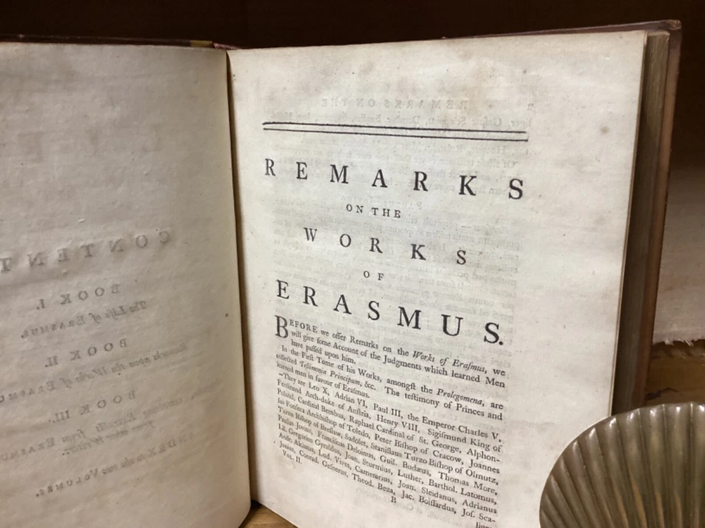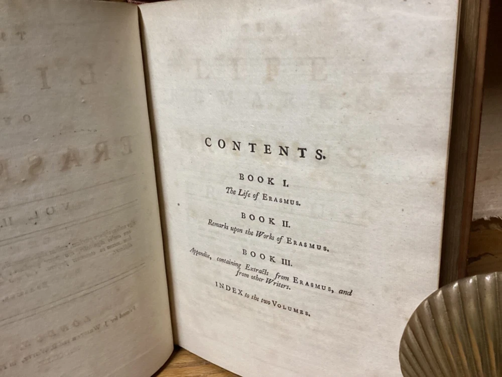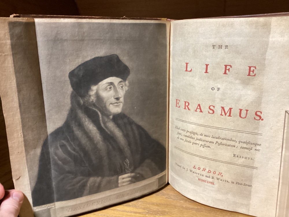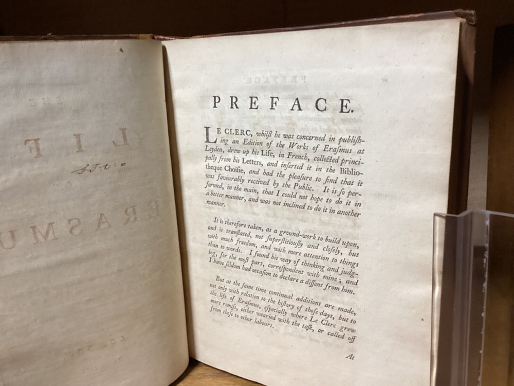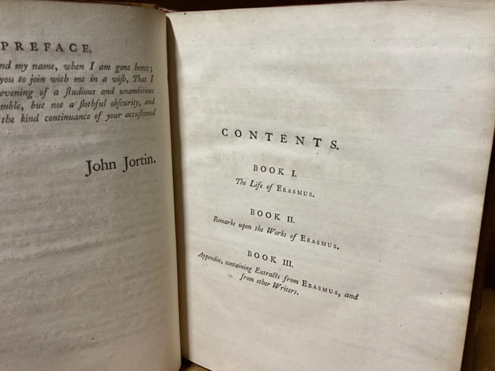 The Life of Erasmus. Written by John Jortin, et. al. Printed in London for J. Whiston and B. White. 1758. In two volumes. [6] + 630 and 753 pp. 10.5” x 6.5”. 4to. Hardcover full leather with rebacked spines. In good condition, with light scuffing and wear to exteriors. Spines attractively rebacked, with title and volume labels of Volume II replaced. Hinges remain in good condition and text block remains bound well. Ex-library from the Wilberforce Library, with library bookplate and additional ex-libris bookplate at front of each volume. Includes slightly oversized portrait frontispiece in Volume I, along with facsimile examples of Erasmus’ writing at rear of each volume. Assorted markings, primarily at front. General age-related toning to pages, along with periodic foxing and wear. Please see photographs and ask any questions prior to purchasing. A scarce and attractively preserved pair of volumes on the life of Dutch theologian Desiderius Erasmus (1466-1536). Compiled by English church historian John Jortin (1698-1770), whose other works included Christian apologetics, a short-lived magazine in the 1730s, and various pamphlets. Please note size of and weight of volumes. COLH1758FNOX