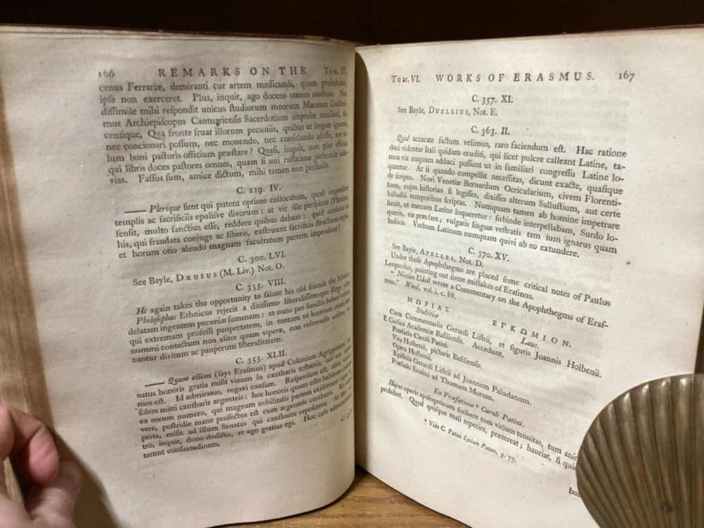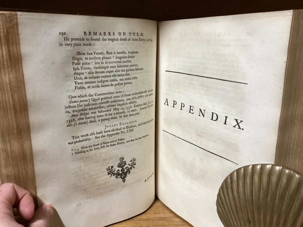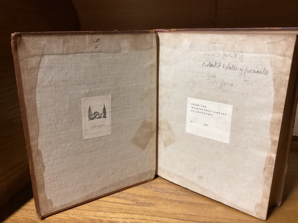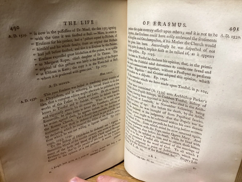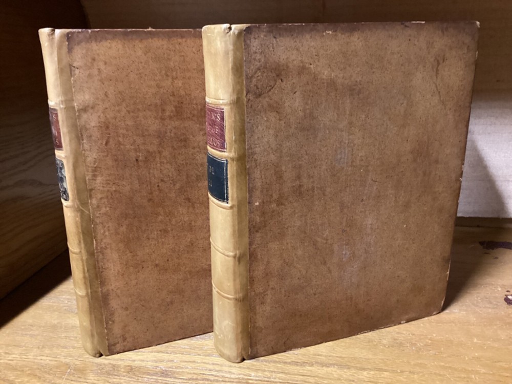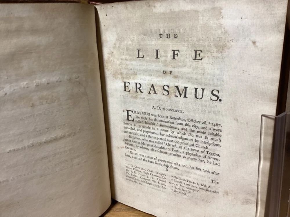 The Life of Erasmus. Written by John Jortin, et. al. Printed in London for J. Whiston and B. White. 1758. In two volumes. [6] + 630 and 753 pp. 10.5” x 6.5”. 4to. Hardcover full leather with rebacked spines. In good condition, with light scuffing and wear to exteriors. Spines attractively rebacked, with title and volume labels of Volume II replaced. Hinges remain in good condition and text block remains bound well. Ex-library from the Wilberforce Library, with library bookplate and additional ex-libris bookplate at front of each volume. Includes slightly oversized portrait frontispiece in Volume I, along with facsimile examples of Erasmus’ writing at rear of each volume. Assorted markings, primarily at front. General age-related toning to pages, along with periodic foxing and wear. Please see photographs and ask any questions prior to purchasing. A scarce and attractively preserved pair of volumes on the life of Dutch theologian Desiderius Erasmus (1466-1536). Compiled by English church historian John Jortin (1698-1770), whose other works included Christian apologetics, a short-lived magazine in the 1730s, and various pamphlets. Please note size of and weight of volumes. COLH1758FNOX