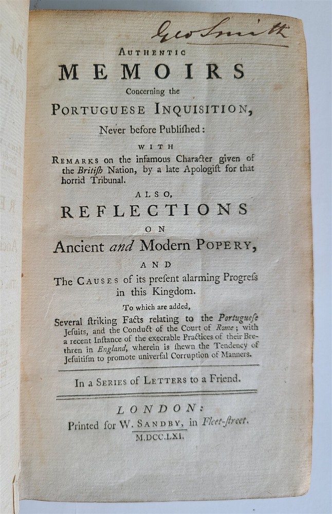 Authentic Memoirs concerning the Portuguese Inquisition, never before published: with Remarks on the infamous Character given of the British Nation, by a late Apologist for that horrid Tribunal. by Bradick, J. G. London; 1761 Size 5 by 8 1/2" original leather binding 582 pages Very good interior condition, some wear of binding Text in English ================= Please see my other auctions Thank You Refund Policy: We will issue a FULL REFUND, 100% money back if you are not satisfied with your purchase. Items must be returned to us within 20 days in order to receive a refund or replacement. Buyer is responsible for shipping costs. Powered by SixBit's eCommerce Solution