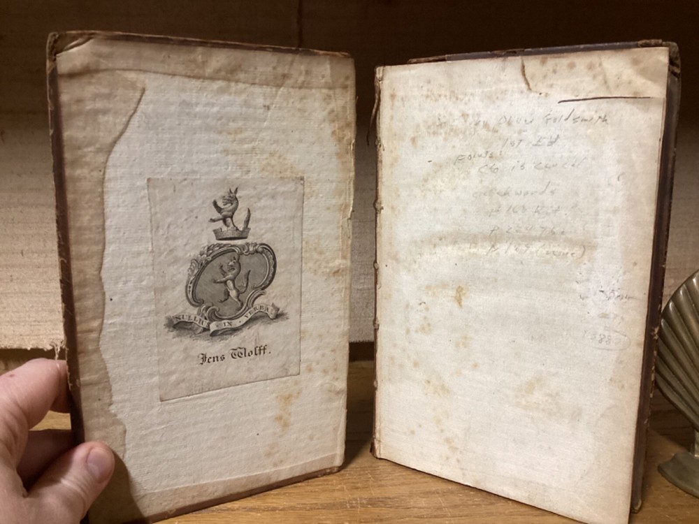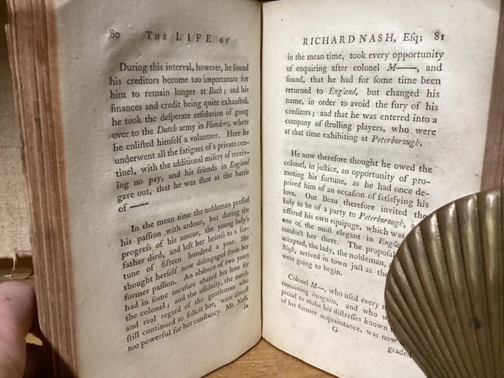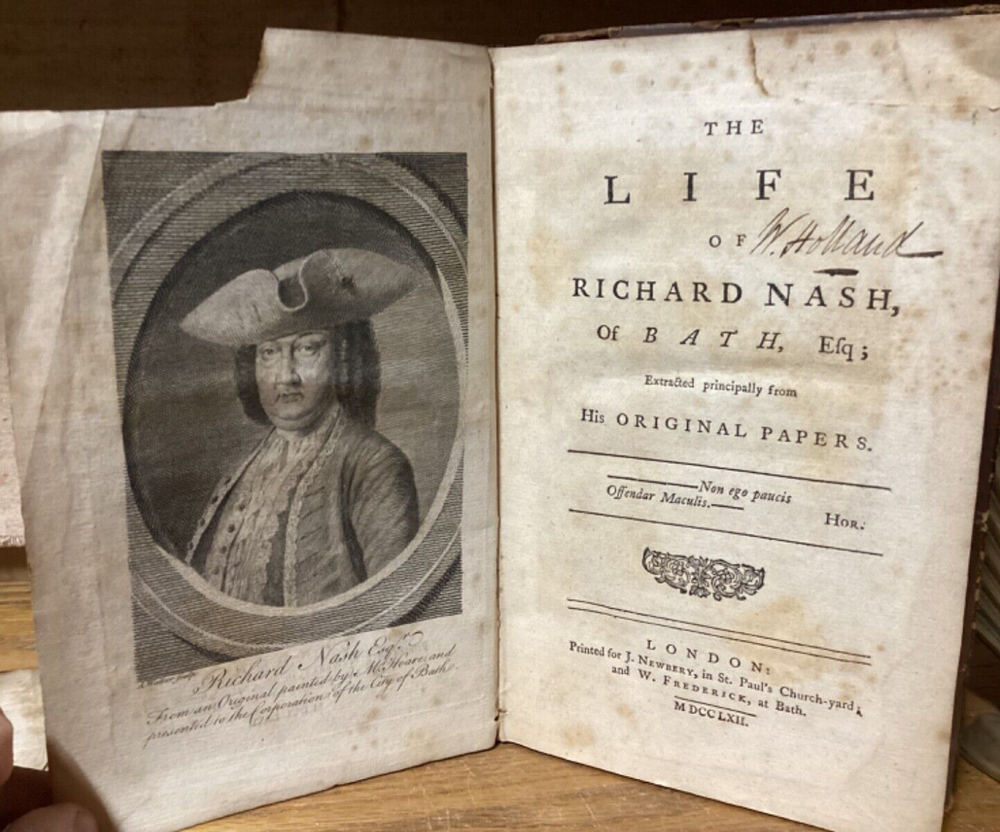 The Life of Richard Nash, of Bath, Esq; Extracted Principally form His Original Papers. Printed in London for J. New berry. 1762. [6] + 234 + [4] pp. 8” x 5”. 8vo. Hardcover full leather. As-is, with front board detached. Some cracking to rear board. Loss to some leather on spine. Text block remains in good condition, with signatures cut from top of frontispiece portrait and title page. Ex-libris bookplate affixed to front pastedown. Light pencil markings at front. General age-related toning to pages, along with periodic foxing and wear. Please see photographs and ask any questions prior to purchasing. A rather scarce piece on the life or Richard “Beau” Nash (1674-1762), a Welsh lawyer and fashion dandy who influenced 18th Century British fashion. He is also known for being the longtime master of ceremonies of Bath, which at the time was developing into a prominent resort town. A wonderful piece for restoration. FORN-SHELF-0481-XX-2502-aj3540