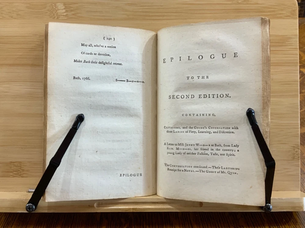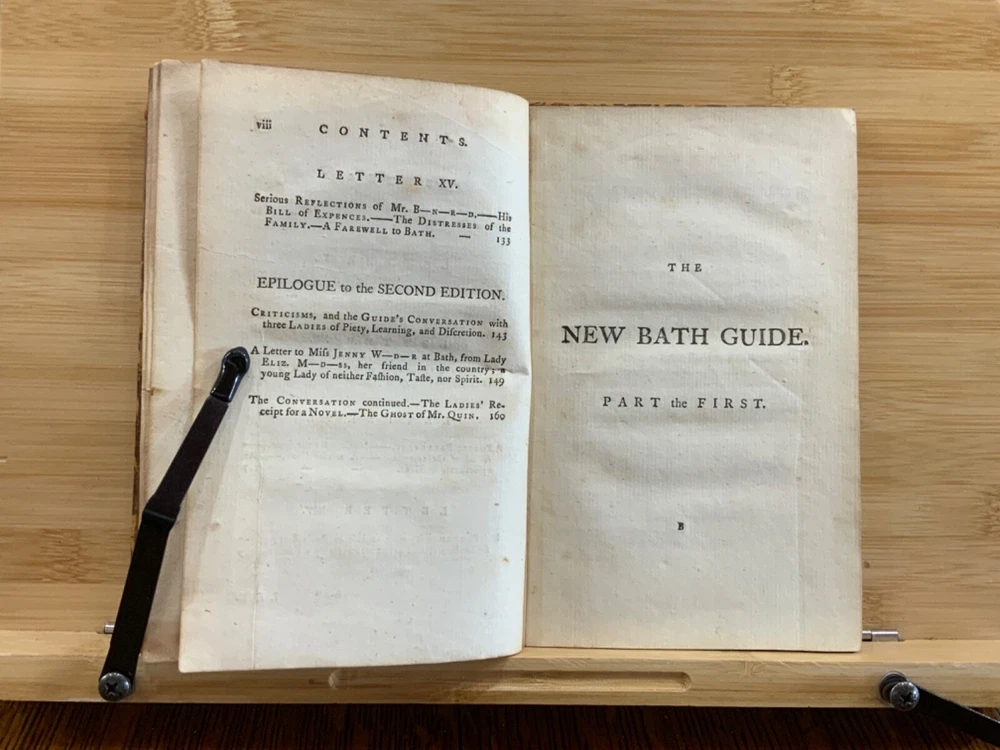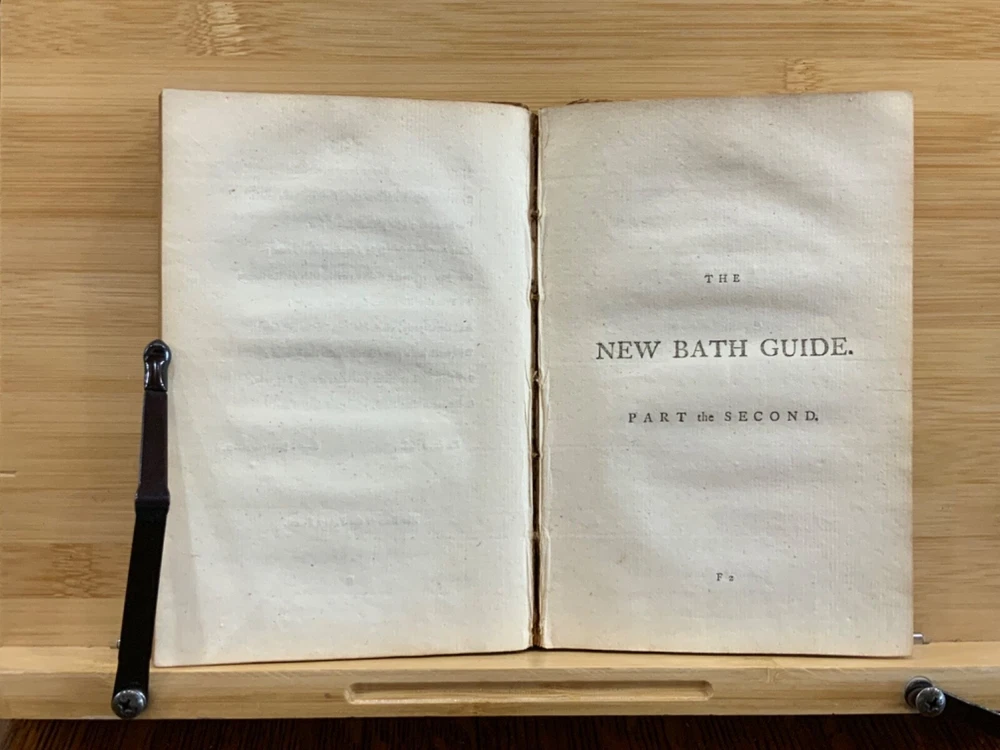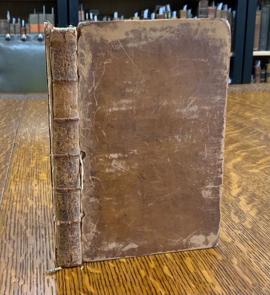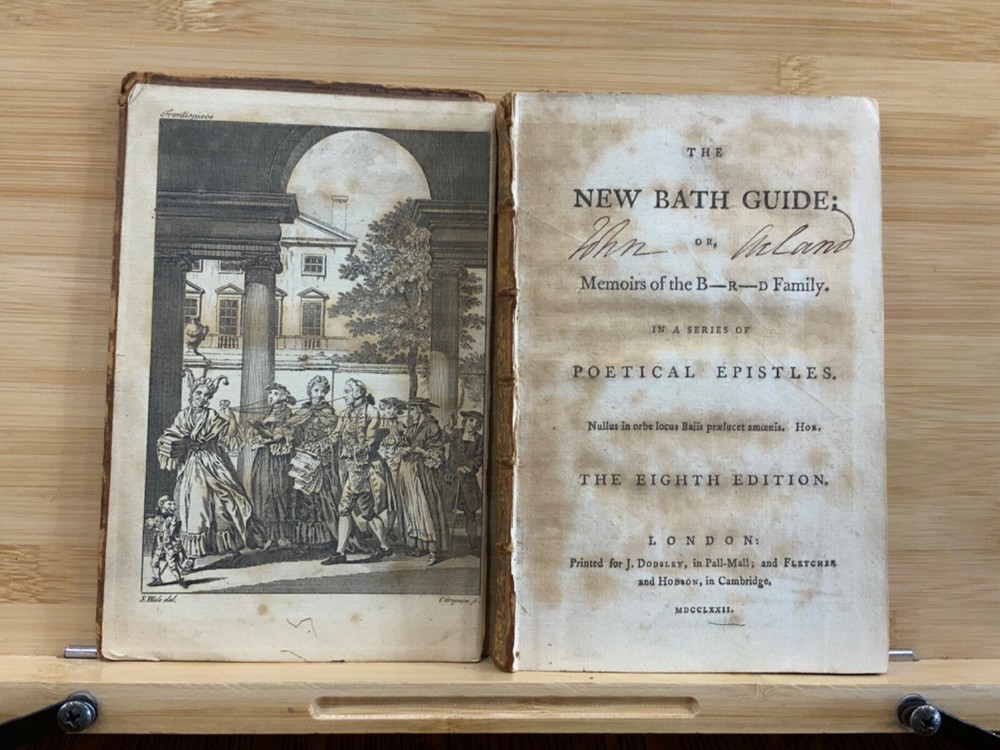 The New Bath Guide; or, Memoirs of the B-R-D Family. In a Series of Poetical Epistles. The Eighth Edition. London: Printed for J. Dodsley, and Fletcher and Hodson, 1772, full leather binding, 175 pp, 7 x 4.5", 18mo. In poor condition. As is. Both front and rear boards are detached from binding. Boards are scuffed at edges & worn/bumped at corners. Head and tail of spine lacking - binding exposed. Front end-page and frontispiece detached. Previous ownership signatures on front paste-down and title page. Toning, foxing, and age-staining throughout text-block. No known marginalia. Binding is broken. Please see photos and ask questions, if any, before purchasing. Christopher Anstey (1724-1805) was an English poet who also wrote in Latin. After a period of managing his family's estates, he moved permanently to Bath and died after a long public life there. His poem, "The New Bath Guide" brought him to fame and began an easy satirical fashion that was influential throughout the second half of the 18th century. The broad 18th century humor of the Guide inevitably met with criticism in some quarters. While the parodies and allusions to Milton, Dryden, and the Classical authors were well received, the perversion of Methodist terminology in Prudence's account of her seduction at least caused controversy. He was the first to make tourism a poetic subject since the pilgrimage depicted by Thomas Chaucer in his Canterbury Tales. FORN-MSB-1023-0761-HK814
