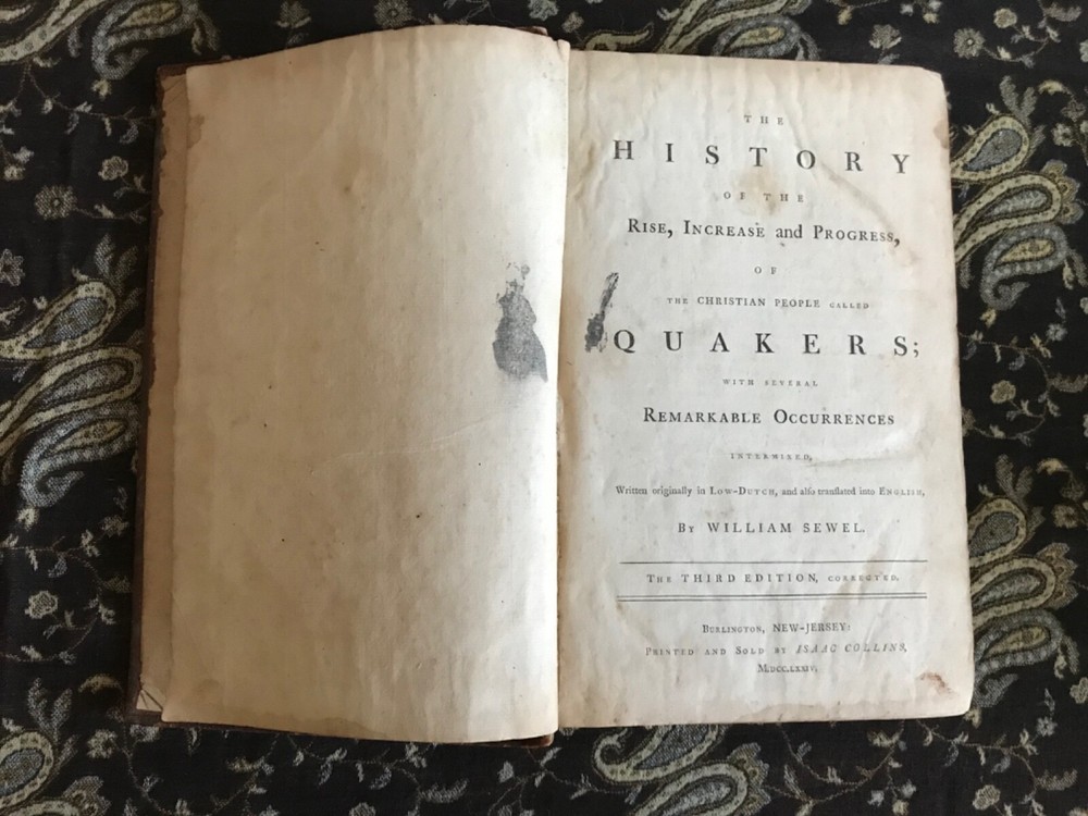 The History of the Rise, Increase and Progress, of the Christian People Called Quakers; with Several Remarkable Occurrences Intermixed. Written Originally in Low-Dutch, and also Translated into English, William Sewell, The Third Edition, Corrected. Printed and Sold by Isaac Collins, Burlington, New Jersey, 1774, 812 pp plus index, full leather, 12.75 x 8.25”, 4to. In fair condition. Boards are moderately worn with scuffing, red rot at edges and corners. Hinges cracking. Surface of leather is creasing, cracked and scratched. Top spine extreme is missing an inch of leather while bottom extreme is missing 2.5” inches. Errata on paste down with signature written in blue ink and old hand pencil signature of John Way, Landsdowne PA on flyleaf. Interior typically toned with light foxing. Fingersoiling on a few leaves and small ink stains.. free of markings otherwise. Binding remains tight and intact. A solid, complete copy. Please see photos. True Colonial America imprint! Willem Sewel (1654-1720) was a Dutch Quaker historian, of English background. Sewel spent 25 years on his major work, The History of the Rise, Increase, and Progress of the Christian People called Quakers . It was first published in Dutch, as Histori van de Opkompste, Aanwas en Voortgang der Christenen bekend by den naam van Quakers , Amsterdam, 1717 (another edition, 1742). The English edition (London, 1722), dedicated to George I, was largely undertaken to correct Historia Quakeriana (Amsterdam, 1695; English translation, London, 1696, by Gerard Croese , to whom Sewel had given letters and narratives from England). Sewel's own work was based on a mass of correspondence, George Fox’s Journal , and, for the public history, Lord Clarendon’s Rebellion and Edmund Ludlow’s Memoirs . It became an authority. RAREA1774DKLL