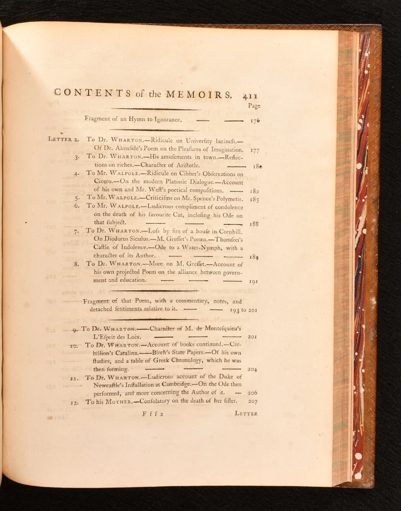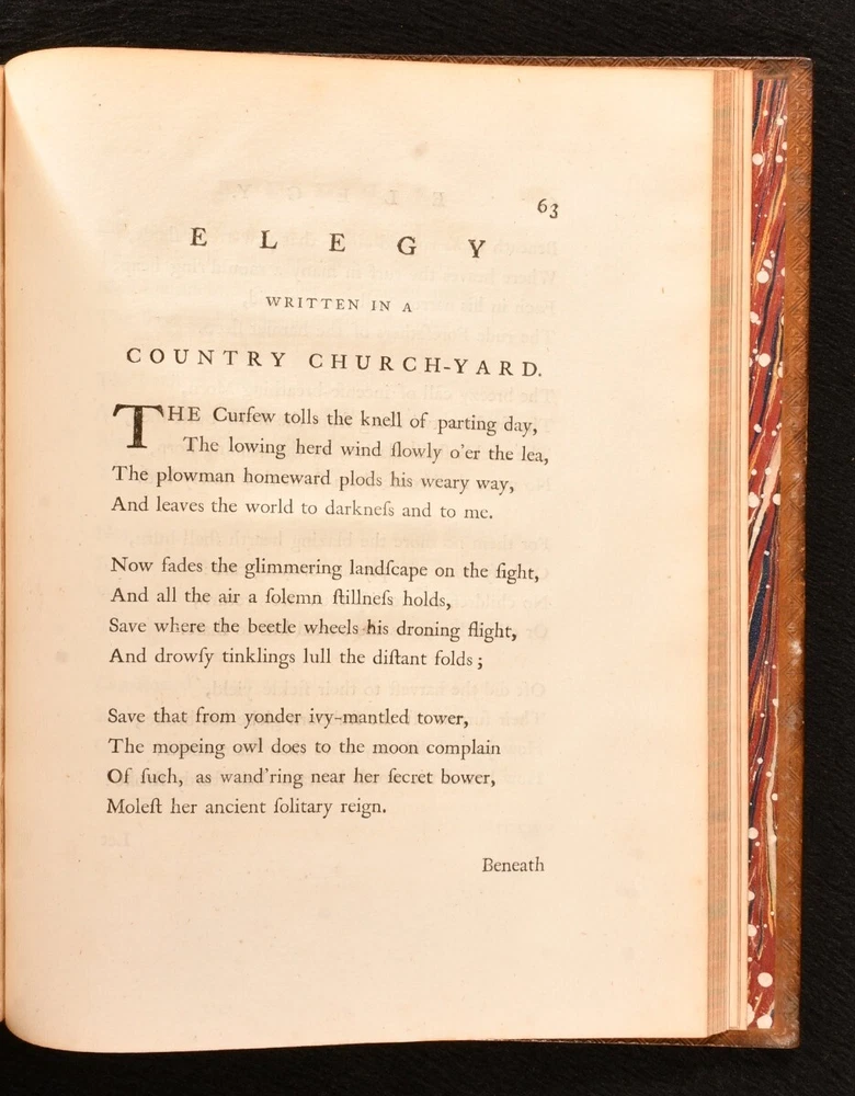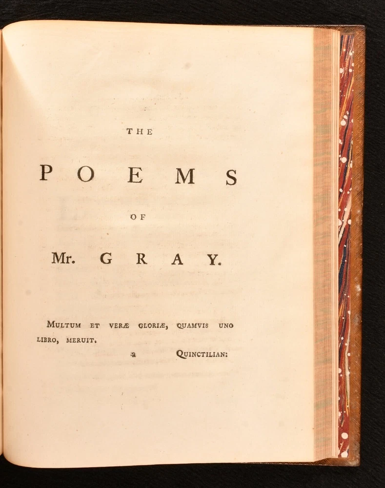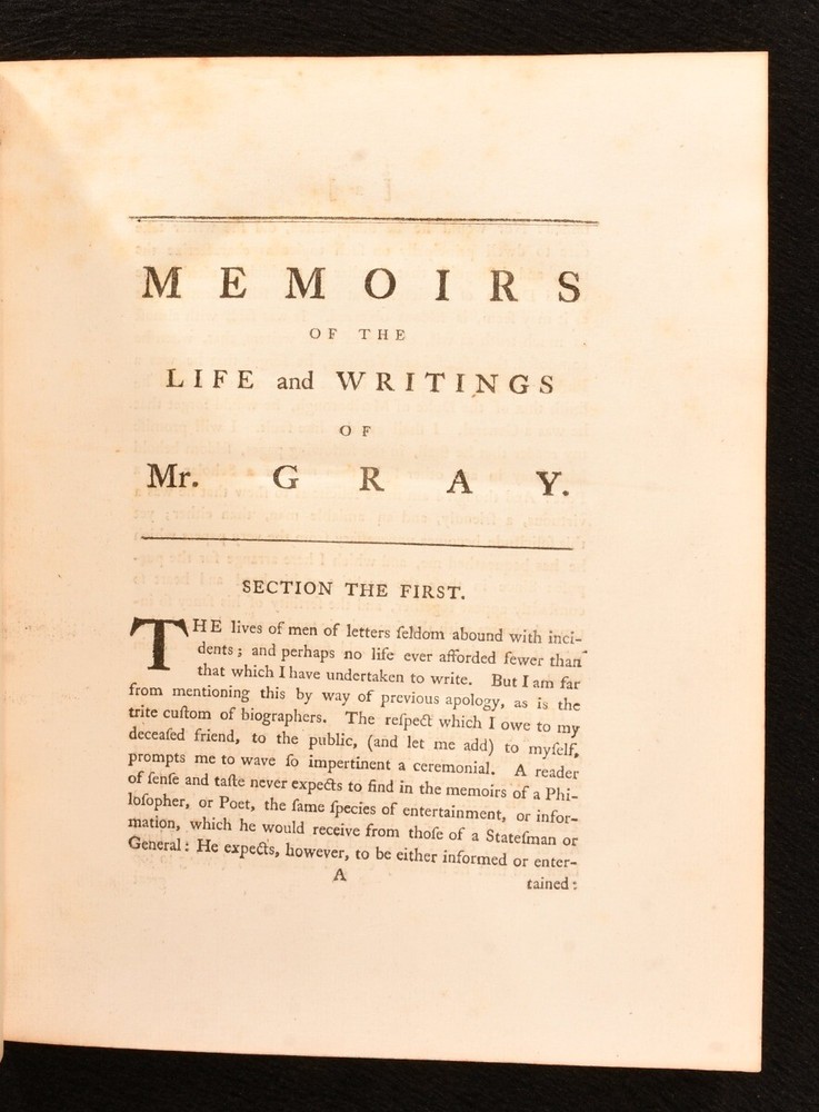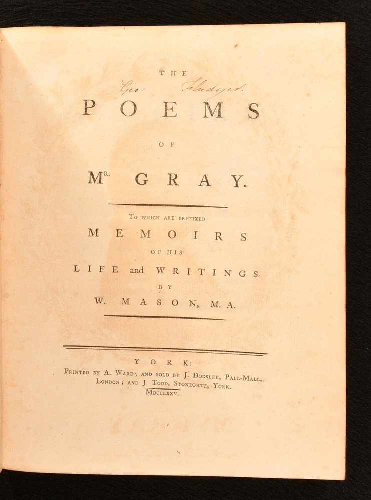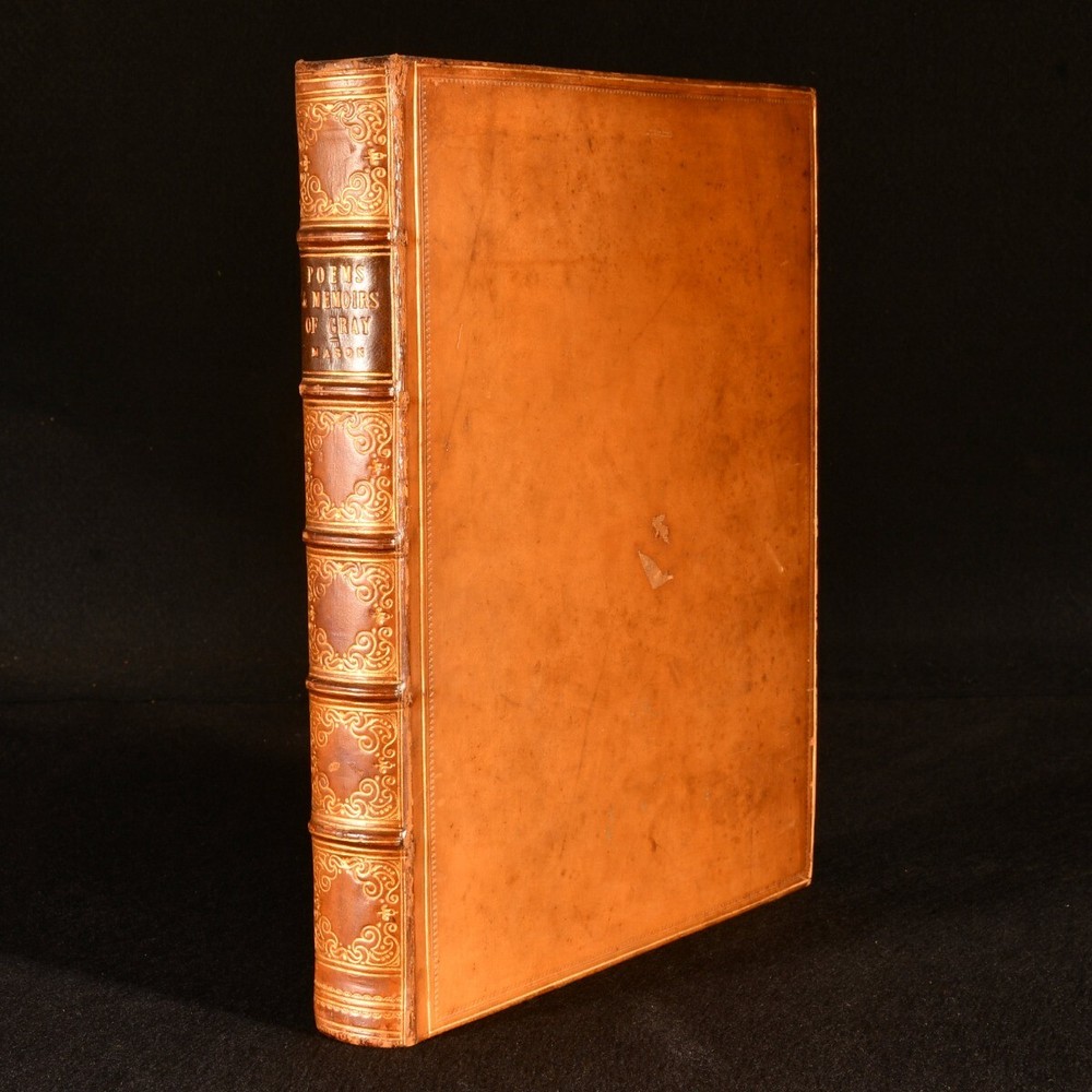 Click here to see our other books! The Poems of Mr. Gray. To Which are Prefixed Memoirs of his Life and Writings. Thomas Gray; W. Mason 1775 A. Ward : York 10.5" by 8.5" [4], 416, 111, [2pp.] SUMMARY The first edition of this collection of poetry by Thomas Gray, the York imprint, with an engraved portrait by James Basire. First Edition,Leather Binding Overall Condition: Very Good This book weighs 2 KG when packed UK Postage: £ 3.99 US Postage: £ 29.99 EU Postage : £ 21.99 European Postage: £ 23.99 Asia Postage: £ 37.99 Worldwide Postage: £ 38.99 DESCRIPTION The first edition. Bound in full calf, without the half title. Illustrated with an engraved frontispiece of Mr Gray by James Basire. Collated, complete. A collection of writings by English poet, letter-writer and classical scholar, Thomas Gray. Publishing only thirteen poems in his life, Gray was well-known for being self-critical, and even turned down the offer of Poet Laureate in 1757. This work is divided into two sections, with two separate paginations. The first part contains an introduction, a memoir of Gray and a vast collection of his letter correspondence. The second part is dedicated solely to Gray's poetry, containing his various odes, epitaphs and his most famous work, 'Elegy Written in a Country Churchyard'. With imitations, variations and additional notes to the rear. The York imprint. With a library location label to the front paste down. CONDITION Bound in full calf, without the half title. Externally, smart, with some rubbing to the extremities and joints. The odd mark to boards. Label to front paste down. Front hinge is a touch strained, but holding firm. Internally, firmly bound. Pages are bright and clean, with the odd spot, heavier to the first and last few pages. Overall Condition: Very Good GLOSSARY OF TERMS Overall Condition (Dustwrapper condition rating is shown after that for the book itself, where a dustwrapper is present) Fine - Very well preserved copy showing very little wear Very Good Indeed - Only one or two minor faults, really a very attractive copy Very Good - Quite a wide term meaning no major faults but probably several smaller ones often expected given the age of the book, but still a respectable copy Good - Meaning not very good. Some more serious faults as will be described in the condition report under 'condition' Good Only - Meaning one or more faults that could really do with repair Fair - As with good only above but with other faults leaving a compromised copy even after repair Poor - Really bad and possibly seriously incomplete. We only sell books in this condition where their rarity or value makes them attractive none the less. Major defects will be described. GUARANTEE We offer a full money back guarantee on our descriptions. Please ask for details and conditions. We prefer PAYPAL. If you pay via PAYPAL we will post the item off the same or the next working day with the postage you have selected. Please note we cannot accept USD cheques