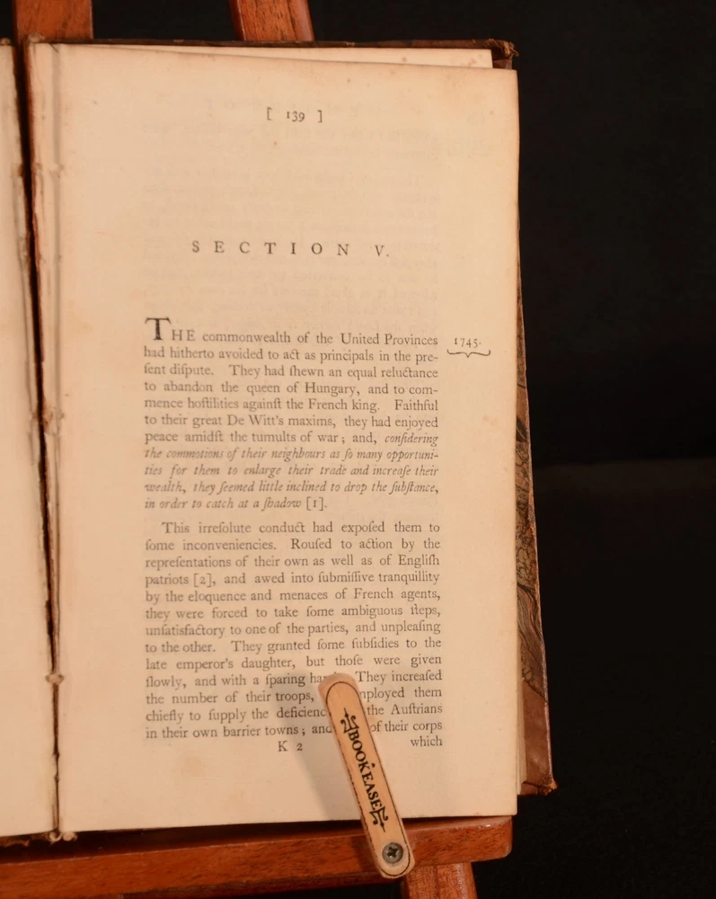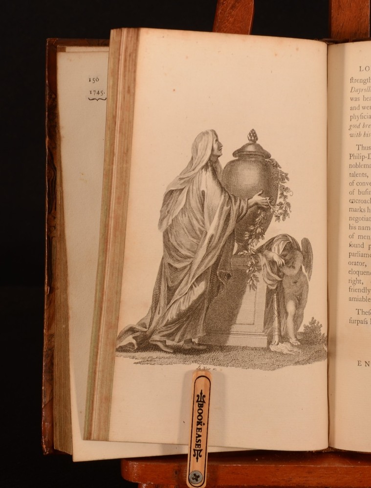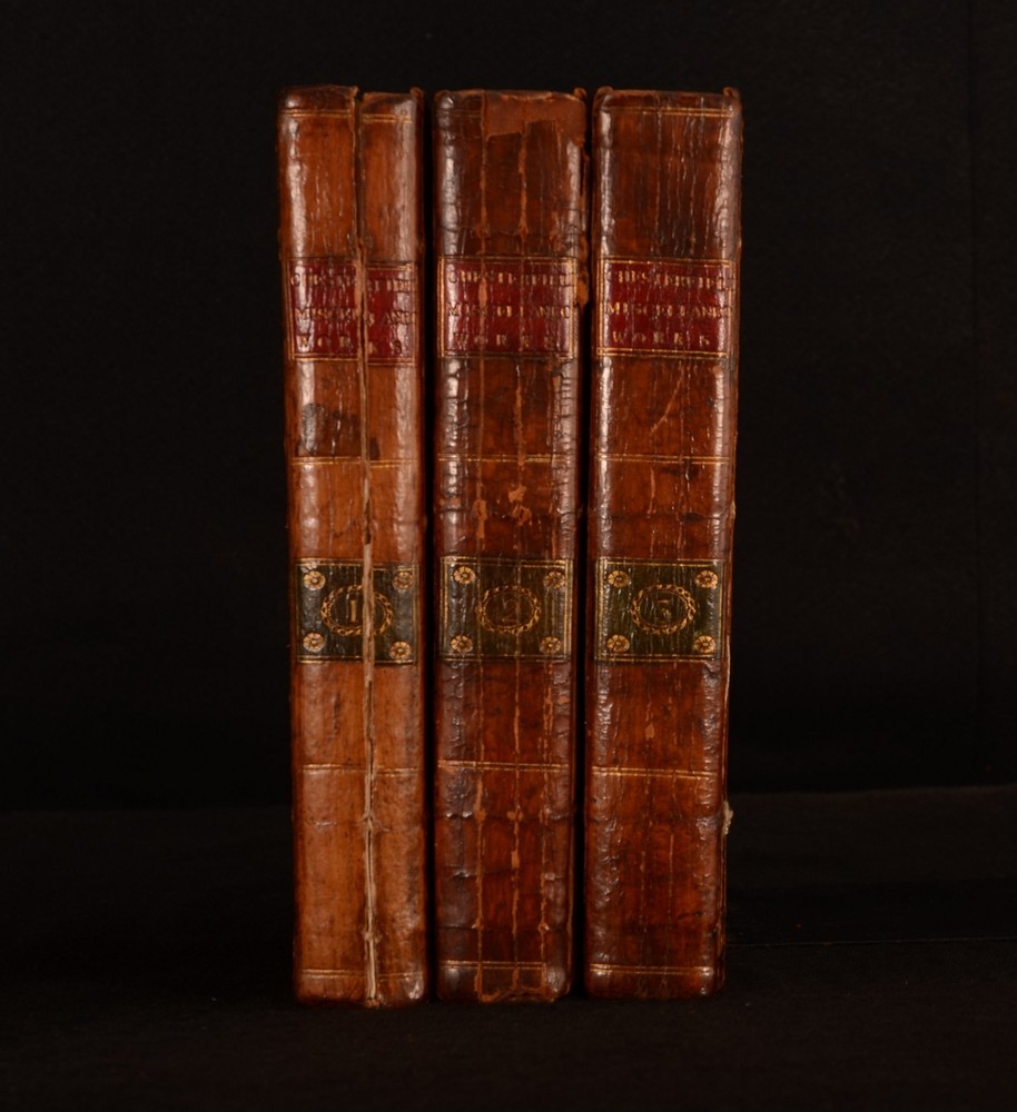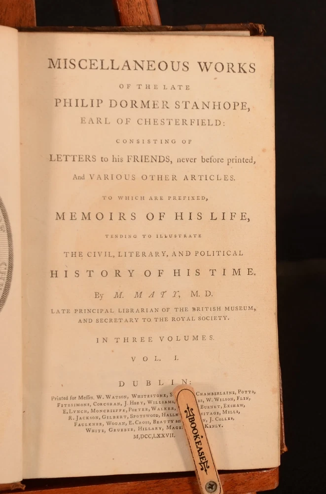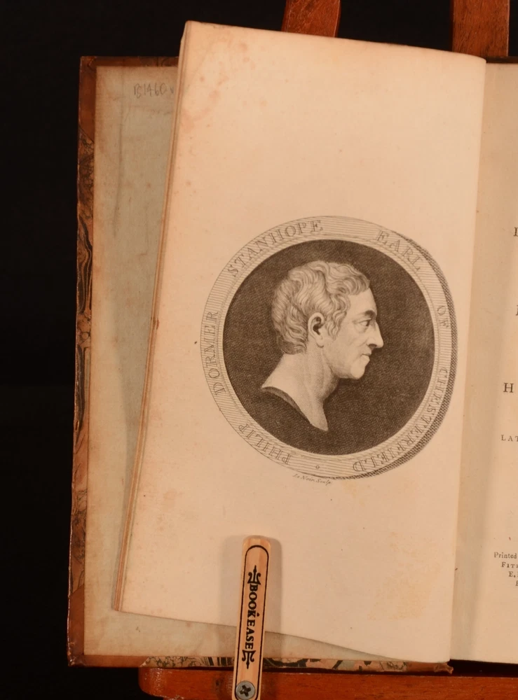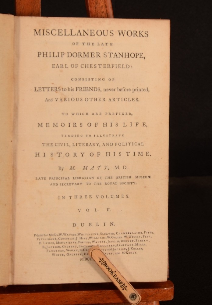 Click here to see our other books! Miscellaneous of the Late Philip Dormer Stanhope, Early of Chesterfield: Consisting of Letters to His Friends, Never Before Printed, and Various Other Articles To Which are prefixed Memoirs of his Life Philip Dormer Stanhope; M Maty 1777 W Watson; Whitestone; Sleater et al : Dublin 8.5" by 5.5" vi, [1], 355pp, [1]; 439pp; [6], 439pp, [1] SUMMARY The first Dublin edition of Philip Dormer Stanhope's works. In a contemporary half calf binding. These miscellaneous writings follow the publication of his letters, which were first issued in 1774. Leather Binding Overall Condition: Good Only This book weighs 3 KG when packed UK Postage: £ 3.99 US Postage: £ 36.99 EU Postage : £ 25.99 European Postage: £ 27.99 Asia Postage: £ 47.99 Worldwide Postage: £ 69.99 DESCRIPTION Three volumes. ESTC No. N5220. This Dublin imprint was printed the same year as the London edition. With a frontispiece and a further seven plates to volume I. Lacking the 'Mr Prior' and 'Countess of Chesterfield' plates according to the binder's instructions. There are two plates that are not mentioned to the binder's instructions, 'Alderman George Faulkner' and a plate that faces the 'end of the memoirs' which features an urn and a crying cherub. This work comprises of letters from Stanhope to his friends as well as further memoirs of Stanhope's life. The memoir on the Earl of Chesterfield is by Matthew Maty, who began the work with the assistance of Solomon Dayrolles. The work was completed by his son-in-law Justamond. These miscellaneous works are the first appearance of Maty's memoir. CONDITION In half calf bindings. Externally, rubbed. Front board to volume II is detached but present. Front hinge and joint to volume I are weak and held by one cord only; may detach with further handling. Front hinge and joint to volume III are weak and may detach with further handling. Split to the spine of volume II. Split to the spine of volume I has resulted in the binding being tender. The binding may split in half at page 150-151 with further handling, as it is held by one cord only. Otherwise, all volumes are generally firmly bound. Pages are generally bright. Scattered spots to pages. Overall Condition: Good Only GLOSSARY OF TERMS Overall Condition (Dustwrapper condition rating is shown after that for the book itself, where a dustwrapper is present) Fine - Very well preserved copy showing very little wear Very Good Indeed - Only one or two minor faults, really a very attractive copy Very Good - Quite a wide term meaning no major faults but probably several smaller ones often expected given the age of the book, but still a respectable copy Good - Meaning not very good. Some more serious faults as will be described in the condition report under 'condition' Good Only - Meaning one or more faults that could really do with repair Fair - As with good only above but with other faults leaving a compromised copy even after repair Poor - Really bad and possibly seriously incomplete. We only sell books in this condition where their rarity or value makes them attractive none the less. Major defects will be described. GUARANTEE We offer a full money back guarantee on our descriptions. Please ask for details and conditions. We prefer PAYPAL. If you pay via PAYPAL we will post the item off the same or the next working day with the postage you have selected. Please note we cannot accept USD cheques