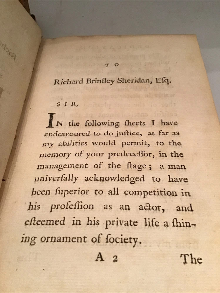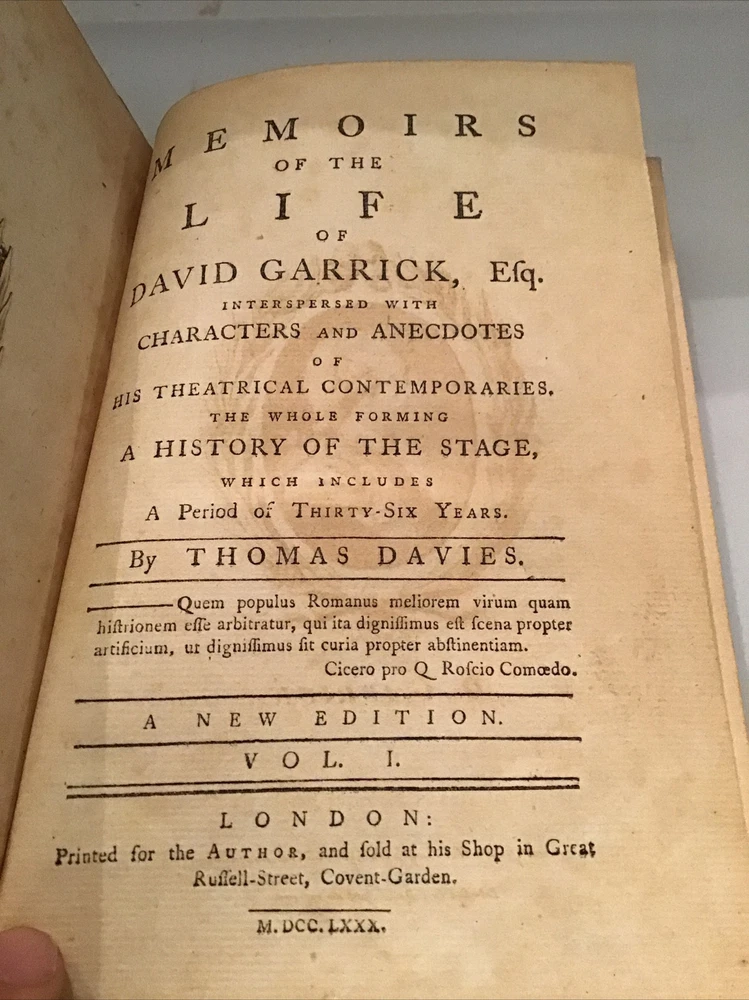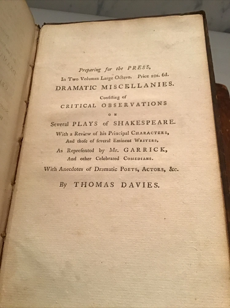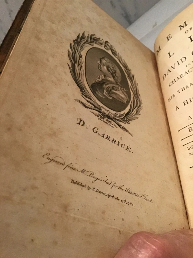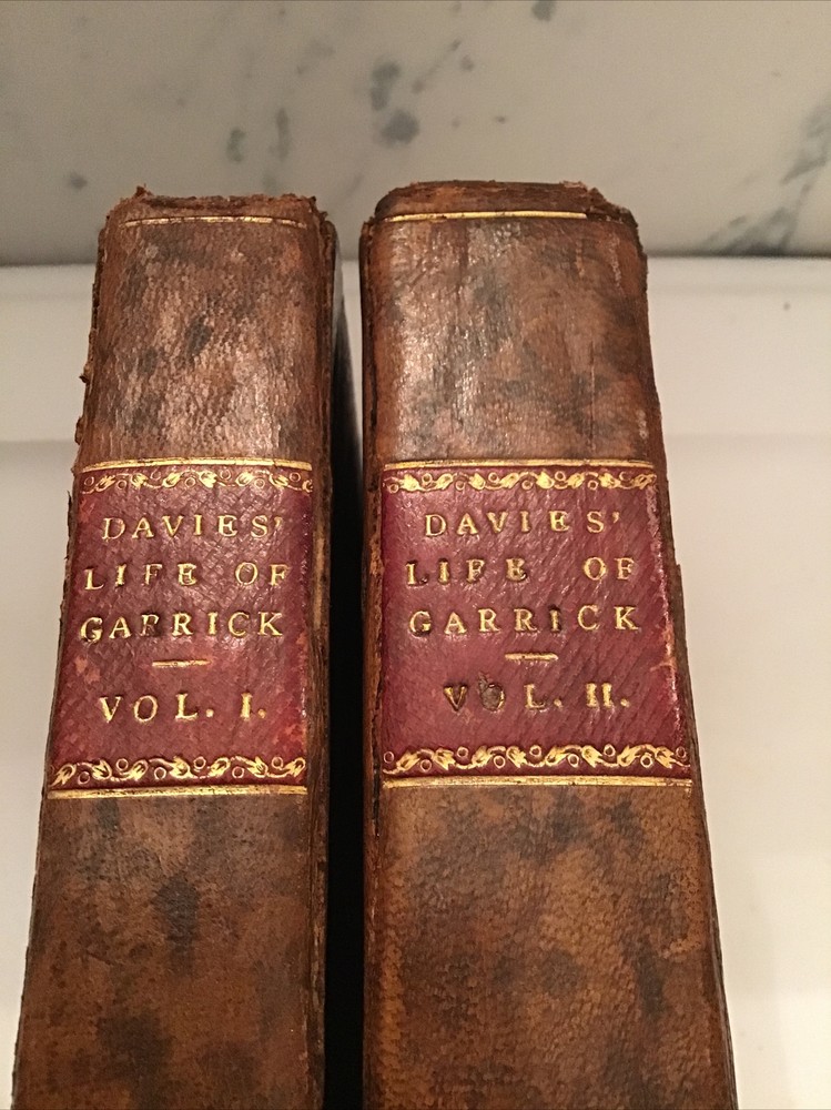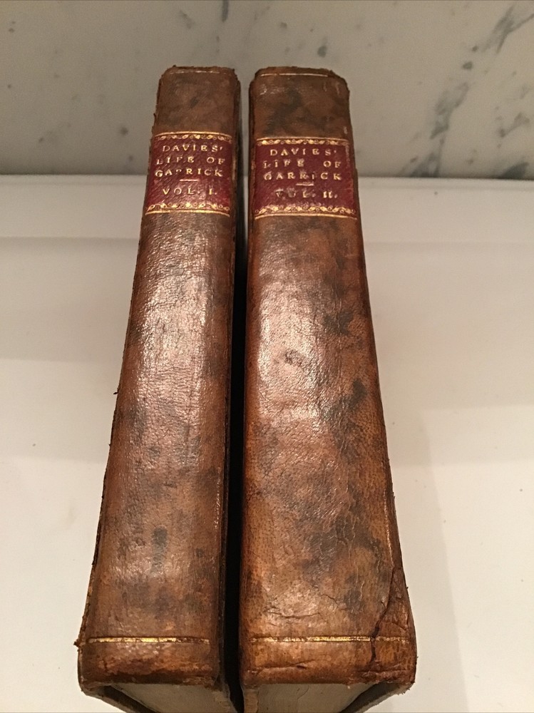 1780 Memoirs of the Life of David Garrick, A New Edition By Thomas Davies 2 Volume Set Leather Marbleized Endpapers Memoirs of the life of David Garrick, Esq. Interspersed with characters and anecdotes of his theatrical contemporaries. The whole forming a history of the stage, which includes a period of thirty-six years. A New Edition DAVIES, THOMAS Published by the author, London, 1780 Size 5.1/8” x 7.7/8” 344 & 419 pages, minor foxing Some separation on cover but still intact. (See Picture 12) The opening paragraph, "All excellence has a right to be recorded. I shall therefore think it superfluous to apologize for writing the life of a man who, by an uncommon assemblage of private virtues, adorned the highest eminence in a public possession.", has been attributed to Samuel Johnson. In the prefatory Advertisement Davies acknowledges that Johnson encouraged him to undertake the work and supplied him with much of the information regarding Garrick's early life (Garrick was Johnson's first pupil at Edial). "Though the exact extent of Johnon's contribution to this book cannot be accurately determined, it was probably substantial." (Chapman & Hazen) Arnott, Lowe & Robinson 2930. Courtney p. 152. Chapman & Hazen p. 160. Keep in mind the shipping price also covers handling fees, packaging materials & time, not just postage. Shipping with Insurance. See our eBay store for thousands of our other items. B12D