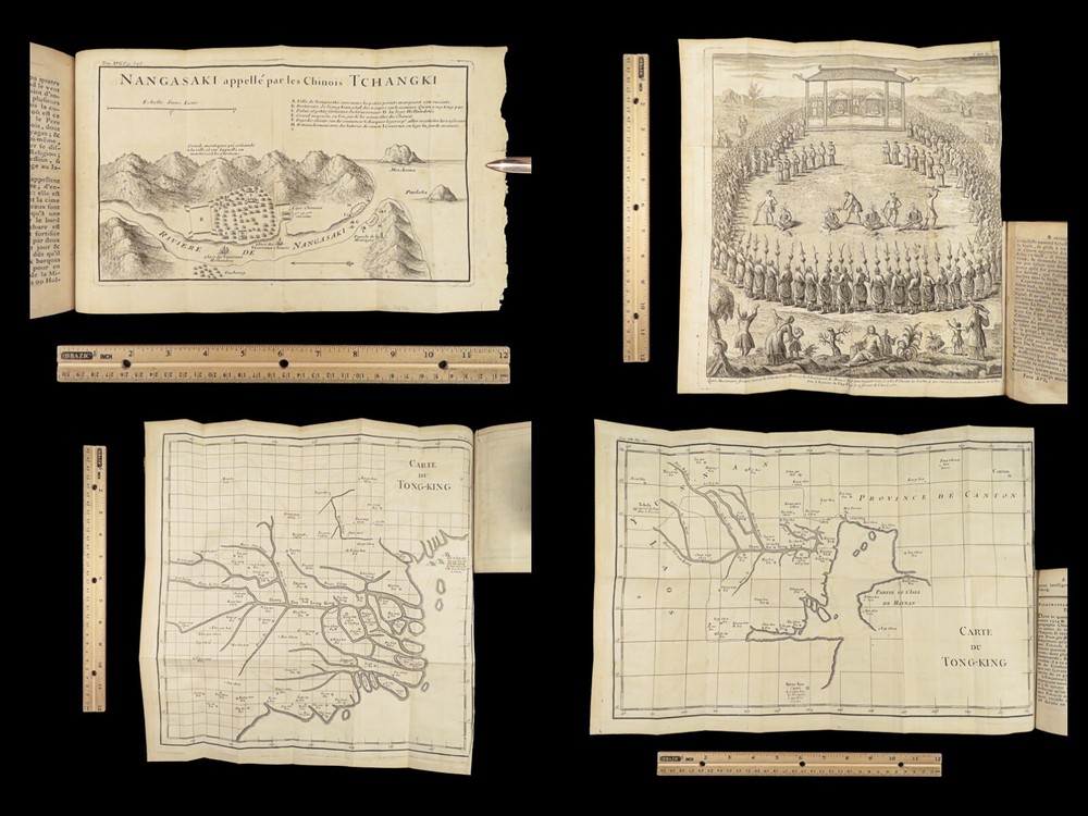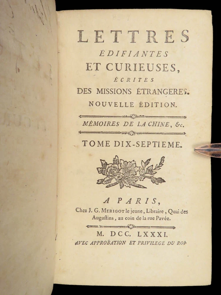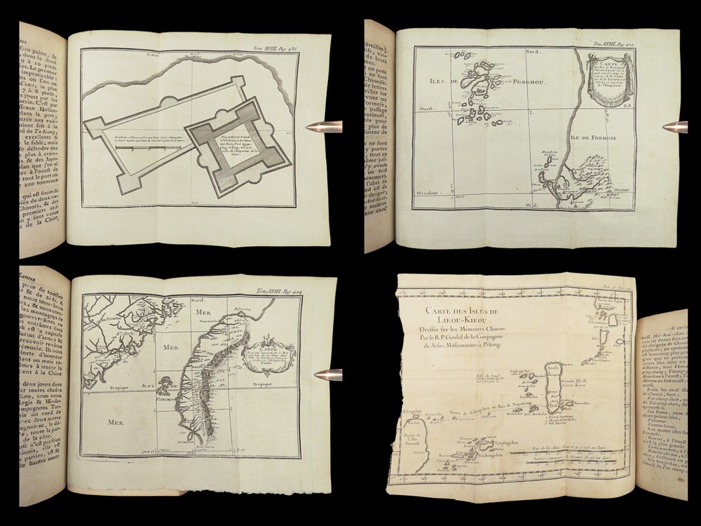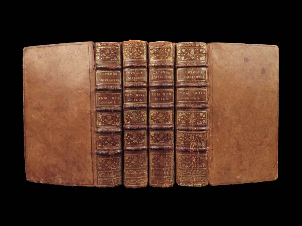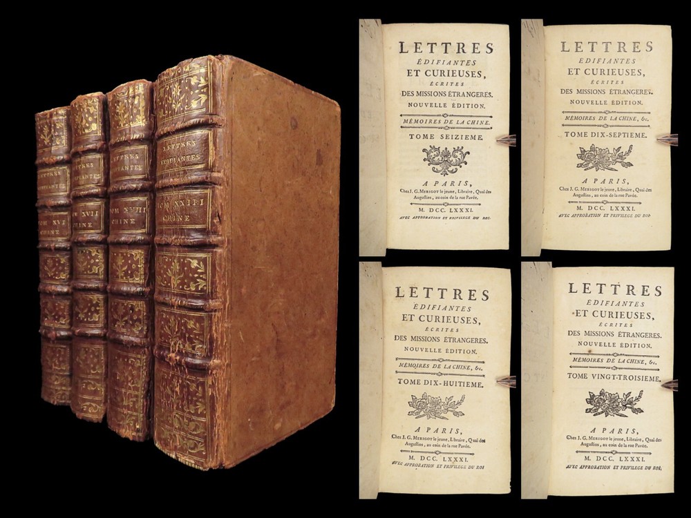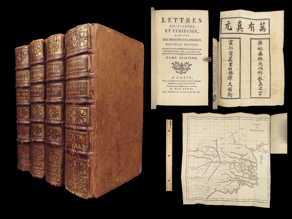 1781 RARE Jesuit Voyages Missions CHINA Taiwan Vietnam MAPS 1834 Ursuline Riots The ‘ Lettres Edifiantes et Curieuses’ is a collection of reports and letters from Jesuit missions from around the world. It is a key and important source of information for the history of Catholic missions and missionaries through the 18 th -century. This set of four tomes contains information on a variety of Jesuit missionaries and notable missions including: · Memoirs of voyages in India and China o Jesuit Antoine Gaubil voyages § Known for Chinese astronomy – considered the best 18 th -century Chinese astronomer amongst French Jesuits § Extensive section on Chinese astronomy · Voyages of Francois Picquet in Canada · Missionary voyages of Abbe de Charvet and Francois Bourgeois in China · Jesuits in Peking, voyages of Francois d’Ollieres · Voyages and letters of Fathers de Jartoux, Orry, and Fontaney in China · Father Entrecolles and Father Procureur in the Indies and China o Isle of Penghu, near Taiwan o Formosa, Taiwan § Fort Zeelandia - Ngan ping Tching · On the use of ginseng, illustration This particular set survived the infamous Ursuline Convent riots in 1834! Item number: #27607 Price: $995 GOBIEN, Charles Le Lettres édifiantes et curieuses, écrites des missions étrangeres. A Paris, chez J.G Merigot, Libraire, 1781. First edition. Details : · Collation: Complete with all pages; 4 volumes o Vol. XVI – xxxvi, 438 o Vol. XVII – 450, [2] o Vol. XVIII – 480 o Vol. XXIII – 619, [1] o 10 engraved folding plates · Provenance: Handwritten – Sr. M. De Sales , Ursuline Convent, Charleston o While the individual who owned these books has not been identified, the Ursuline Convent in Charleston, Massachusetts existed only briefly, from 1827 to 1834. Regional anti-Catholic sentiments--enflamed in no small part by numerous, notable Protestant preachers including Lyman Beecher and the circulation of rumors about the convent’s treatment of the nuns and students within its walls--incited rioters to raze the convent in 1834. Few books survived the conflagration, as the rioters made a point to burn any tomes left behind by the escaping nuns . · Language: French · Binding: Leather; tight and secure · Size: ~7in X 4.25in (17.5cm x 10.5cm) Our Guarantee: Very Fast. Very Safe. Free Shipping Worldwide. Customer satisfaction is our priority! Notify us with 7 days of receiving, and we will offer a full refund without reservation!