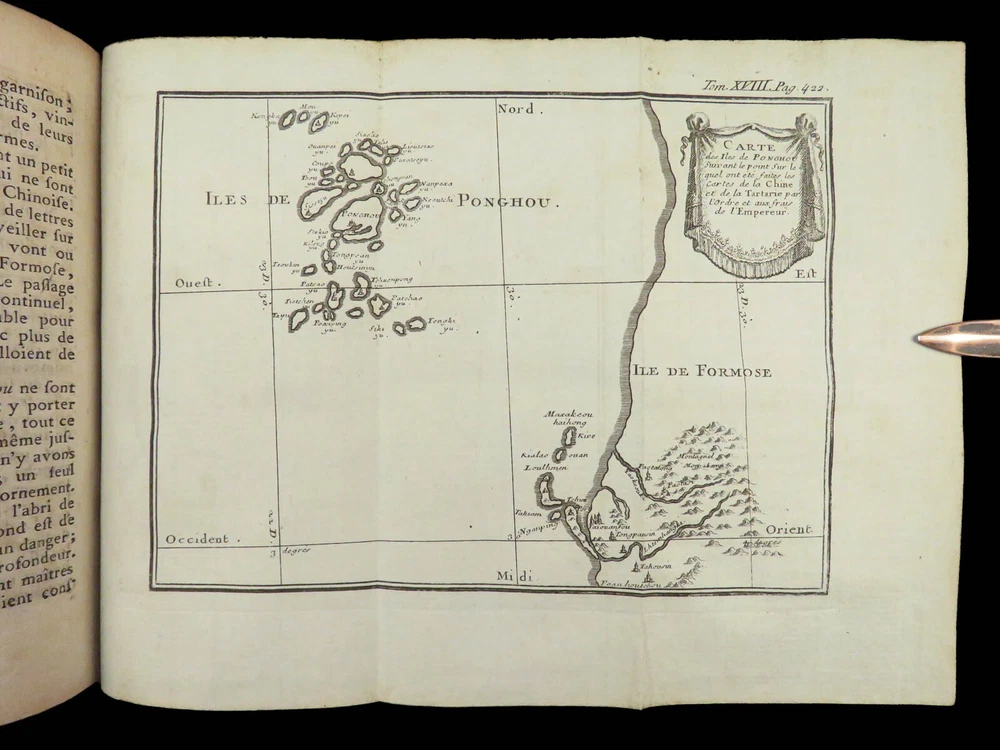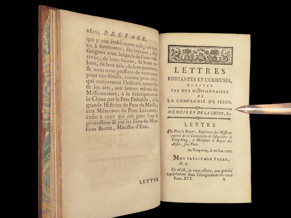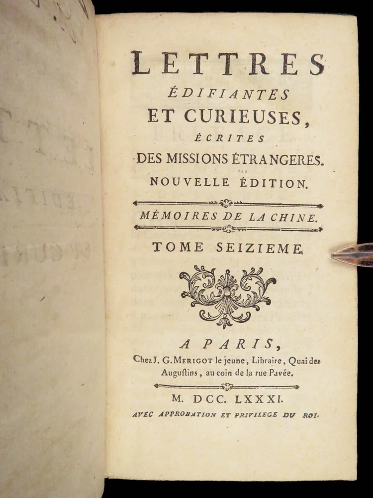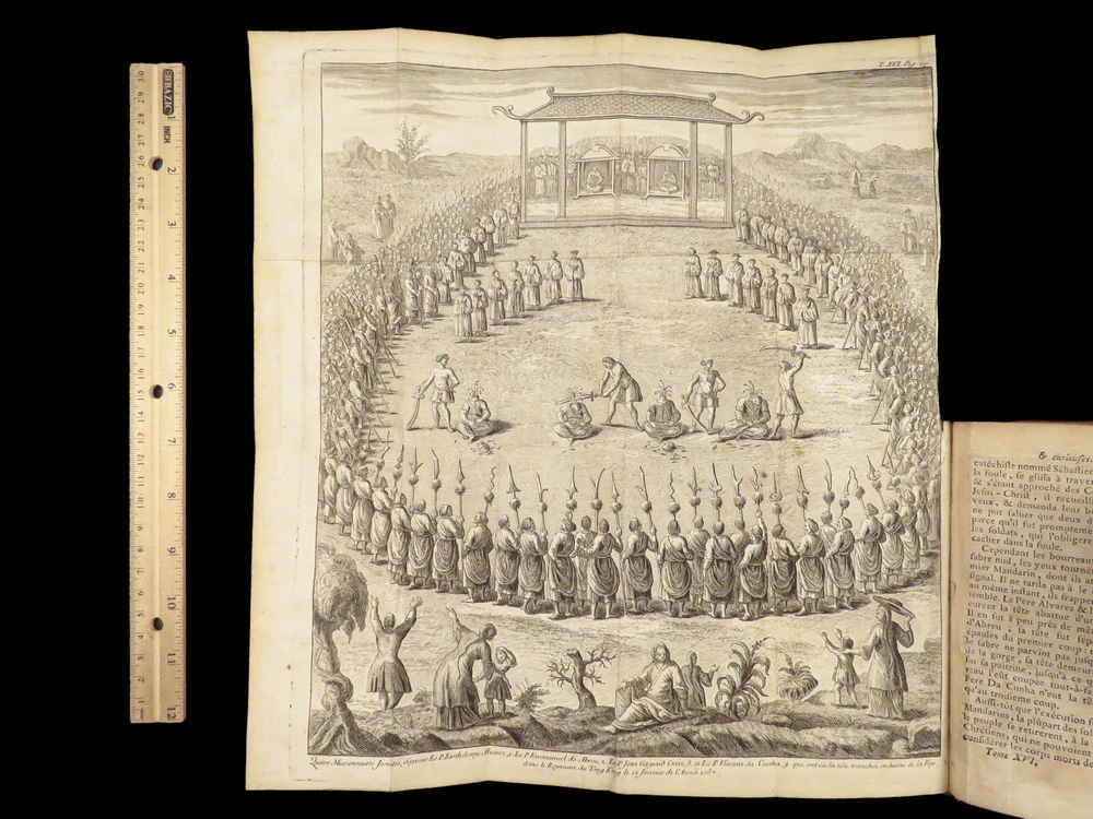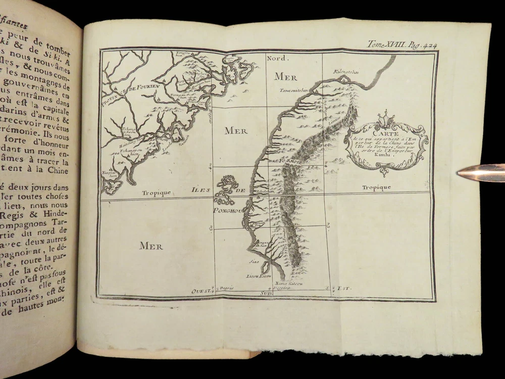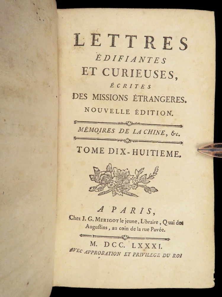 1781 RARE Jesuit Voyages Missions CHINA Taiwan Vietnam MAPS 1834 Ursuline Riots The ‘ Lettres Edifiantes et Curieuses’ is a collection of reports and letters from Jesuit missions from around the world. It is a key and important source of information for the history of Catholic missions and missionaries through the 18 th -century. This set of four tomes contains information on a variety of Jesuit missionaries and notable missions including: · Memoirs of voyages in India and China o Jesuit Antoine Gaubil voyages § Known for Chinese astronomy – considered the best 18 th -century Chinese astronomer amongst French Jesuits § Extensive section on Chinese astronomy · Voyages of Francois Picquet in Canada · Missionary voyages of Abbe de Charvet and Francois Bourgeois in China · Jesuits in Peking, voyages of Francois d’Ollieres · Voyages and letters of Fathers de Jartoux, Orry, and Fontaney in China · Father Entrecolles and Father Procureur in the Indies and China o Isle of Penghu, near Taiwan o Formosa, Taiwan § Fort Zeelandia - Ngan ping Tching · On the use of ginseng, illustration This particular set survived the infamous Ursuline Convent riots in 1834! Item number: #27607 Price: $995 GOBIEN, Charles Le Lettres édifiantes et curieuses, écrites des missions étrangeres. A Paris, chez J.G Merigot, Libraire, 1781. First edition. Details : · Collation: Complete with all pages; 4 volumes o Vol. XVI – xxxvi, 438 o Vol. XVII – 450, [2] o Vol. XVIII – 480 o Vol. XXIII – 619, [1] o 10 engraved folding plates · Provenance: Handwritten – Sr. M. De Sales , Ursuline Convent, Charleston o While the individual who owned these books has not been identified, the Ursuline Convent in Charleston, Massachusetts existed only briefly, from 1827 to 1834. Regional anti-Catholic sentiments--enflamed in no small part by numerous, notable Protestant preachers including Lyman Beecher and the circulation of rumors about the convent’s treatment of the nuns and students within its walls--incited rioters to raze the convent in 1834. Few books survived the conflagration, as the rioters made a point to burn any tomes left behind by the escaping nuns . · Language: French · Binding: Leather; tight and secure · Size: ~7in X 4.25in (17.5cm x 10.5cm) Our Guarantee: Very Fast. Very Safe. Free Shipping Worldwide. Customer satisfaction is our priority! Notify us with 7 days of receiving, and we will offer a full refund without reservation!
