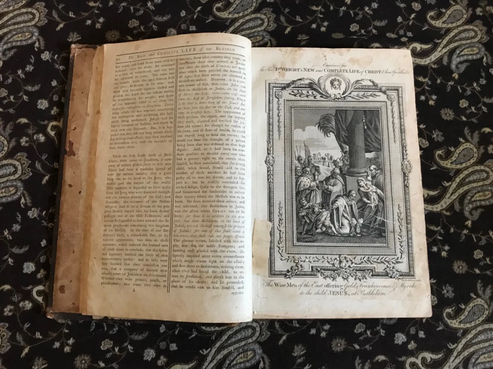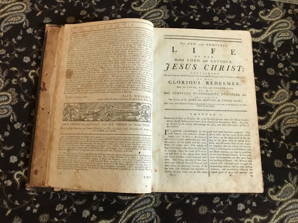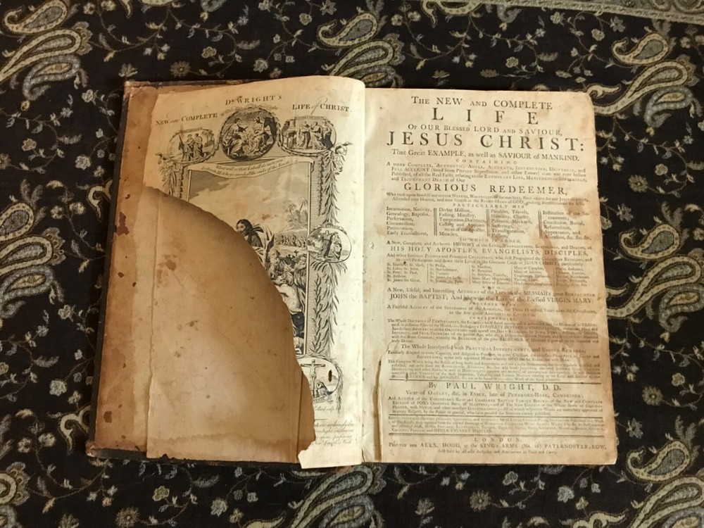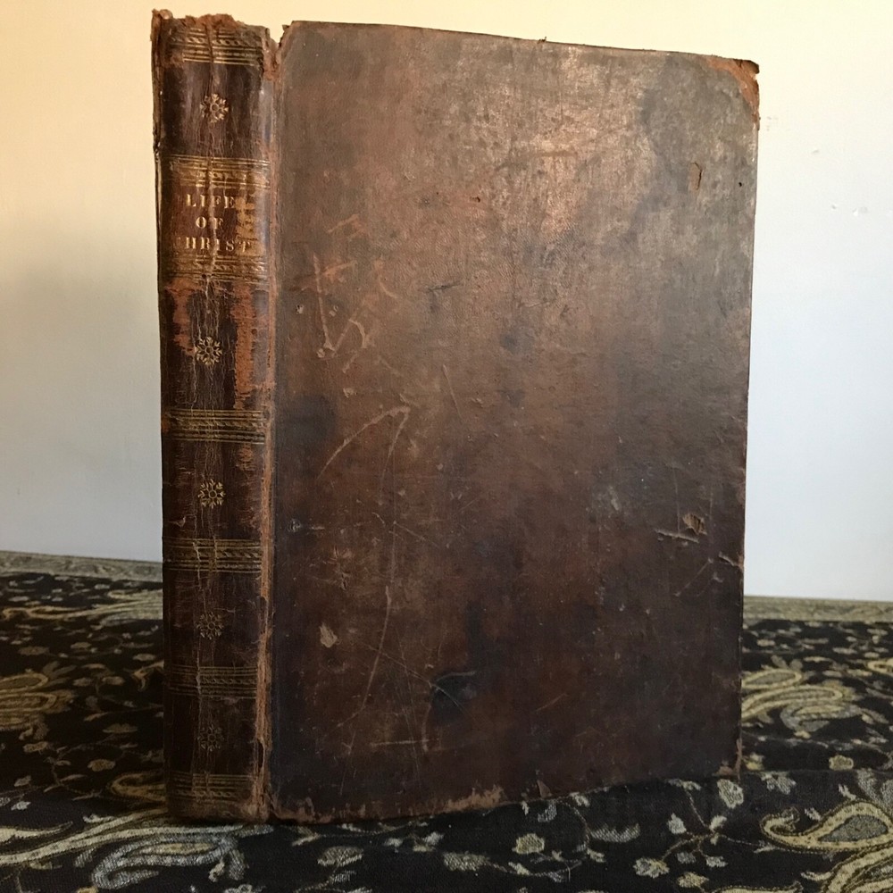 The New and Complete Life of Our Blessed Lord and Saviour Jesus Christ: That Great Example, as Well as the Saviour of Mankind. Containing a More Complete, Authentic, Ample, Accurate and Full Account (freed from Popish superstition and other Errors), Paul Wright, Alex Hogg, at the King’s-Arms, London, Pasternoster-Row, 428 pp plus subscriber’s list, full original leather, illustrated,14.25 x 9.5”, folio. In as-is condition. Boards are moderately worn with scuffing, scratch marks, indentations and rubbing/loss at corners. Hinges dry and creased. Spine has abrasions and crease marks down center. Extremes have light crushing. Interior is relatively soiled with owner’s name clipped on front fly leaf, soiling to end papers, frontispiece is torn and mostly missing. Large and small rips throughout… rear leaves have been repaired with non-archival tape that has yellowed. Toned leaves with moderate foxing. Free of known marginalia. Binding remains intact. Please see photos. Circa 1783. Worn copy of this beautifully illustrated book with 35 plates, all-copper engraved. Illustrations depict the life of Christ. COLR1783AEGK