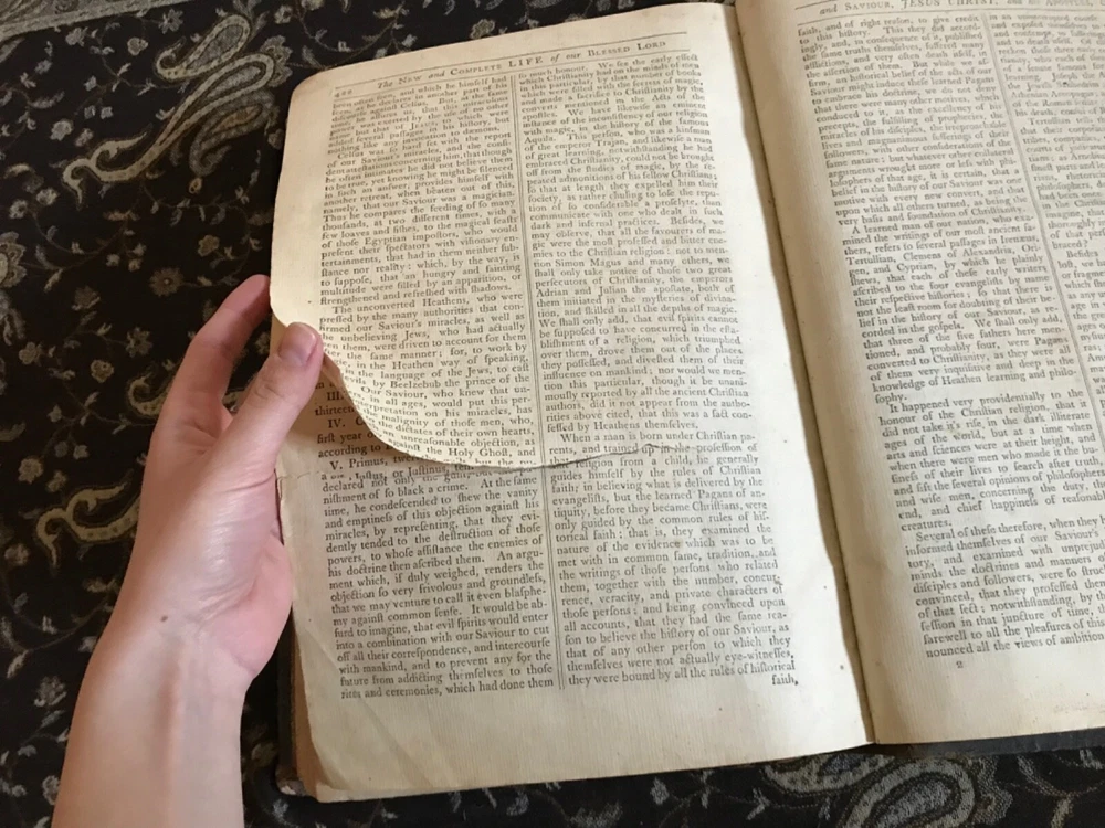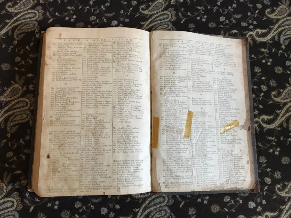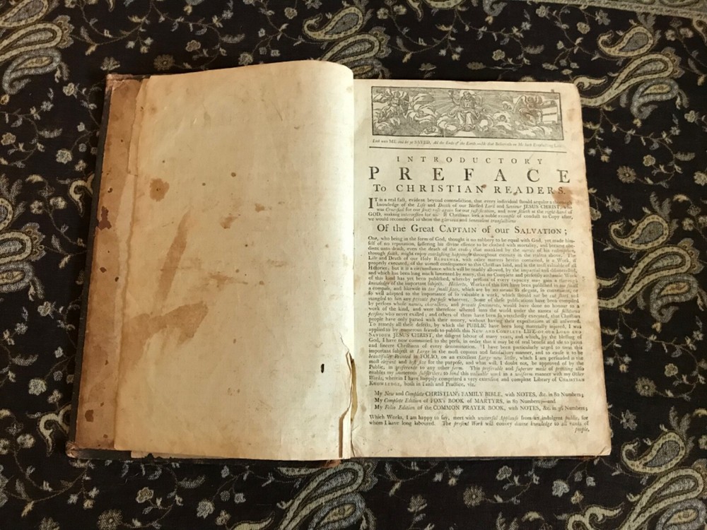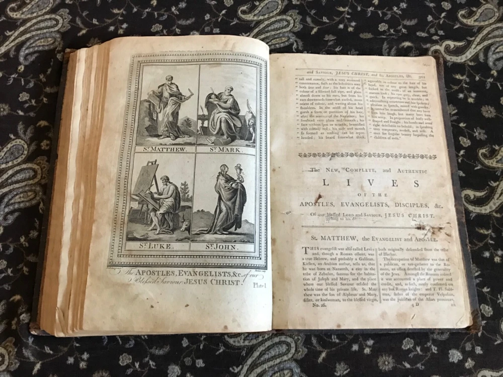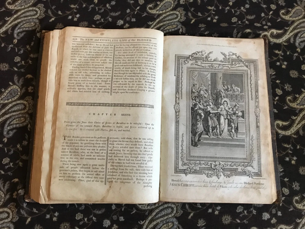 The New and Complete Life of Our Blessed Lord and Saviour Jesus Christ: That Great Example, as Well as the Saviour of Mankind. Containing a More Complete, Authentic, Ample, Accurate and Full Account (freed from Popish superstition and other Errors), Paul Wright, Alex Hogg, at the King’s-Arms, London, Pasternoster-Row, 428 pp plus subscriber’s list, full original leather, illustrated,14.25 x 9.5”, folio. In as-is condition. Boards are moderately worn with scuffing, scratch marks, indentations and rubbing/loss at corners. Hinges dry and creased. Spine has abrasions and crease marks down center. Extremes have light crushing. Interior is relatively soiled with owner’s name clipped on front fly leaf, soiling to end papers, frontispiece is torn and mostly missing. Large and small rips throughout… rear leaves have been repaired with non-archival tape that has yellowed. Toned leaves with moderate foxing. Free of known marginalia. Binding remains intact. Please see photos. Circa 1783. Worn copy of this beautifully illustrated book with 35 plates, all-copper engraved. Illustrations depict the life of Christ. COLR1783AEGK