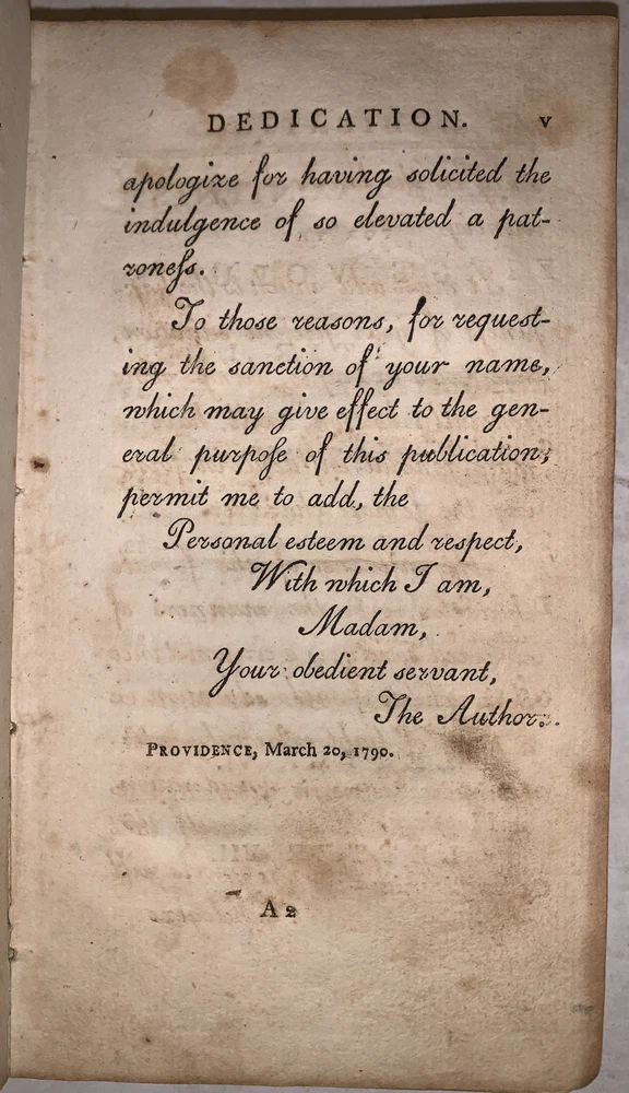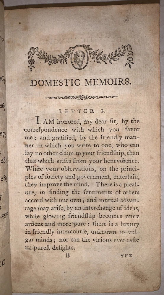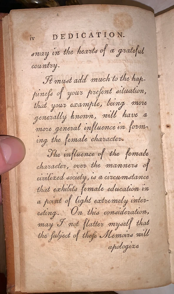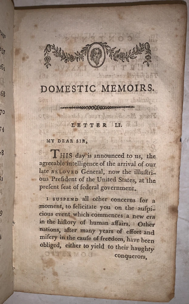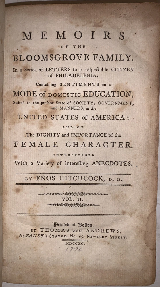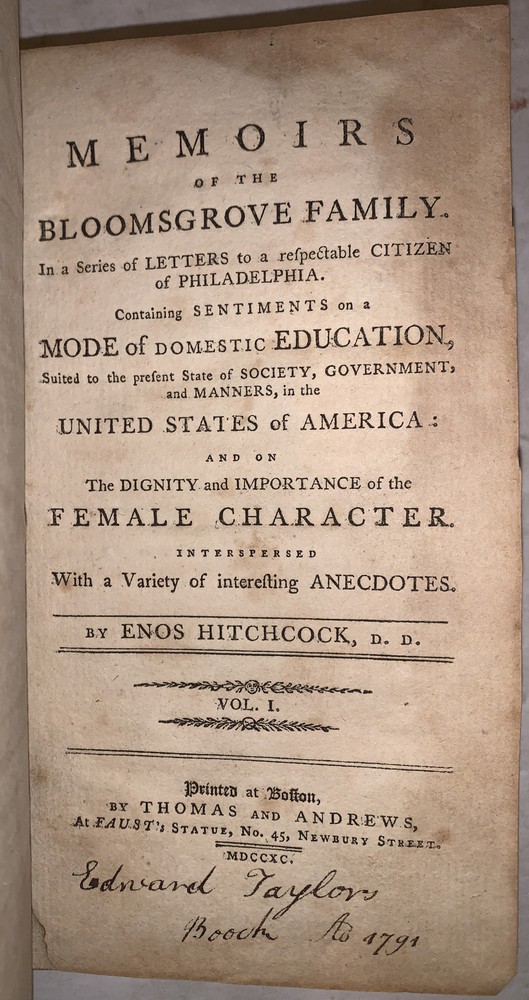 Memoirs of the Bloomsgrove Family. In a Series of Letters to a respectable Citizen of Philadelphia. Containing Sentiments on a Mode of Domestic Education, Suited to the present State of Society, Government, and Manners in the United States of America: and on The Dignity and Importance of the Female Character Interspersed With a Variety of interesting Anecdotes. by Enos Hitchcock In Two Volumes Boston: Thomas and Andrews, At Faust's Statue, No. 45, Newbury Street 1790 First Edition Two octavos, xii, 299 pages; viii, 300 pages, both volumes bound in period full calf. Gilt bands and lettering to spines. The spine label on the second volume is chipped. A married set, the bindings are so similar it is easy to conclude that they had the same binder. However the gilt bands are not spaced identically and the numeral on the spines are in different compartments. There is some rubbing and wear, scuffs, slight discoloration, previous owner's inscription, a few gatherings of pages shaken, small loss to the corner of the front free endpaper in the second volume, front hinge of the second volume cracked and tender, else in good + condition. Evans 22570. Sabin 32255. If you have any questions feel free to ask and don't forget to check out my other listings.