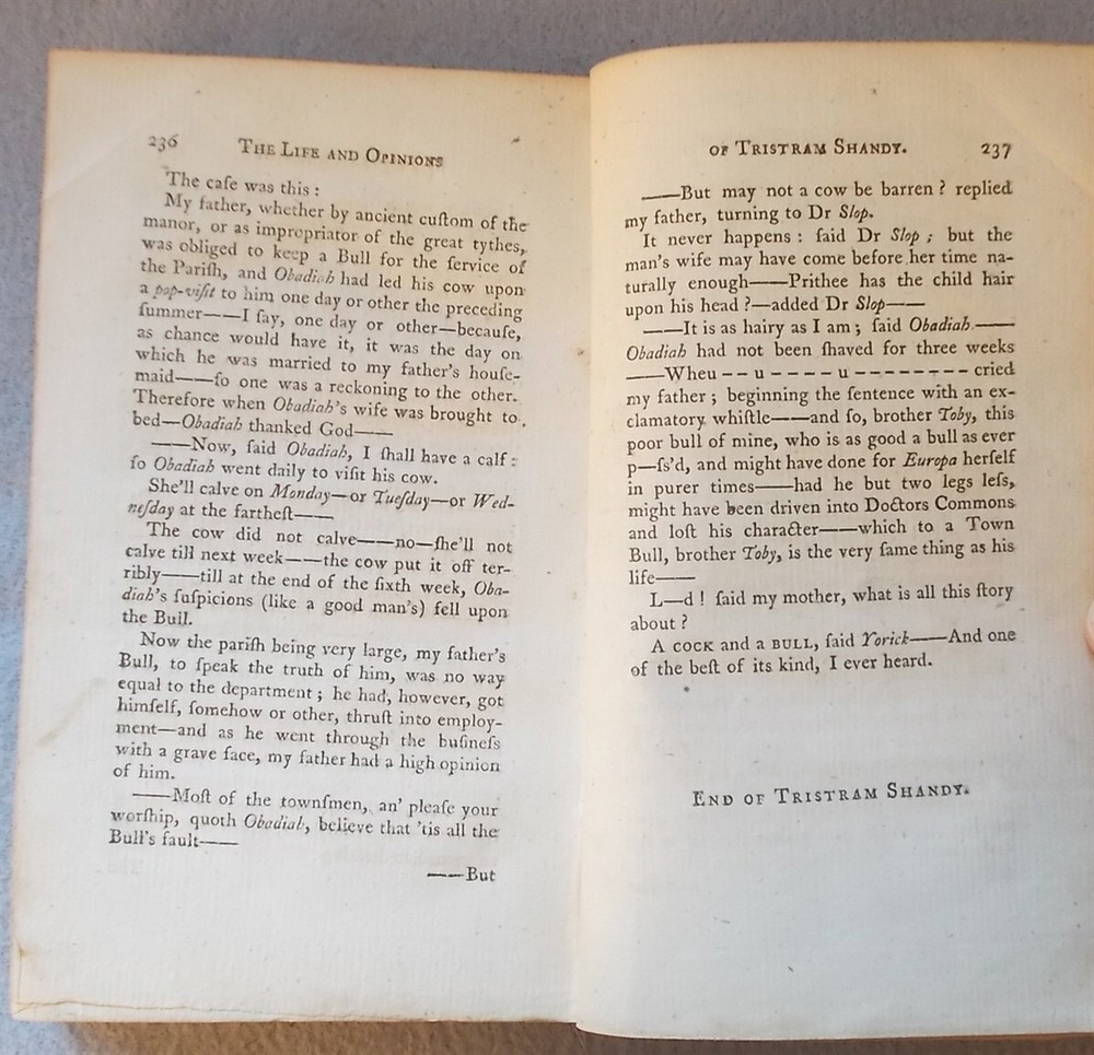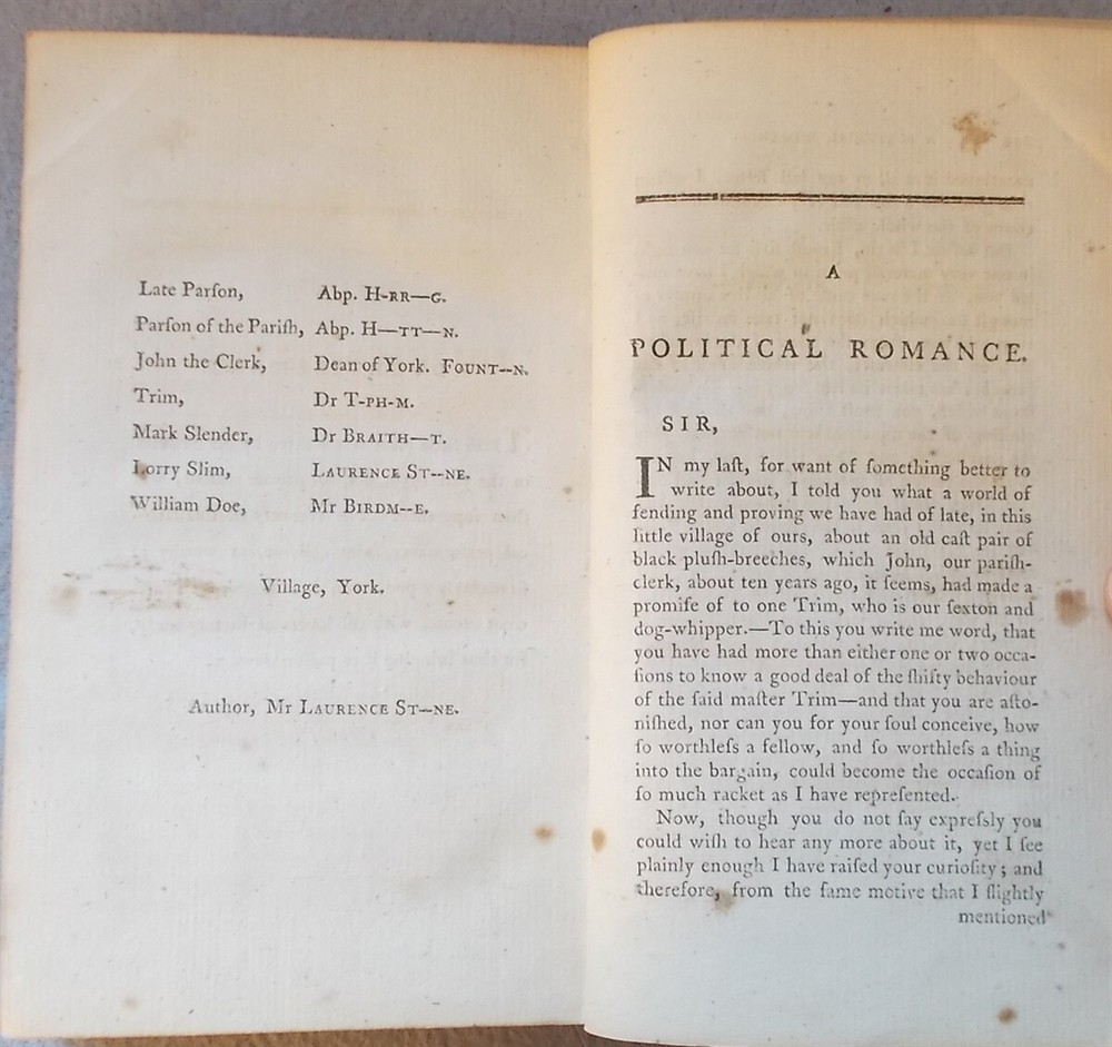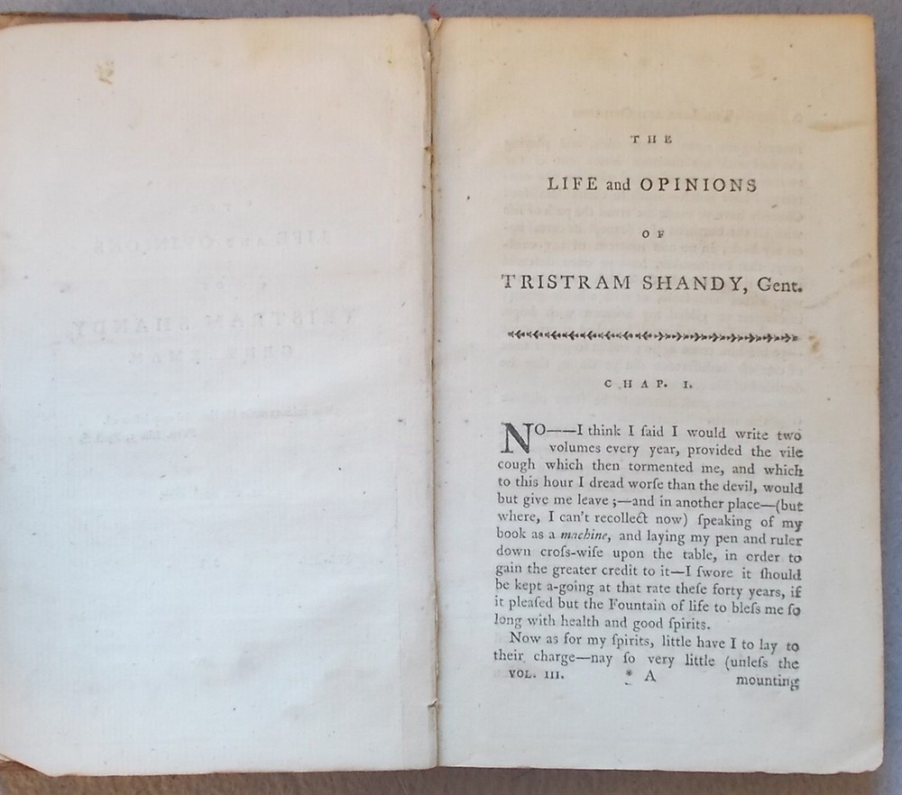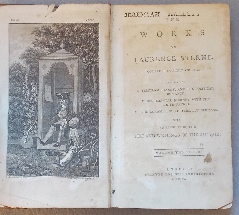 Sterne, Laurence. Tristram Shandy and a Political Romance (Volume III of the Works of Laurence Sterne) . London: Printed for the Proprietors, 1790. Leather: Poor 7" x 4.25", 258pp. With an engraved frontis. The front cover is detached and reinforced with clear tape, lacking the rear cover and endpaper; the text block is solid.