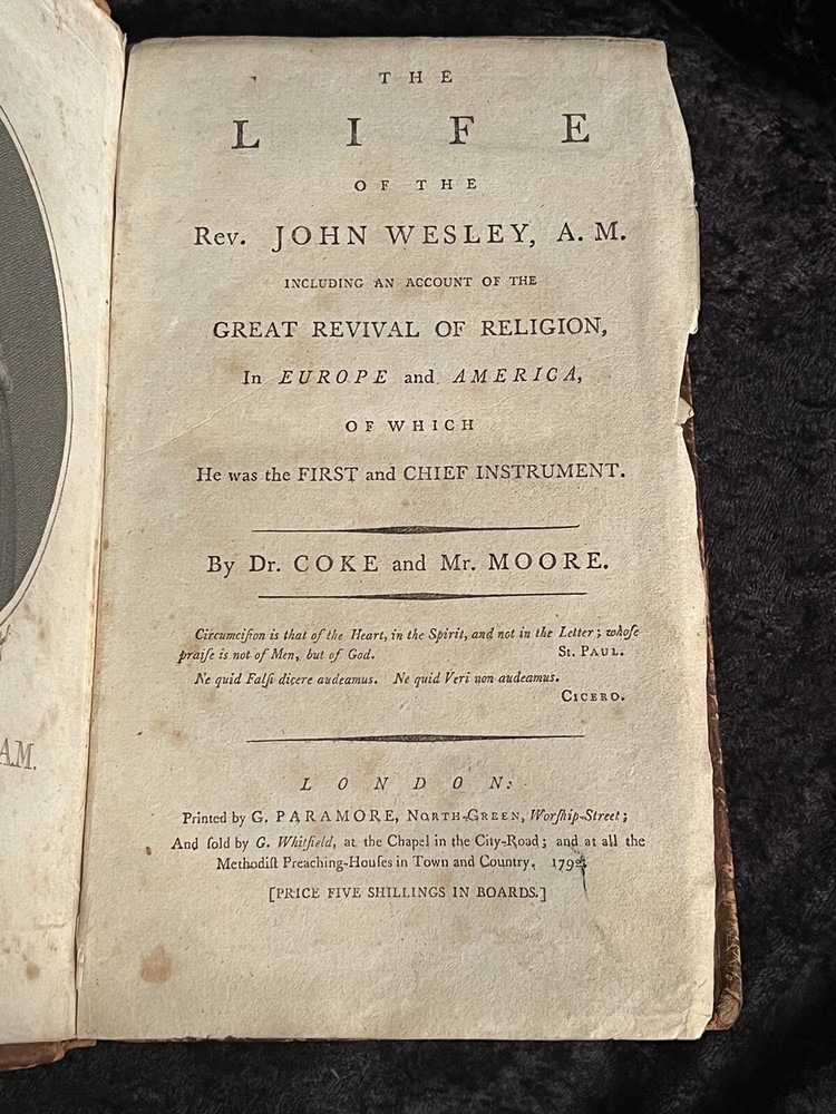 [EARLY METHODIST INTEREST ] THE LIFE OF WESLEY Dr. Coke and Mr. Moore Cambridge, 1792 The Life of the Rev. John Wesley , A.M., Including an Account of the Great Revival of Religion, In Europe and America, of Which he was the First and Chief Instrument, by Dr. Coke and Mr. Moore. London, Printed by G. Paramore, 1792. Quarto (App. 8.5 x 5.25 inches). First Edition. Original full calf binding with red label, boards shaken but holding. x + 542 pages. Portrait frontispiece. The first Methodist biography of Wesley to be published after his death (he died in 1791). By Thomas Coke and Henry Moore, two men who knew Wesley very well. The remarkable story of the beginnings of the revival movement known as Methodism. ___________ _________________________ _ Items listed on eBay are merely representative of our broader inventory. We specialize in early printed Bibles in English, with a particular focus on first editions and other significant printings. Our stock includes a wide range of Tyndale New Testaments, as well as first editions of the Coverdale Bible (1535), the Matthews Bible (1537), the Great Bible (1539), the Geneva Bible (1560), the Bishops Bible (1568) and the King James Bible (1611). Please do not hesitate to enquire regarding other early printed books and manuscripts.