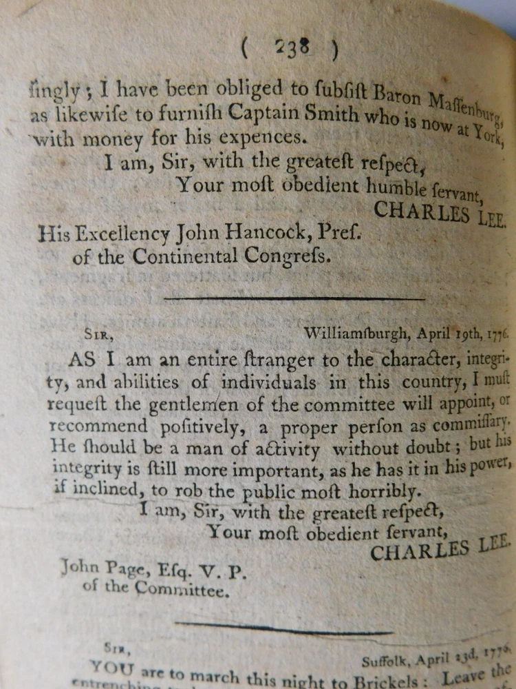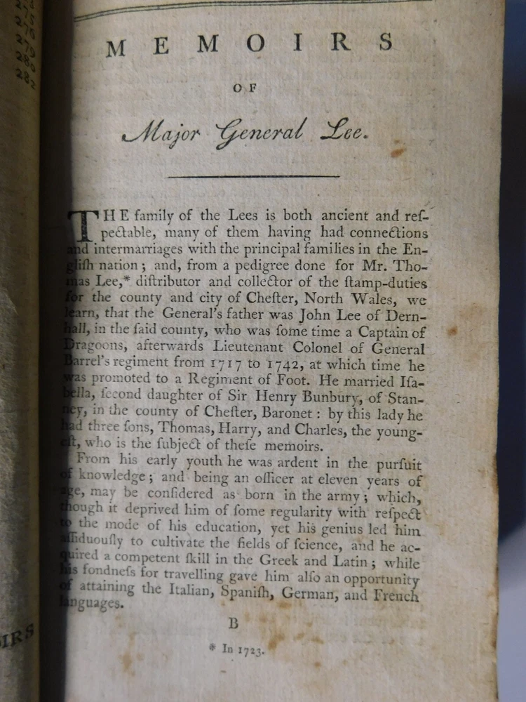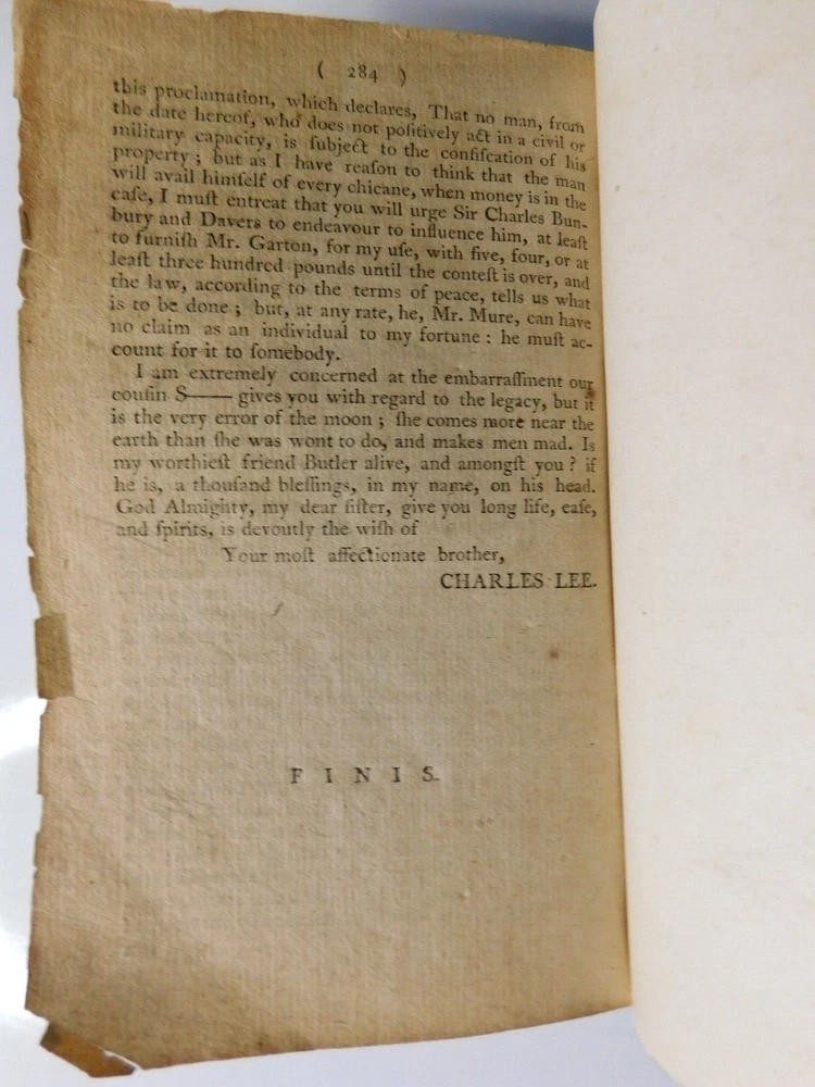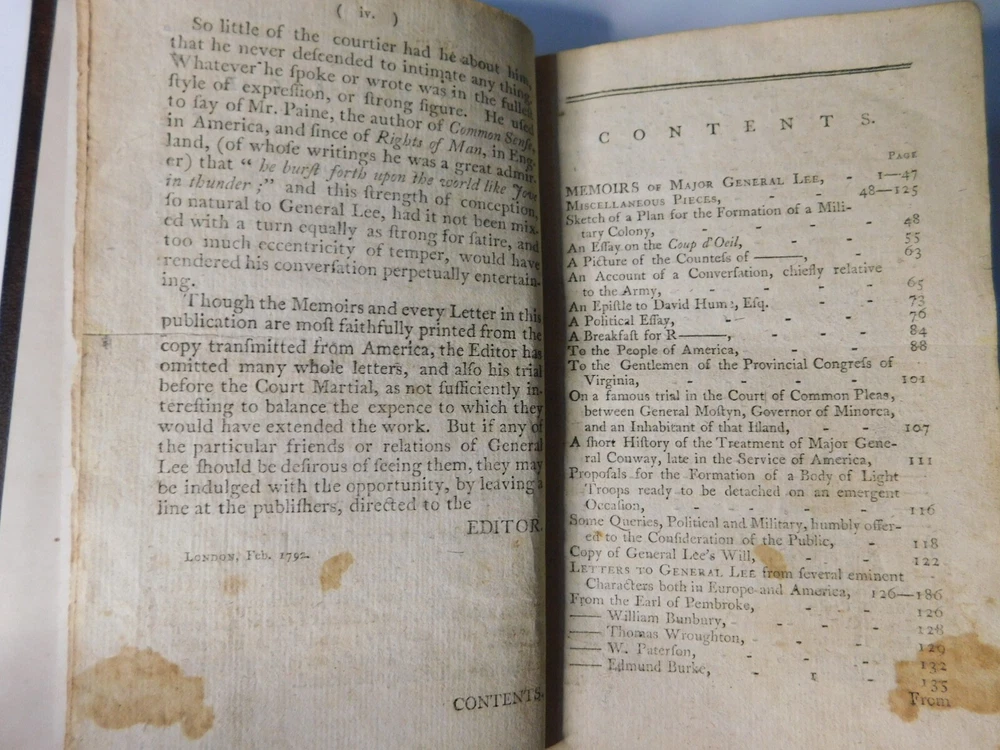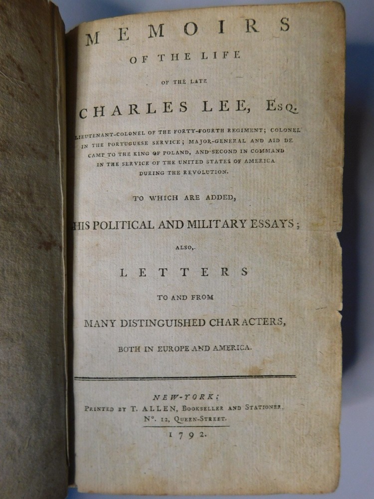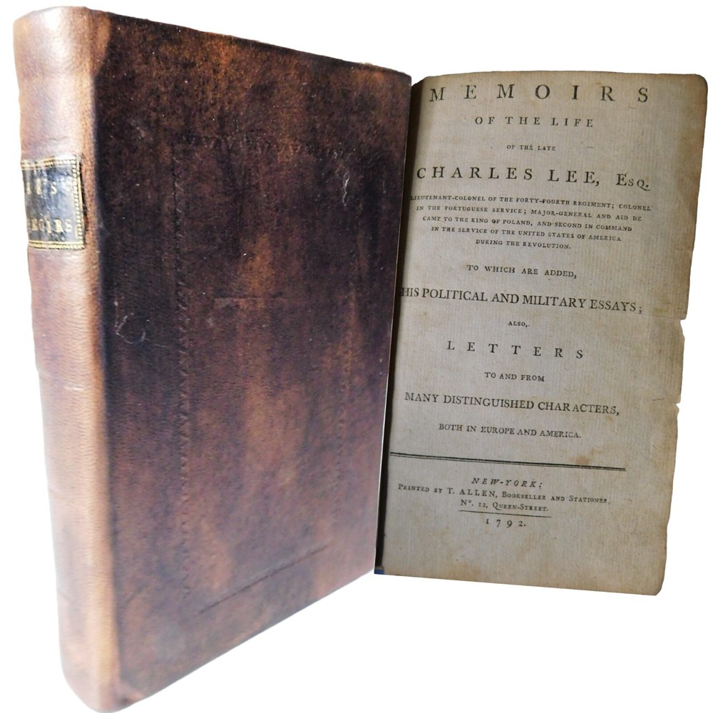 Description: He has been called "one of the most extraordinary and contradictory characters in American History." The book reads like a script from a Hollywood action movie! A quite rare and important copy of the 1792 Memoirs of Charles Lee, Esq., authored by one of Americas Founding Fathers and Edited by none other than Thomas Paine himself. The first edition, published by T. Allen - B ookseller & Stationer at No. 12 Queen Street in New York. It also includes Lees' "Political and Military Essays," along with "Letters to and from many Distinguished Characters Both in Europe and America." Charles Lee, Esq. Lieutenant-Colonel of the Forty-Fourth Regiment; Colonel in the Portuguese Service; Major General and Aid De Camp to the King in Poland and second in command in the service of the United States of America during the revolution. First Edition (Howes L83 - Sabin 38903 - Evans 24456). Howes says the editor of this book was none other than Thomas Paine, working under the direction of author Edward Langworthy, (One of Americas Founding Fathers and a Delegate to the Continental Congress from Georgia). Condition: 12mo. 192pages - A very good copy in full calf leather with the original leather spine label. Scattered foxing and toning with some chipping to the outer edge of a few pages, and an inscription on the front blank preliminary page stating, "Joseph Brownells Book Bought in the Year 1806."