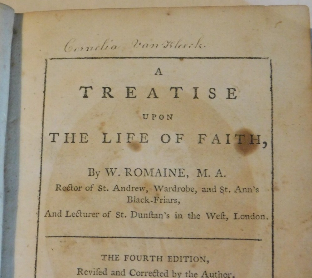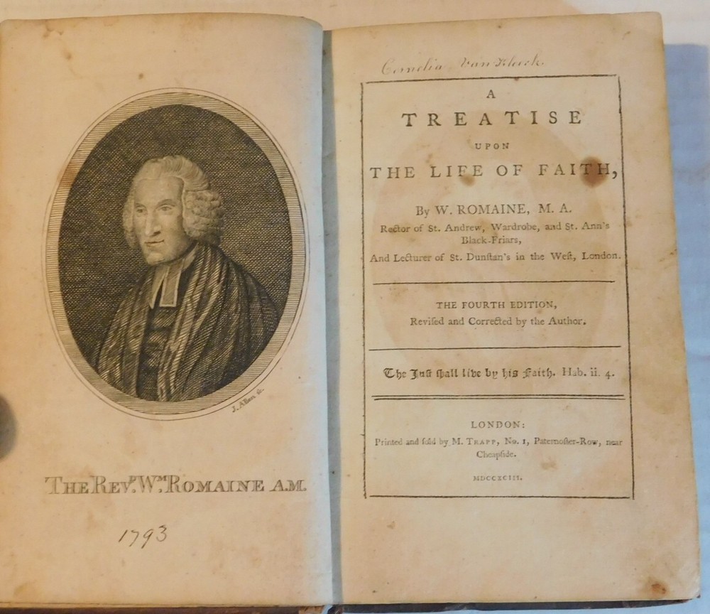 Romaine, William (1714-1795). A TREATISE UPON THE LIFE OF FAITH. By W. Romaine, M.A. Rector of St. Andrew, Wardrobe, and St. Ann's Black-Friars, And Lecturer of St. Dunstan's in the West, London. London: Printed and Sold by M. Trapp, 1793. Octavo, 6-7/8 inches high by 4-1/4 inches wide. Early full brown calf. The covers are rubbed and scuffed and the leather is splitting along the front joint. The head & tail of the spine are worn and the leather title label is chipped. 287 pages, illustrated with an engraved frontispiece portrait signed in print "J. Allen". The date "1793" is penned under the portrait. There is scattered foxing throughout. Good. "The Fourth Edition, Revised and Corrected by the Author". From the library of Cornelia Van Kleeck (1750-1810), the daughter of Dr. Henry Livingston (1714-1799), signed by her at the top of the title page. Subsequently, from the library of Charles Knapp Clearwater (1856-1941) with his signature and the date "New York, 1879" penned on the front endpaper. A later owner's book label is mounted on the front pastedown. The evangelical divine of the Church of England William Romaine (1714-1795) authored works which were once highly thought of by the evangelicals. Ordained a priest in 1738, he was engaged in a controversy over the views expressed by William Warburton. He served as chaplain to Daniel Lambert, the Lord Mayor of London, preaching at St. Paul's Cathedral. After undergoing an evangelical conversion in 1748, he preached evangelical doctrine to large crowds in opposition to the church hierarchy. He was, for a short time, Gresham Professor of Astronomy at Gresham College. A noted Hebrew scholar, Romaine published a revision of Mario di Calasio's Hebrew dictionary and concordance. TERMS: Shipping charges are calculated based on the total packed weight of this item. New York State residents will be assessed and charged the relevant sales tax. All items are guaranteed authentic and as described. Be sure to add me to your favorites list ! Check out my other items !
