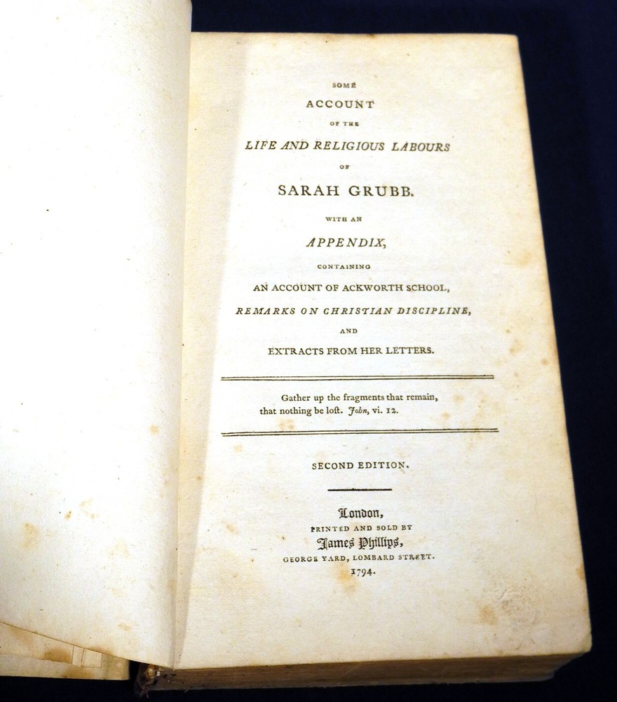 This is for a Antique Book: Some Account of the Life and Religious Labours of Sarah Grubb . Second Edition. Leather Bound Hardcover Book, printed by James Phillips, dated 1794 on title page; approximately 7-3/4 in. by 4-7/8 in ., 438 pages. Book has wear, some stains, back cover is missing, front cover and first few pages are almost loose, rest of binding is ok, see also pictures. Sold AS IS! Buyer to pay $5.00 for shipping and handling for U.S. address. We ship worldwide. International costs to be determined. Please click on 'See Details' for quote. We combine shipping if possible. Please take the time to read the following: Payment should be received within 3 days of purchase. We only ship to the address shown on the paypal payment. Because we are selling fresh items from estates, barns, etc., expect signs of wear and usage appropriate with the age of such items. We usually take multiple photographs of an item. Please check for a second row of photos, they often are there but can be overlooked. Photographs are part of the description and show all that is included. We photograph and accurately describe every item as to its condition and authenticity to the best of our ability. If you have any questions, please let us know. We often have similar items available, so please see our Other Items , or go to our 'ewkauctions' ebay store .