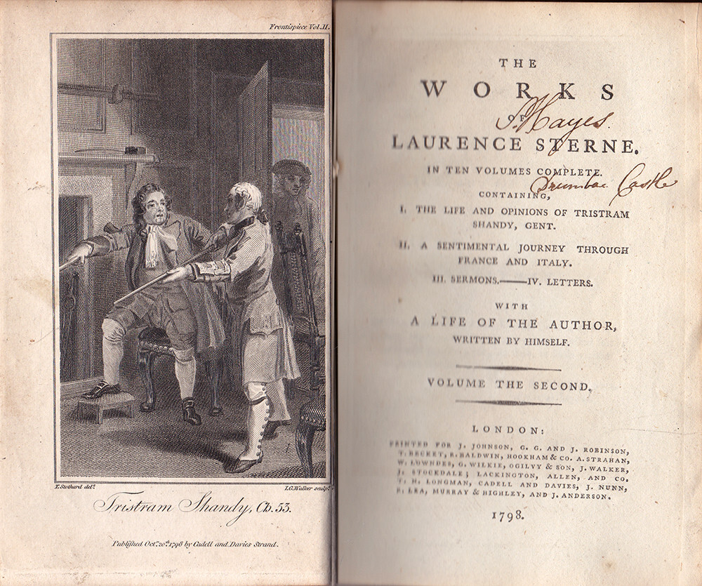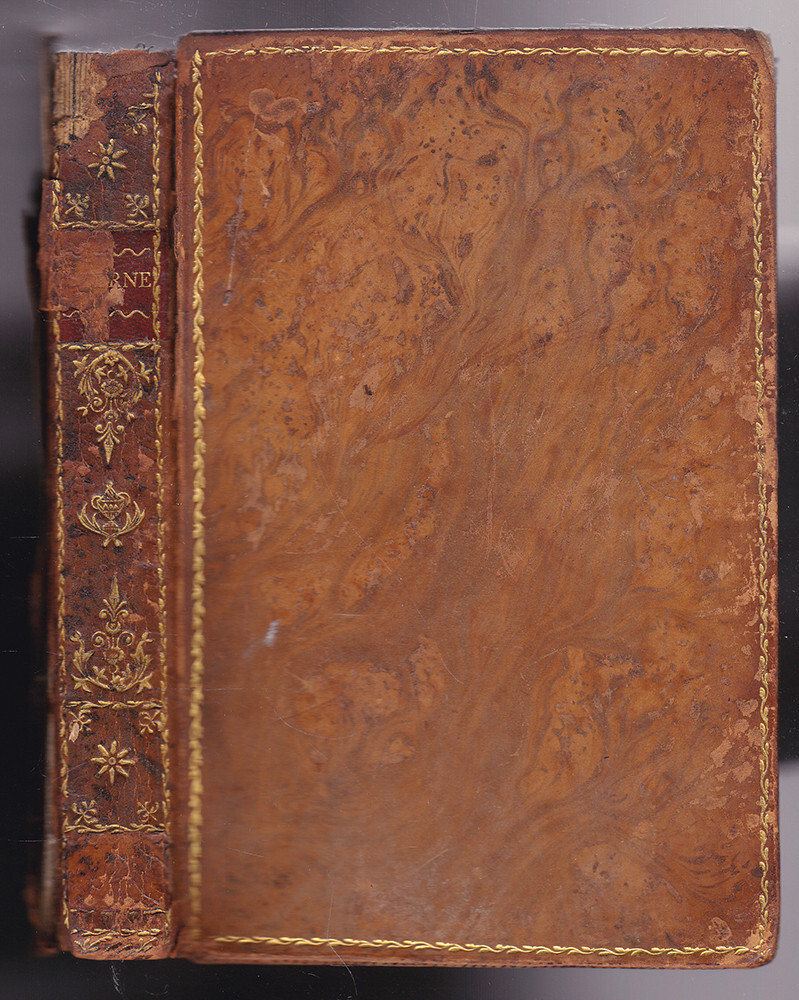 THE WORKS OF LAURENCE STERNE (IN 10 VOLUMES) VOLUME TWO (ONLY) THE LIFE AND OPINIONS OF TRISTAM SHANDY, GENTLEMAN 1798 Printed for J. Jonson, G.G. and J. Robinson, T. Becket, R. Baldwin, Hookham & Co., A Strahan, W. Lowndes, G. Wilke, Ogilvy & Son, J. Walker, J. Stockdale; Lackington, Allen and Co.; T. N. Longman, Cadell and Davies, J. Nunn, F. Lea, Murray and Highley, and J. Anderson. London, UK Bound in Leather, 307 pages This is just the second volume of Sterne's epic Tristam Shandy novel which I believe came in four volumes out of the 10-volume Works of Laurence Sterne. (Ignore the printed content on the title page below The Life and Opinions of Tristam Shandy, Gentleman; II, III, IV and A Life Of The Author are not in this book. A complete set from this time could run thousands. This late 18th century copy is quite scarce. Although both leather boards are still attached and the spine covering is nearly complete, both hinges are cracked, and the leather on the rear board is chipped. Textblock and interior good and stable. 4 3/4" x 7 1/8" x 1 1/8"
