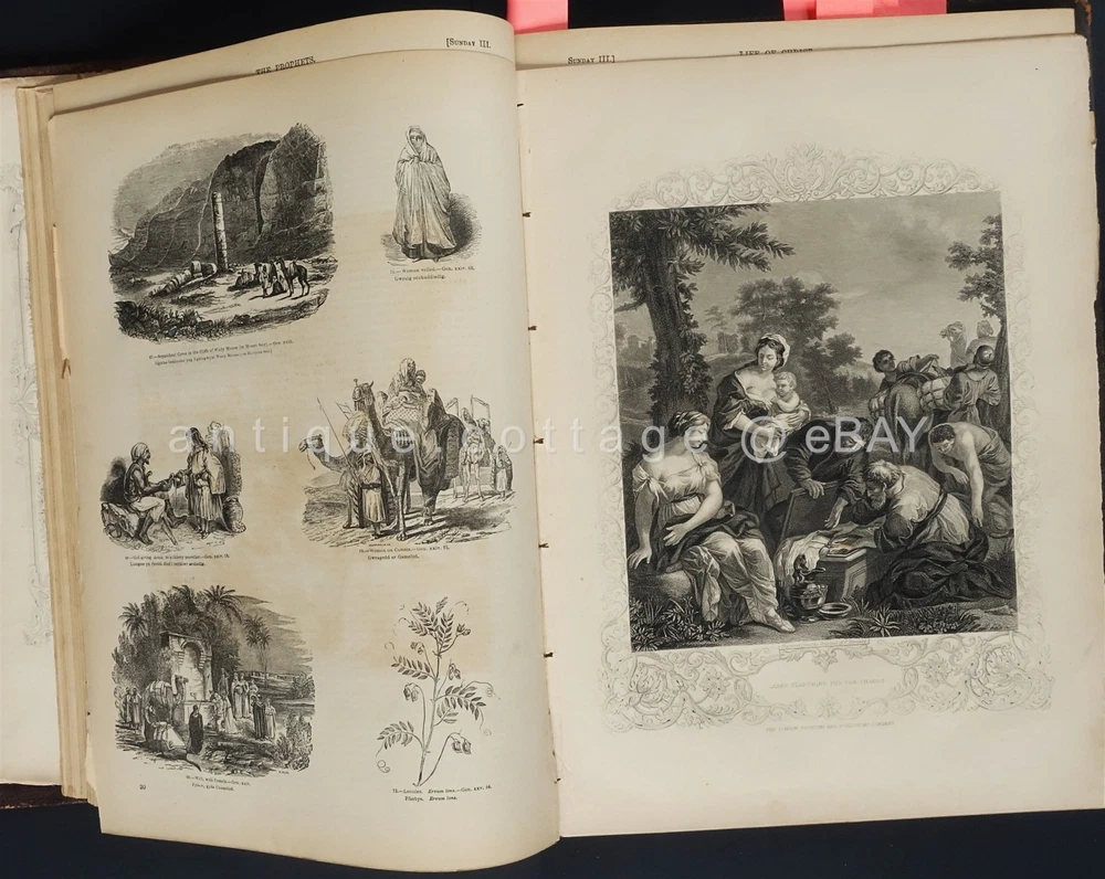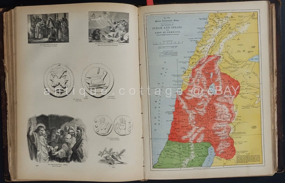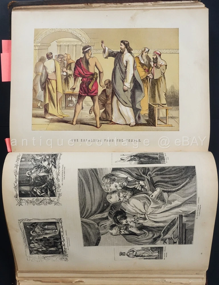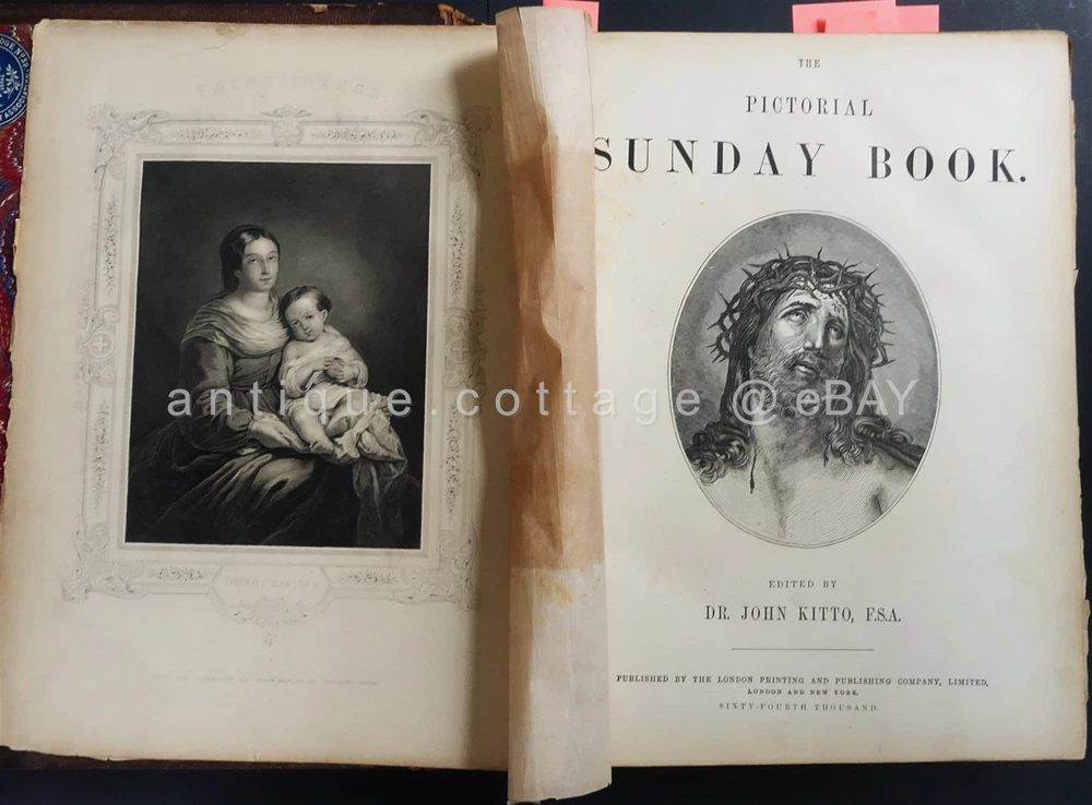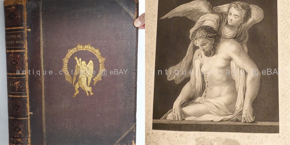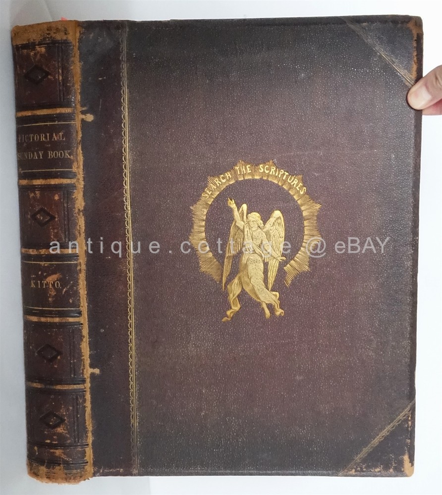 1800s antique BIBLE PICTORIAL SUNDAY BOOK kitto ENGRAVINGS holy land map life ch SCROLL DOWN for MORE PHOTOS in DESCRIPTION Click HERE to view or search ANTIQUE.COTTAGE listings. This listing is for the hardcover, leather over board book, measures a large 14"x10.25x1 7/8" thick with 516 pages. It is choc full of engravings. The type that I would expect that Gustave Dore may have contributed, those, in paging through the book, I hadn't seen his name, but didn't look the whole way through. Includes readings for bible history, life of Christ, geography of the Holy Land, Acts of the Apostles, and more. There are ALOT of illustrations throughout as this huge book is a pictorial book. Undated, circa 1880s. CLICK HERE to check out my antique BIBLE SHOPPE CLICK HERE to check out my antique BOOK SHOPPE _____________________________________ CONDITION : See listing description and photos; beautiful cover with antique wear. The book is separated from its cover at both the front and back hinges. Pages, overall are nice with some edge wear. first and last couple pages detached but included. A couple pages detaching from string binding. Nice book; other antique wear. - International buyers are responsible to pay VAT or other Taxes to their countries as required. - eBAY collects and remits sales tax on behalf of several states. If you are a dealer, you can write to eBay to file a form to become tax exempt. LOC: LOC2: FRONT.HALL.BENCH-BY.SUITCASE-KM Powered by SixBit's eCommerce Solution