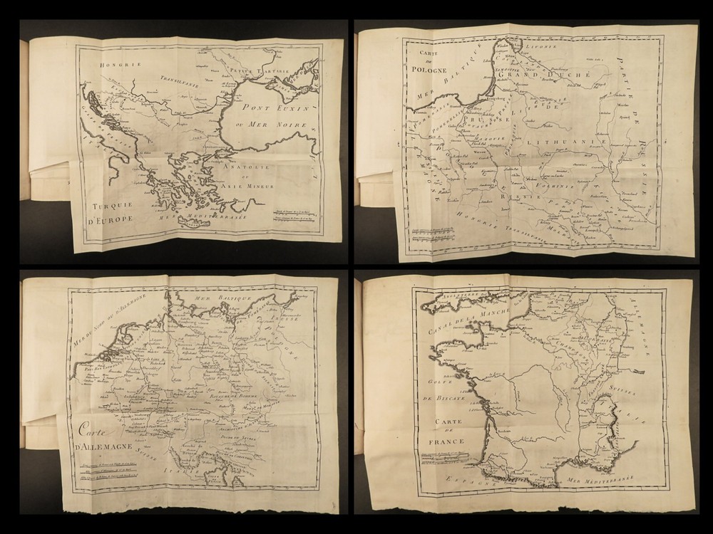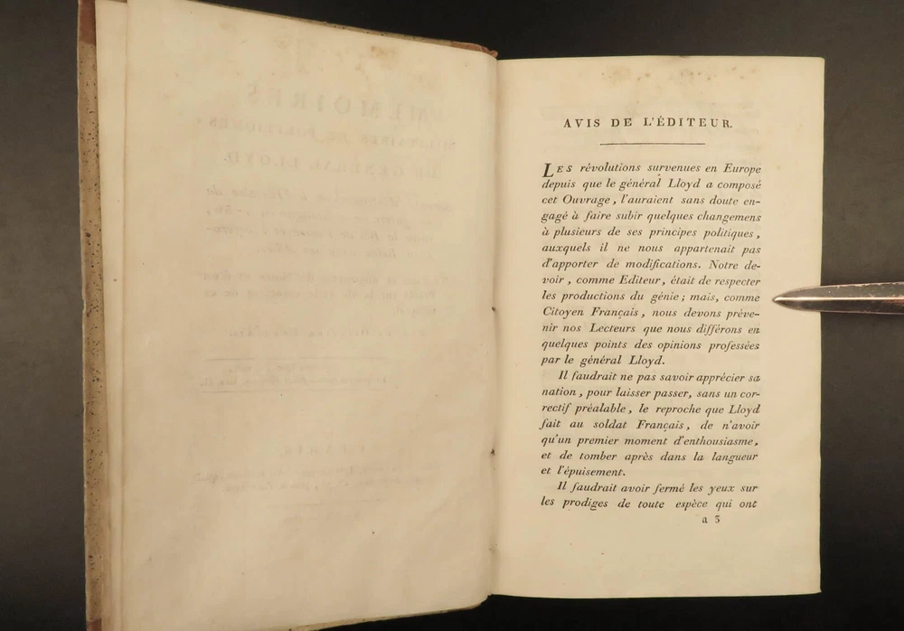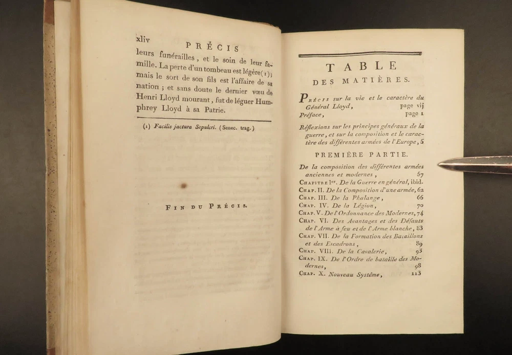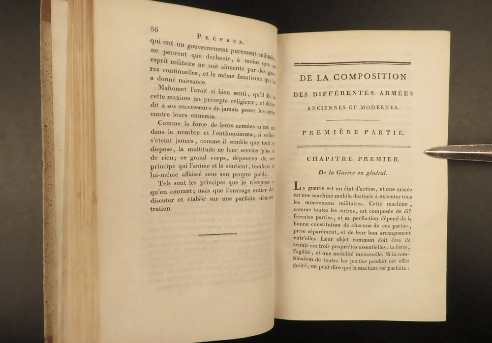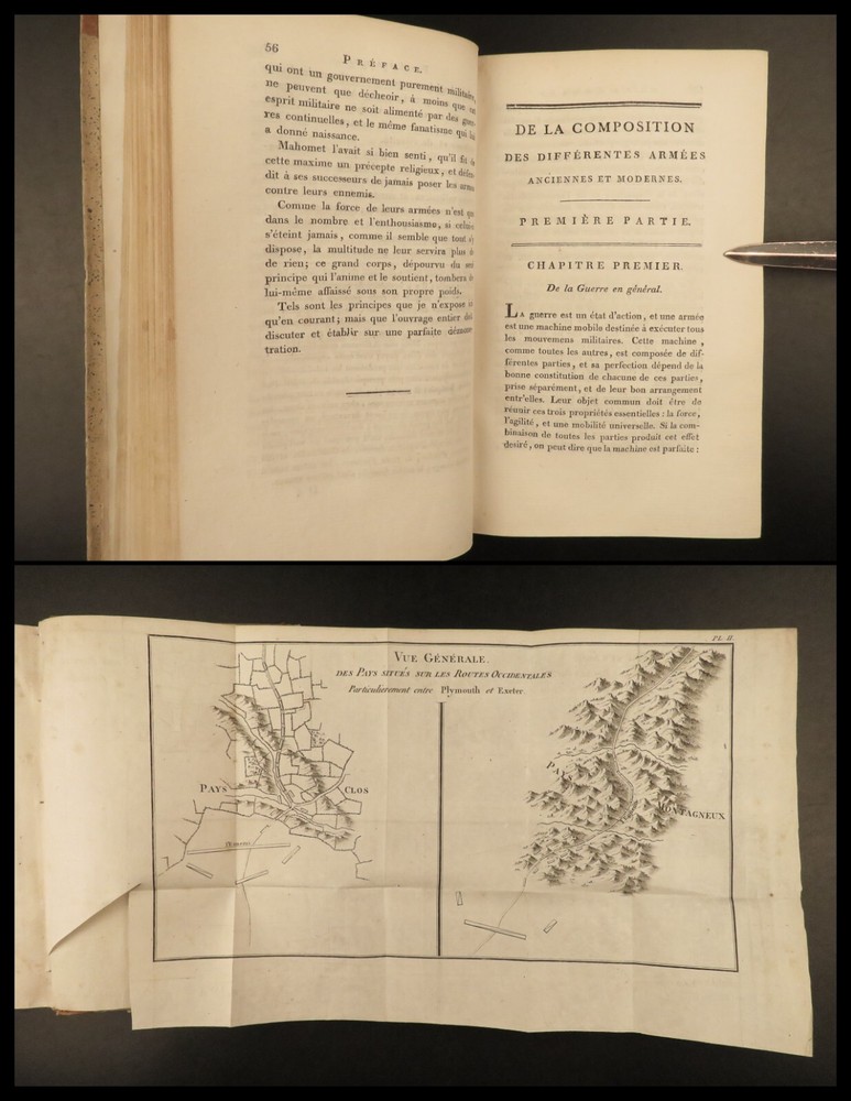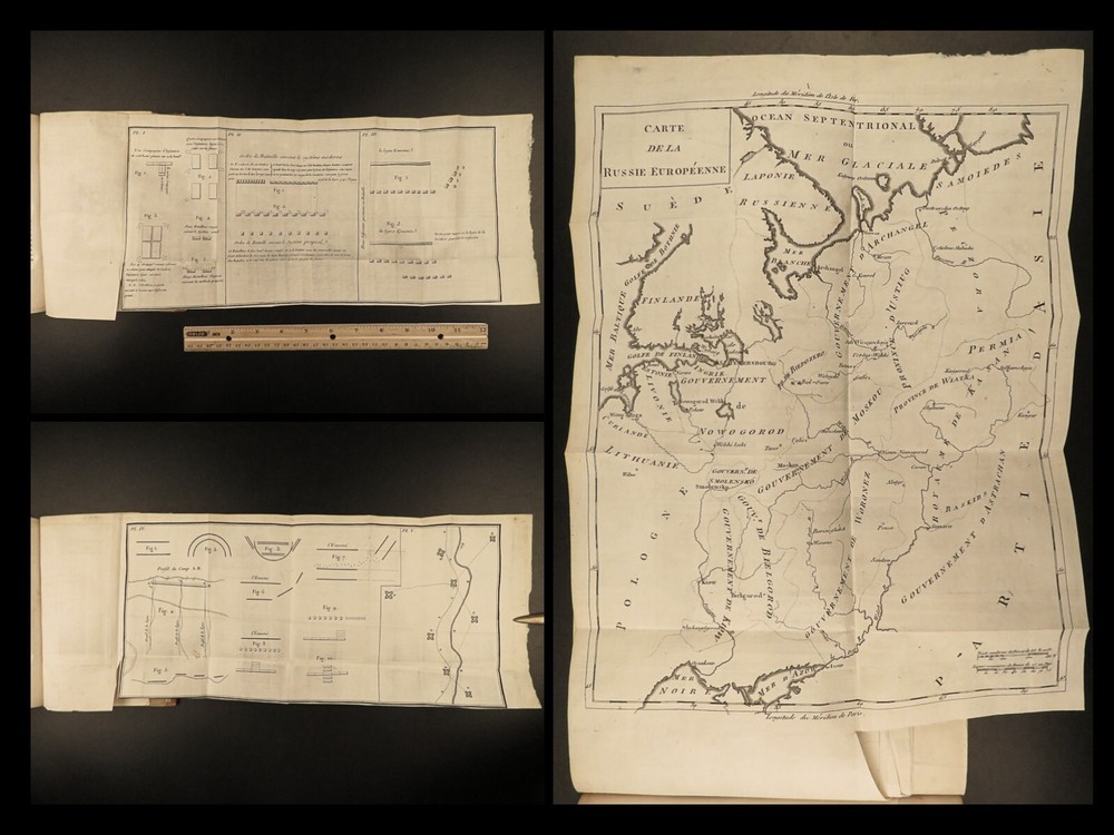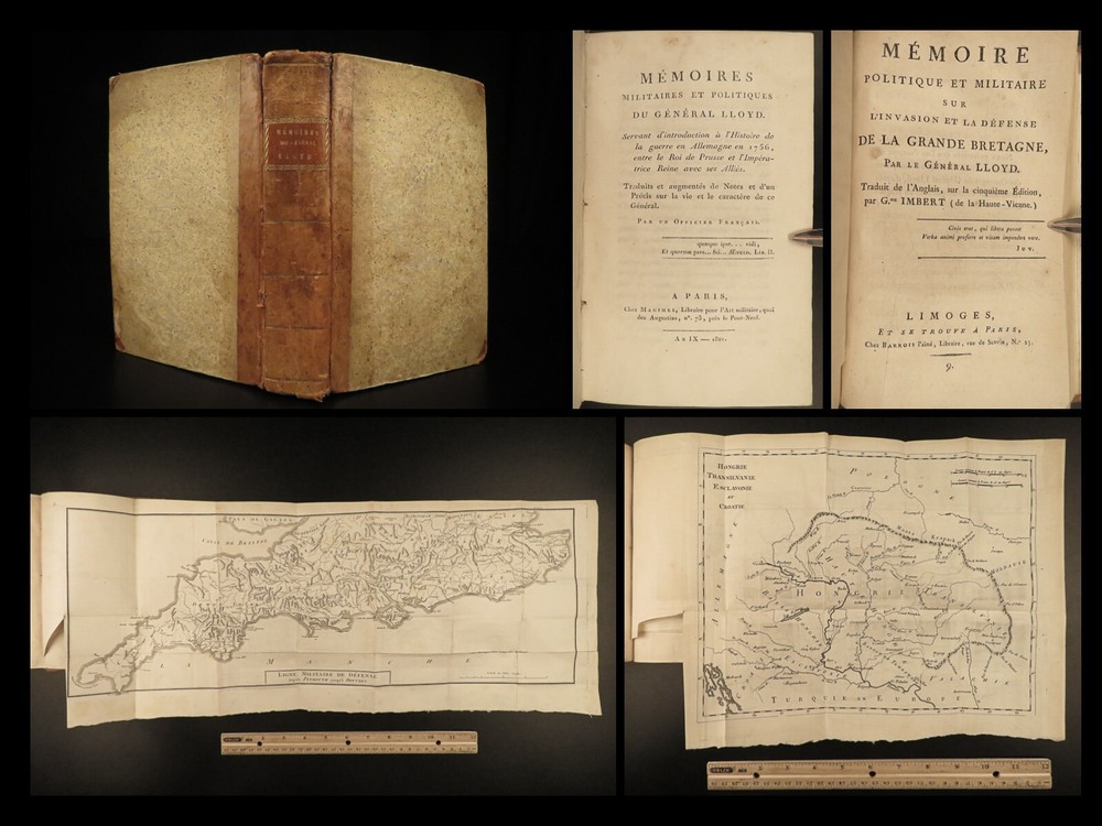 1801 MAPS Henry Lloyd War Memoirs Seven Years War Military Manual Prussia Henry Lloyd was an 18 th -century Welsh soldier known for his involvement in numerous European wars. Over his life, he fought with French and Austrian forces, Russian campaigns, and even fought for AND against Great Britain at different points. He wrote extensively on military theory and is known that George Washington even studied his books on the science of war. One of his books was “ History of the War in Germany ” – Lloyd’s most influential military book which became the standard for military instruction in the 18 th -century. It provided training on soldier organization, operation preparation, and the use of math and science in military planning. First written in 1766, this book was a response to his time in the Seven Years’ War. This early 19 th -century French edition of Lloyd’s ‘ History’ was published in Paris and given the title ‘ Military and Political Memoirs of Lloyd ’. Note the inclusion of impressive folding maps ! Item number: #20643 Price: $499 LLOYD, Henry H Mémoires militaires et politiques du général Lloyd : servant d'introduction à l'histoire de la guerre en Allemagne en 1756, entre le roi de Prusse et l'impératrice reine avec ses alliés Paris : Magimel, 1801. Details : · Collation: Complete with all pages o Memoirs – xlviii, 354 § 8 folding maps o Invasion and Defense of Great Britain – 38, 109, [1] § 2 folding maps · Language: French · Binding: Leather; tight and secure · Size : ~8in X 5.25in (20.5cm x 13.5cm) Our Guarantee: Very Fast. Very Safe. Free Shipping Worldwide. Customer satisfaction is our priority! Notify us with 7 days of receiving, and we will offer a full refund without reservation! 20643
