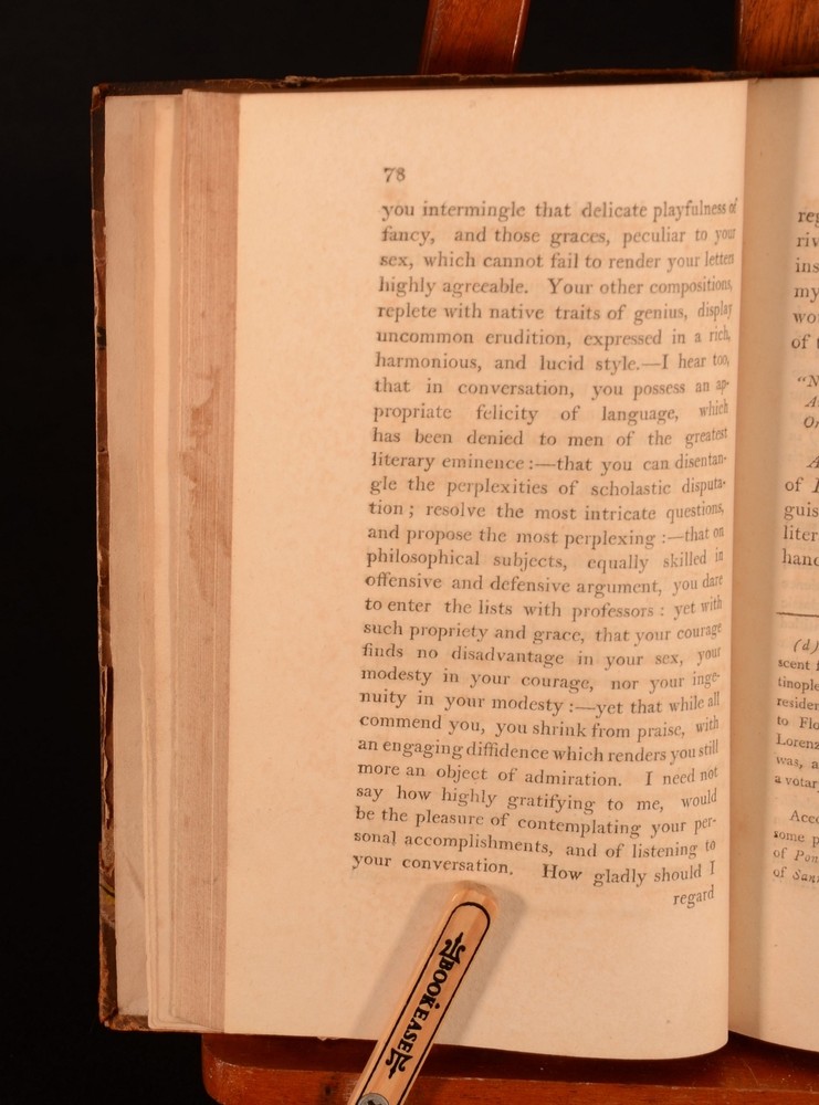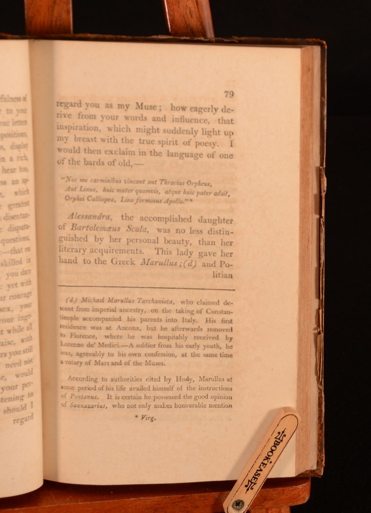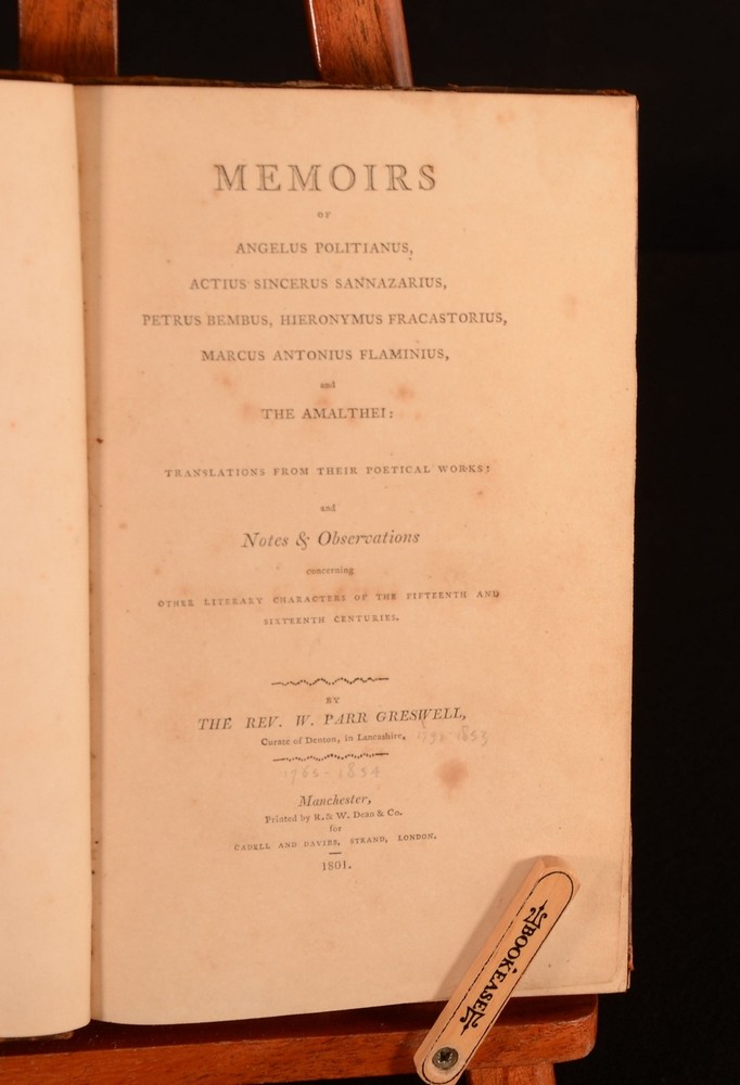 Click here to see our other books! Memoirs of Angelus Politianus, Actius Sincerus Sannazarius, Petrus Bembus, Hieronymus Fracastorius, Marcus Antonius Flaminius, and The Amalthei: Translation From Their Poetical Works: and Notes & Observations concerning Other Literary Characters of the Fifteenth and Sixteenth Centuries. Rev. W. Parr Greswell 1801 Cadell and Davies : Manchester 8.5" by 5" ii, 211pp SUMMARY A first edition volume of Rev. W. Parr Greswell featuring a collection of biographical works of poets from the sixteenth and seventeenth centuries. Leather Binding Overall Condition: Good This book weighs 0.5 KG when packed UK Postage: £ 3.99 US Postage: £ 15.99 EU Postage : £ 13.99 European Postage: £ 14.99 Asia Postage: £ 18.99 Worldwide Postage: £ 19.99 DESCRIPTION First edition. With biographical works on several 15th and 16th century poets, those being Angelus Politianus, Actius Sincerus Sannazarius, Petrus Bembus, Hieronymus Fracastorius, Marcus Antonius Flaminius, and The Amalthei. An exploration of the life and work of these notable poets and scholars. With notes and observations written by the then curate of Denton, Rev. W. Parr Greswell. CONDITION In a half calf binding. Externally, a trifle rubbed. Rubbing to the head and tail of the spine, joint and extremities. Large crack to the front joint. Rubbing to the front and rear boards. Label attached to the front board. Front and rear hinge are strained by firm. Handling mark and rubbing to the front and rear pastdown and endpapers. Internally, firmly bound. Pages are generally clean with light spots and handling marks to the pages. Overall Condition: Good GLOSSARY OF TERMS Overall Condition (Dustwrapper condition rating is shown after that for the book itself, where a dustwrapper is present) Fine - Very well preserved copy showing very little wear Very Good Indeed - Only one or two minor faults, really a very attractive copy Very Good - Quite a wide term meaning no major faults but probably several smaller ones often expected given the age of the book, but still a respectable copy Good - Meaning not very good. Some more serious faults as will be described in the condition report under 'condition' Good Only - Meaning one or more faults that could really do with repair Fair - As with good only above but with other faults leaving a compromised copy even after repair Poor - Really bad and possibly seriously incomplete. We only sell books in this condition where their rarity or value makes them attractive none the less. Major defects will be described. GUARANTEE We offer a full money back guarantee on our descriptions. Please ask for details and conditions. We prefer PAYPAL. If you pay via PAYPAL we will post the item off the same or the next working day with the postage you have selected. Please note we cannot accept USD cheques