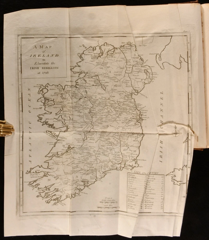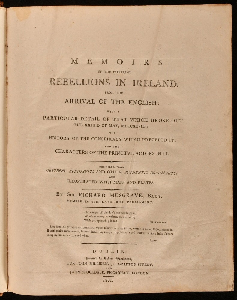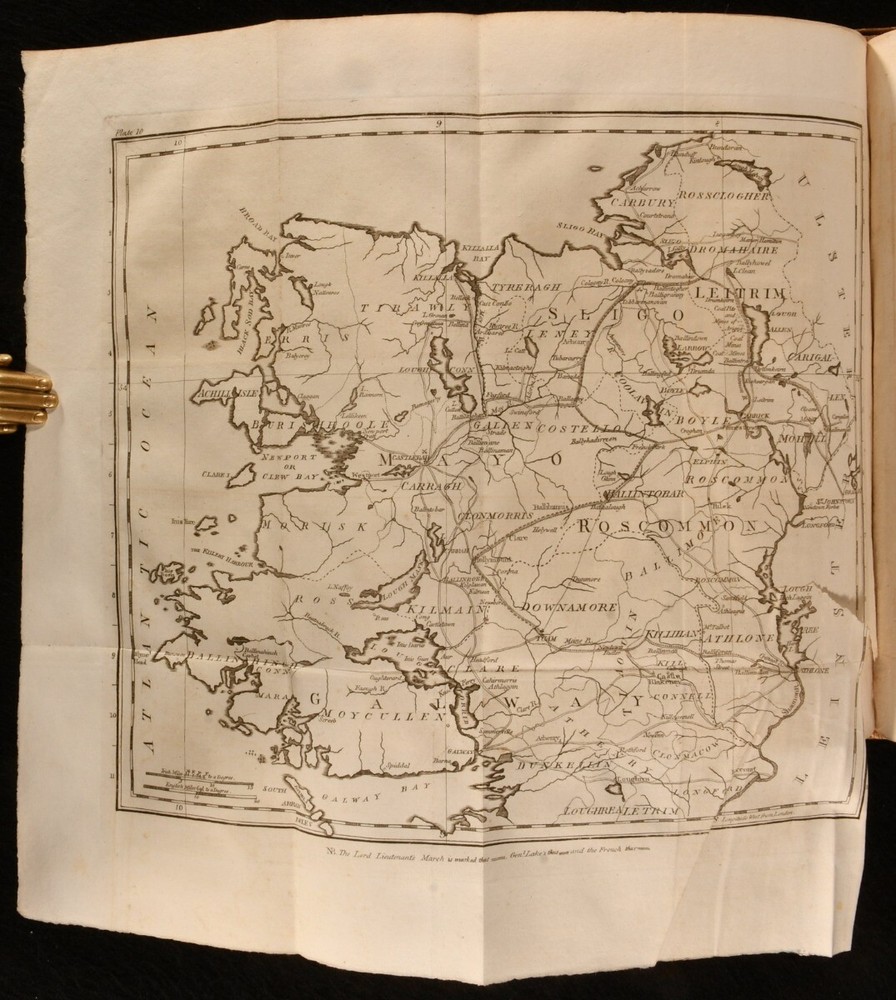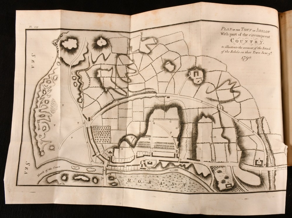 Click here to see our other books! Memoirs of the Different Rebellions in Ireland, From the Arrival of the English Sir Richard Musgrave 1801 By Robert Marchbank, for John Milken and John Stockdale : Dublin 11" by 9" x [3], 2-636 [1], 2-166 [9] pp SUMMARY An excellent copy of the first edition of politician Richard Musgrave's anticatholic account of late eighteenth century Irish history, an influential and controversial work. Illustrated with folding maps. First Edition,Folding Maps,Illustrated,Leather Binding Overall Condition: Very Good This book weighs 3 KG when packed UK Postage: £ 3.99 US Postage: £ 36.99 EU Postage : £ 25.99 European Postage: £ 27.99 Asia Postage: £ 47.99 Worldwide Postage: £ 69.99 DESCRIPTION The first edition of Sir Richard Musgrave's historical and political study of the history of Irish rebellions, with 'a Particular Detail of that which broke out the 23rd of May, 1798; the History of the Conspiracy which preceded it, and the Characters of the Principal Actors in it'. Illustrated with nine plates, eight of which are folding maps. Lacking plate VII 'A ground plan of Ross, and a map of the adjacent country', which should appear facing page 407. Retaining the original half title. With the armorial bookplate of James Martin to the front pastedown, and a contemporary owner's inscription to the verso of the half title. In 1894, the Dictionary of National Biography claimed the work was 'so steeped in anticatholic prejudice as to be almost worthless historically', terming him 'a man of considerable talent, warped by blind prejudice and savage party spirit'. CONDITION In a full calf binding. Externally, smart, with rubbing to boards, back strip and joints. Front hinge starting, with board holding firm. Armorial bookplate to front pastedown. Internally, firmly bound. Inscription to verso of half title. Pages generally clean and bright, with the odd spot. Closed tear to frontispiece folding map. Overall Condition: Very Good GLOSSARY OF TERMS Overall Condition (Dustwrapper condition rating is shown after that for the book itself, where a dustwrapper is present) Fine - Very well preserved copy showing very little wear Very Good Indeed - Only one or two minor faults, really a very attractive copy Very Good - Quite a wide term meaning no major faults but probably several smaller ones often expected given the age of the book, but still a respectable copy Good - Meaning not very good. Some more serious faults as will be described in the condition report under 'condition' Good Only - Meaning one or more faults that could really do with repair Fair - As with good only above but with other faults leaving a compromised copy even after repair Poor - Really bad and possibly seriously incomplete. We only sell books in this condition where their rarity or value makes them attractive none the less. Major defects will be described. GUARANTEE We offer a full money back guarantee on our descriptions. Please ask for details and conditions. We prefer PAYPAL. If you pay via PAYPAL we will post the item off the same or the next working day with the postage you have selected. Please note we cannot accept USD cheques