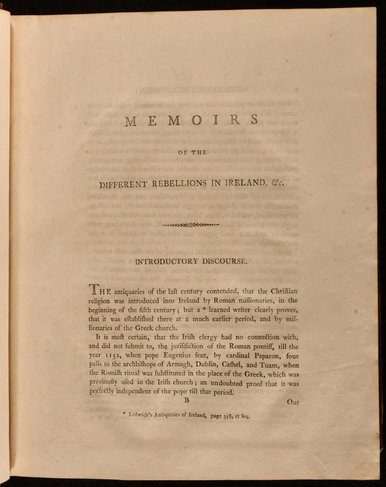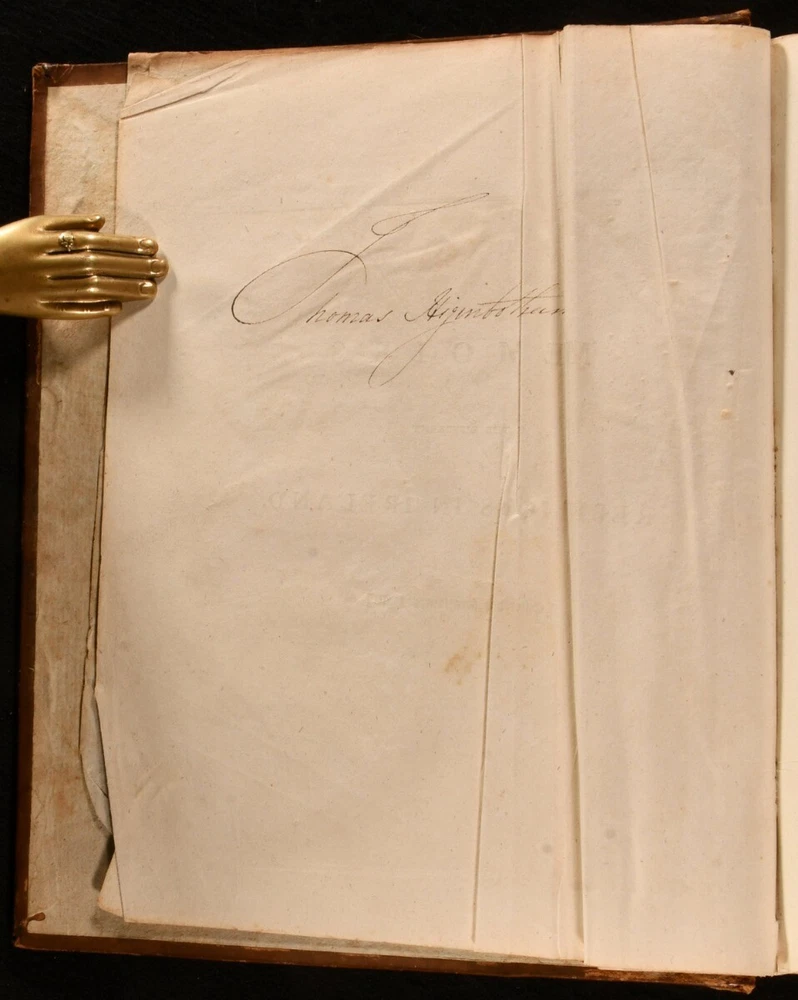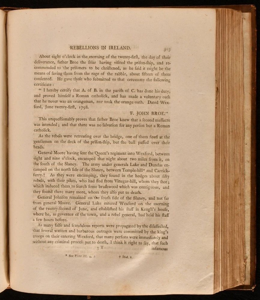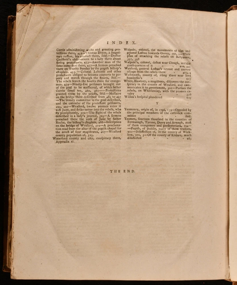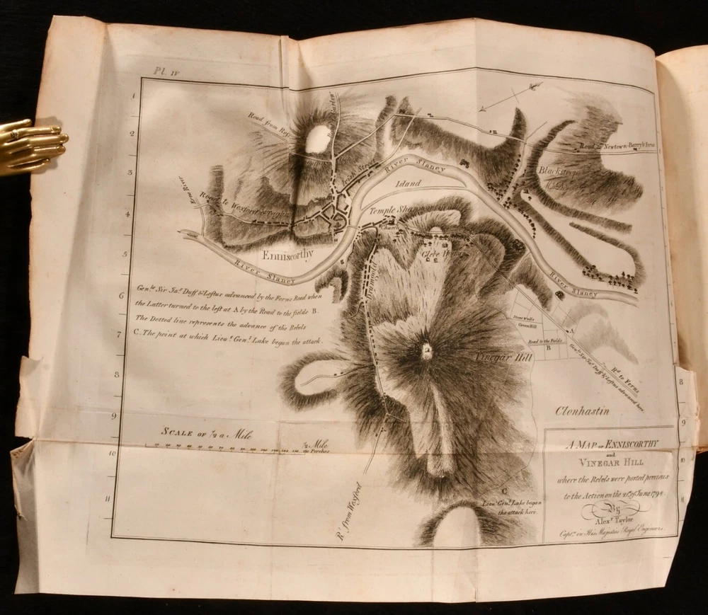 Click here to see our other books! Memoirs of the Different Rebellions in Ireland, From the Arrival of the English Sir Richard Musgrave 1801 By Robert Marchbank, for John Milken and John Stockdale : Dublin 11" by 9" x [3], 2-636 [1], 2-166 [9] pp SUMMARY An excellent copy of the first edition of politician Richard Musgrave's anticatholic account of late eighteenth century Irish history, an influential and controversial work. Illustrated with folding maps. First Edition,Folding Maps,Illustrated,Leather Binding Overall Condition: Very Good This book weighs 3 KG when packed UK Postage: £ 3.99 US Postage: £ 36.99 EU Postage : £ 25.99 European Postage: £ 27.99 Asia Postage: £ 47.99 Worldwide Postage: £ 69.99 DESCRIPTION The first edition of Sir Richard Musgrave's historical and political study of the history of Irish rebellions, with 'a Particular Detail of that which broke out the 23rd of May, 1798; the History of the Conspiracy which preceded it, and the Characters of the Principal Actors in it'. Illustrated with nine plates, eight of which are folding maps. Lacking plate VII 'A ground plan of Ross, and a map of the adjacent country', which should appear facing page 407. Retaining the original half title. With the armorial bookplate of James Martin to the front pastedown, and a contemporary owner's inscription to the verso of the half title. In 1894, the Dictionary of National Biography claimed the work was 'so steeped in anticatholic prejudice as to be almost worthless historically', terming him 'a man of considerable talent, warped by blind prejudice and savage party spirit'. CONDITION In a full calf binding. Externally, smart, with rubbing to boards, back strip and joints. Front hinge starting, with board holding firm. Armorial bookplate to front pastedown. Internally, firmly bound. Inscription to verso of half title. Pages generally clean and bright, with the odd spot. Closed tear to frontispiece folding map. Overall Condition: Very Good GLOSSARY OF TERMS Overall Condition (Dustwrapper condition rating is shown after that for the book itself, where a dustwrapper is present) Fine - Very well preserved copy showing very little wear Very Good Indeed - Only one or two minor faults, really a very attractive copy Very Good - Quite a wide term meaning no major faults but probably several smaller ones often expected given the age of the book, but still a respectable copy Good - Meaning not very good. Some more serious faults as will be described in the condition report under 'condition' Good Only - Meaning one or more faults that could really do with repair Fair - As with good only above but with other faults leaving a compromised copy even after repair Poor - Really bad and possibly seriously incomplete. We only sell books in this condition where their rarity or value makes them attractive none the less. Major defects will be described. GUARANTEE We offer a full money back guarantee on our descriptions. Please ask for details and conditions. We prefer PAYPAL. If you pay via PAYPAL we will post the item off the same or the next working day with the postage you have selected. Please note we cannot accept USD cheques