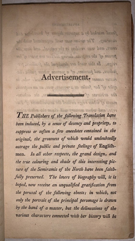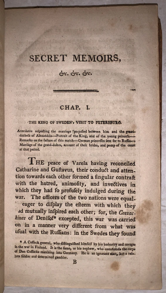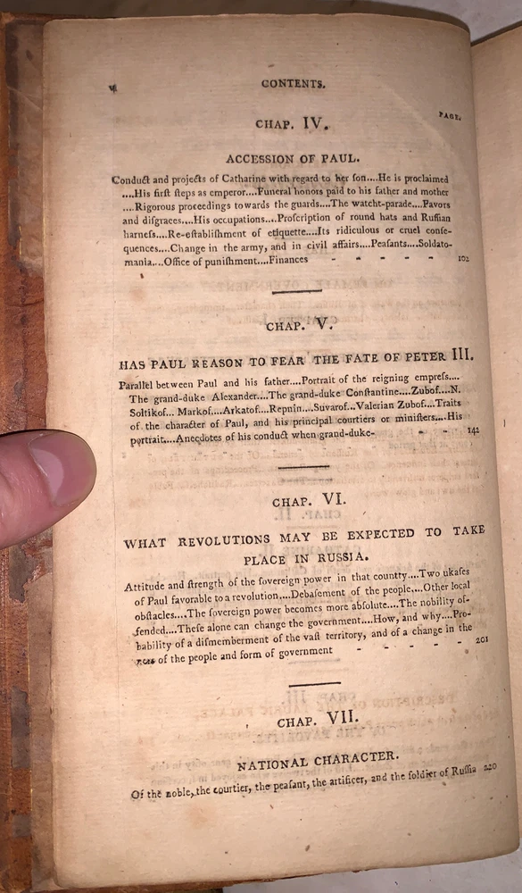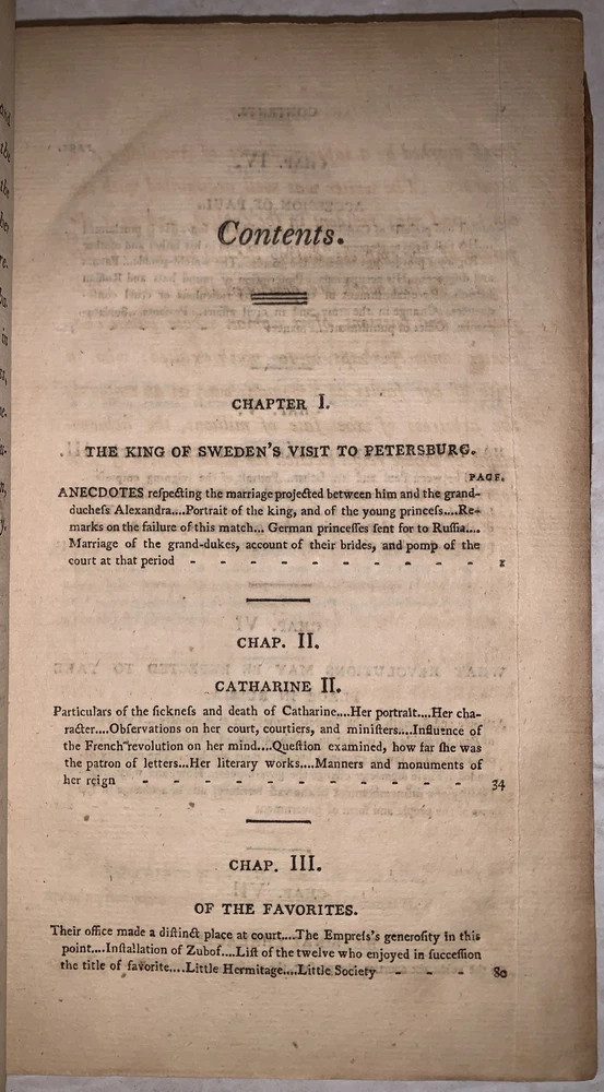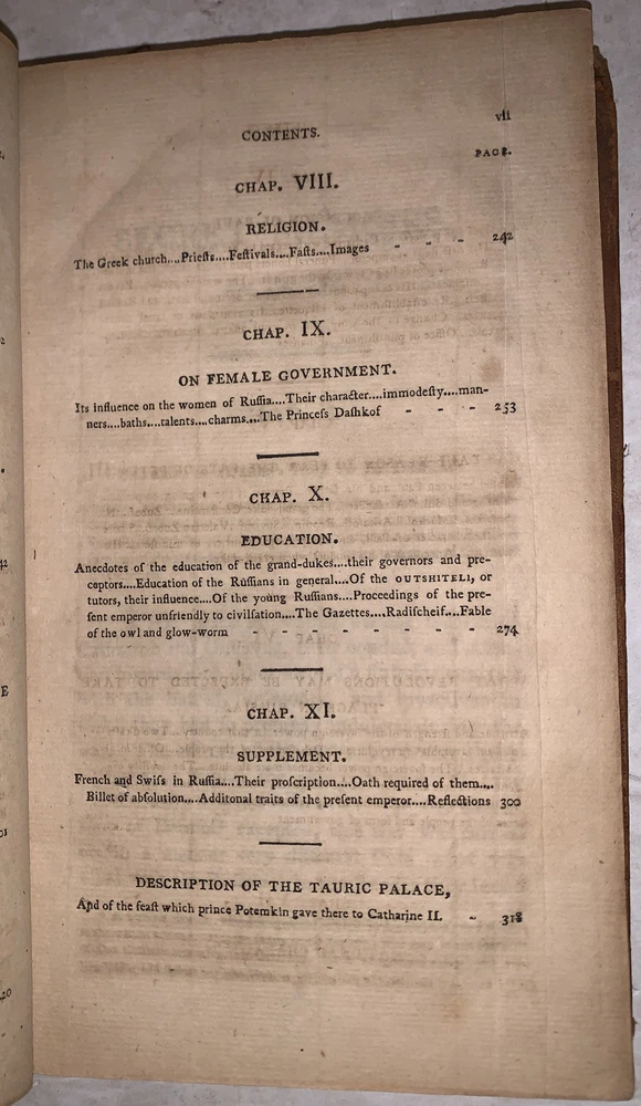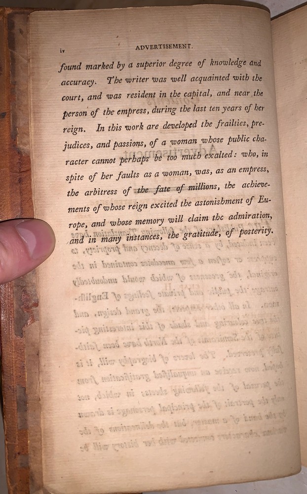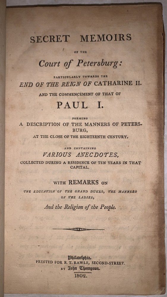 [Masson, Charles Francois Philibert] Secret memoirs of the Court of Petersburg: particularly towards the end of the reign of Catharine II. and the commencement of that of Paul I. Forming a Description of the Manners of Petersburg at the Close of the Eighteenth Century - [Complete in 2 vols] .and Containing Various Anecdotes, Collected During a Residence of Ten Years in that Capital. Together with Remarks on the Education of the Grand-Dukes, the Manners of the Ladies, and the Religion of the People Philadelphia: Printed for R. T. Rawle 1802 First American Edition Octavo, vii, 322 pages, bound in period full leather. Some rubbing and wear, lacks spine label, hinges cracked, foxing and discoloration, else in good + condition. If you have any questions feel free to ask and don't forget to check out my other listings.