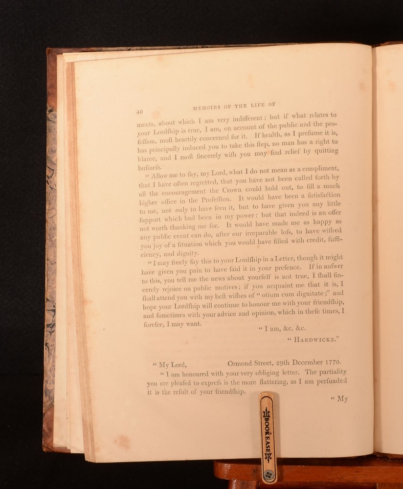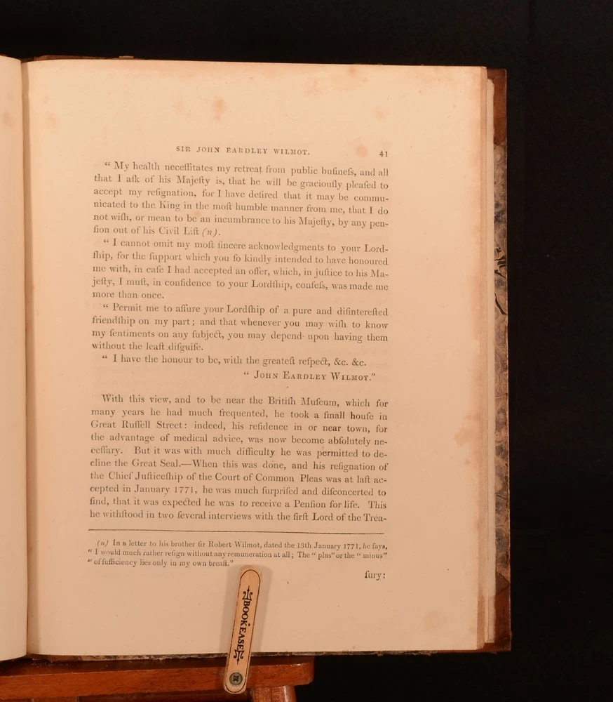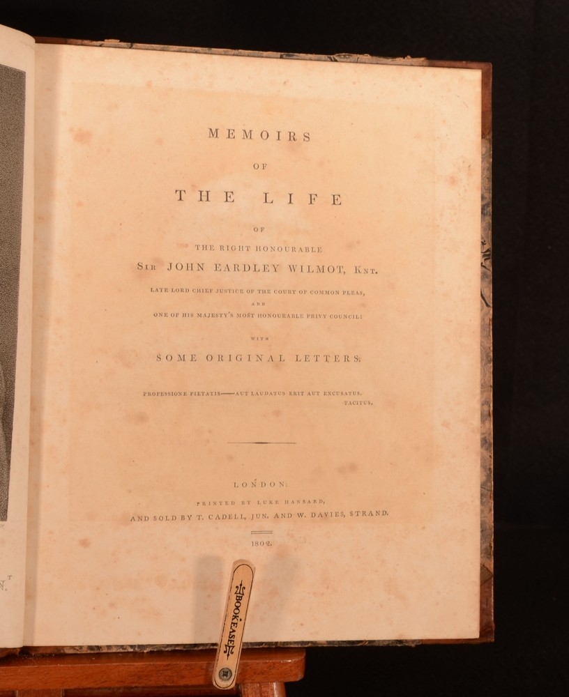 Click here to see our other books! Memoirs of the Life of the Right Honourable Sir John Eardley Wilmot, Knt. Late Lord Chief Justice of the Court of Commons Pleas, and One of His Majesty's Most Honourable Privy Council: With Some Original Letters John Eardley Wilmot 1802 T Cadell, Jun, and W. Davies : London 11" by 9" [6pp], 77pp SUMMARY The first edition of this enlightening biography of the judge John Eardley Wilmot, written by his son, with a frontispiece portrait of Wilmot. First Edition,Leather Binding Overall Condition: Very Good This book weighs 0.75 KG when packed UK Postage: £ 3.99 US Postage: £ 19.99 EU Postage : £ 15.99 European Postage: £ 16.99 Asia Postage: £ 21.99 Worldwide Postage: £ 25.99 DESCRIPTION The first edition of this work. An interesting memoir of the English judge John Eardley Wilmot, who served as the Chief Justice of the Common Pleas from 1766 to 1771. He was offered the position of Lord Chancellor twice in his career, and both times turned it down. This work was written by Wilmot's son, also named John Wilmot. He was a lawyer and politician who sat in the House of Commons from 1776 to 1796. He also wrote ' A Treatise on the Laws and Customs of England', 'The Life of the Rev. John Hough, D.D', and 'An Historical Review of the Commission relative to the American Loyalists '. With a frontispiece. Collated from Copac from copies held at Cambridge and Oxford University, complete. CONDITION In a half calf binding with marbled paper to the boards. Externally, with slight rubbing to the boards and spine. Light bumping to the extremities. Front hinge is starting but firm. Internally, firmly bound. Pages are bright and clean. Overall Condition: Very Good GLOSSARY OF TERMS Overall Condition (Dustwrapper condition rating is shown after that for the book itself, where a dustwrapper is present) Fine - Very well preserved copy showing very little wear Very Good Indeed - Only one or two minor faults, really a very attractive copy Very Good - Quite a wide term meaning no major faults but probably several smaller ones often expected given the age of the book, but still a respectable copy Good - Meaning not very good. Some more serious faults as will be described in the condition report under 'condition' Good Only - Meaning one or more faults that could really do with repair Fair - As with good only above but with other faults leaving a compromised copy even after repair Poor - Really bad and possibly seriously incomplete. We only sell books in this condition where their rarity or value makes them attractive none the less. Major defects will be described. GUARANTEE We offer a full money back guarantee on our descriptions. Please ask for details and conditions. We prefer PAYPAL. If you pay via PAYPAL we will post the item off the same or the next working day with the postage you have selected. Please note we cannot accept USD cheques